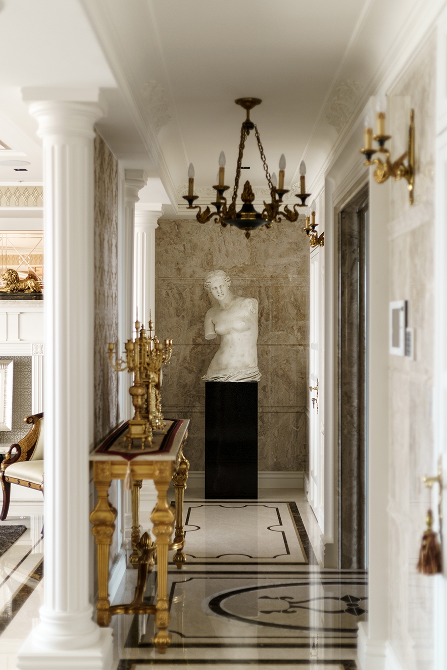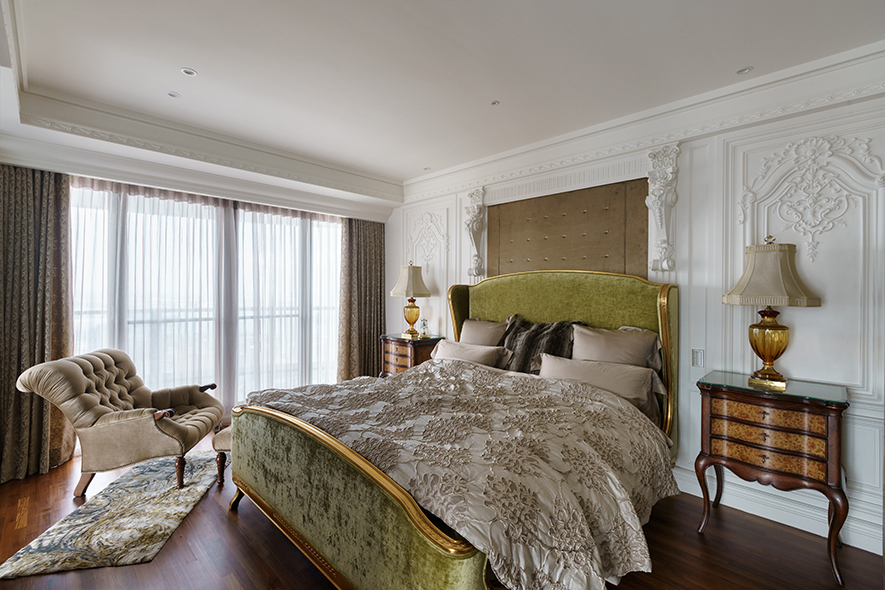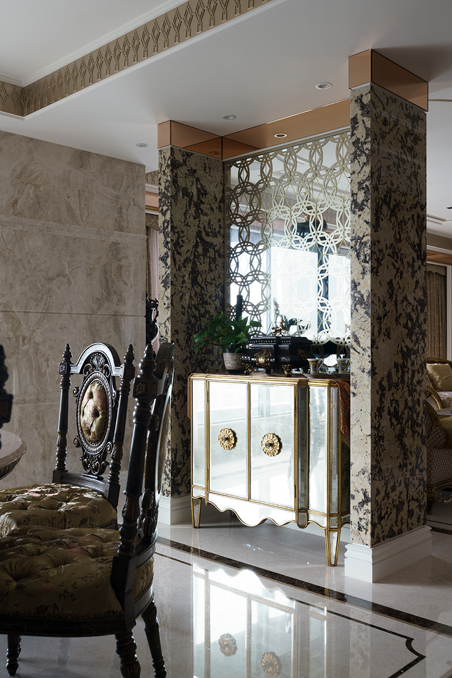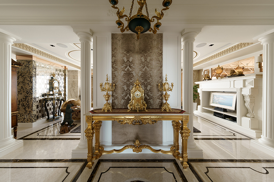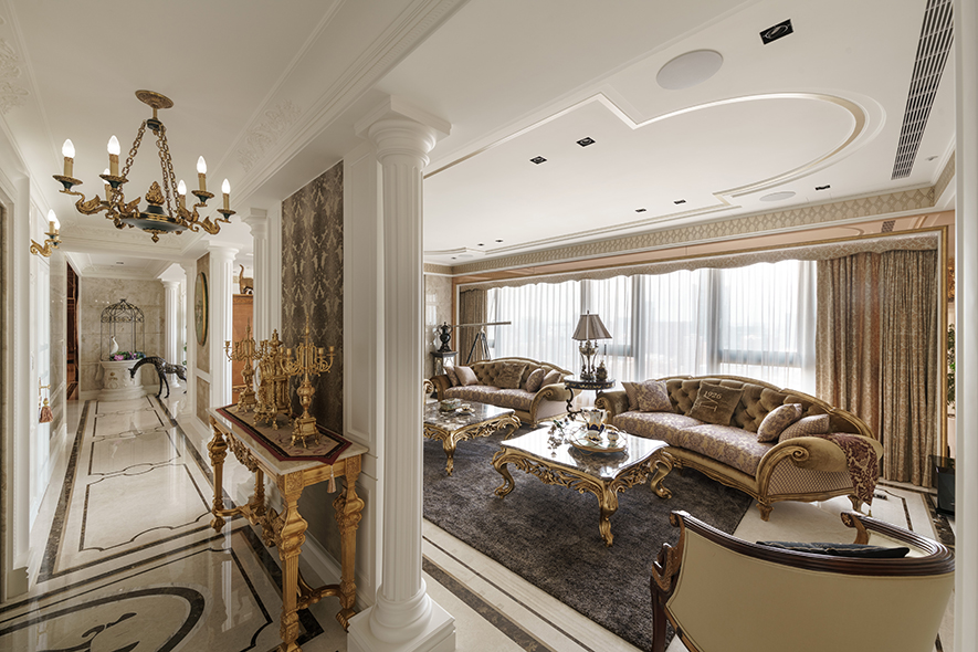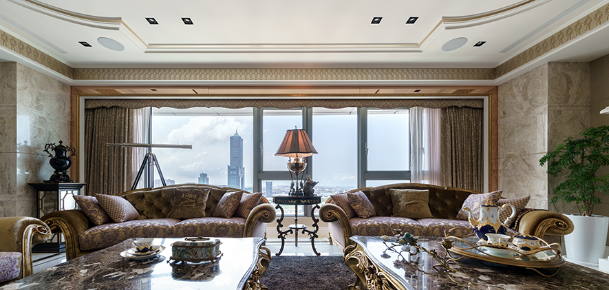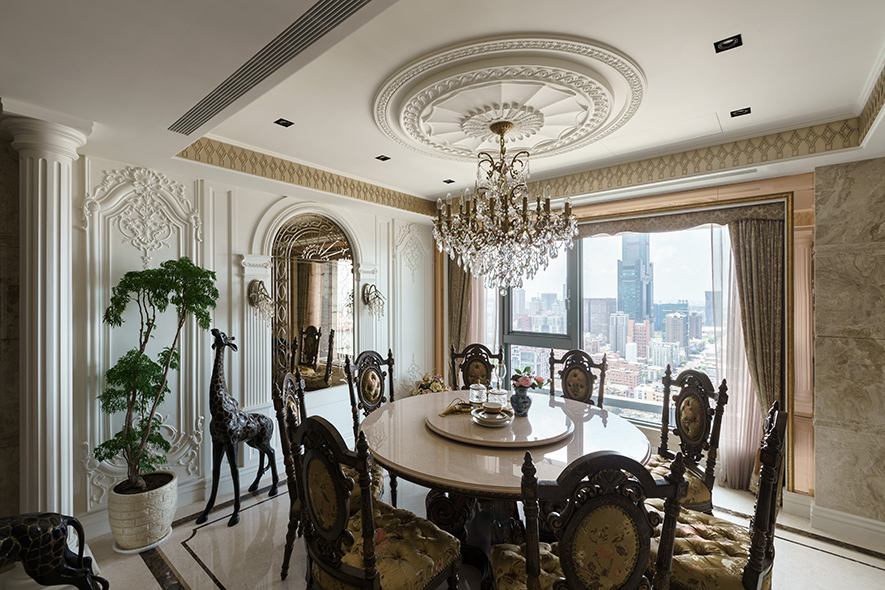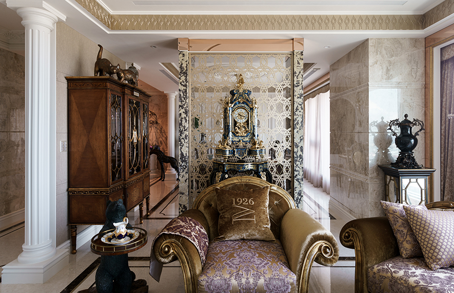 業主希望規劃成為私人招待會所與個人休憩渡假使用,空間中擺放許多收藏的骨董及老件家具,為搭配設計上用明亮純色系為基礎,以線板勾勒細節,襯托貴氣的收藏。