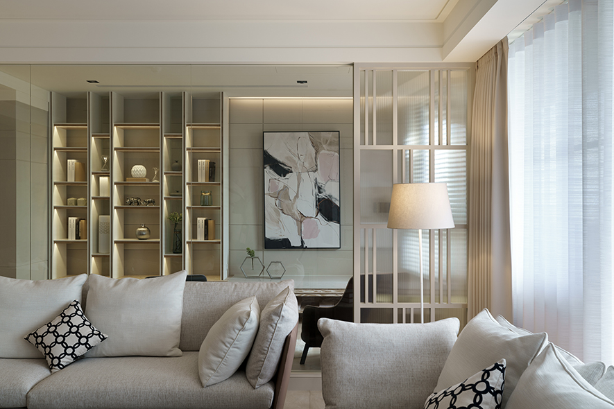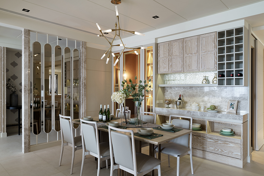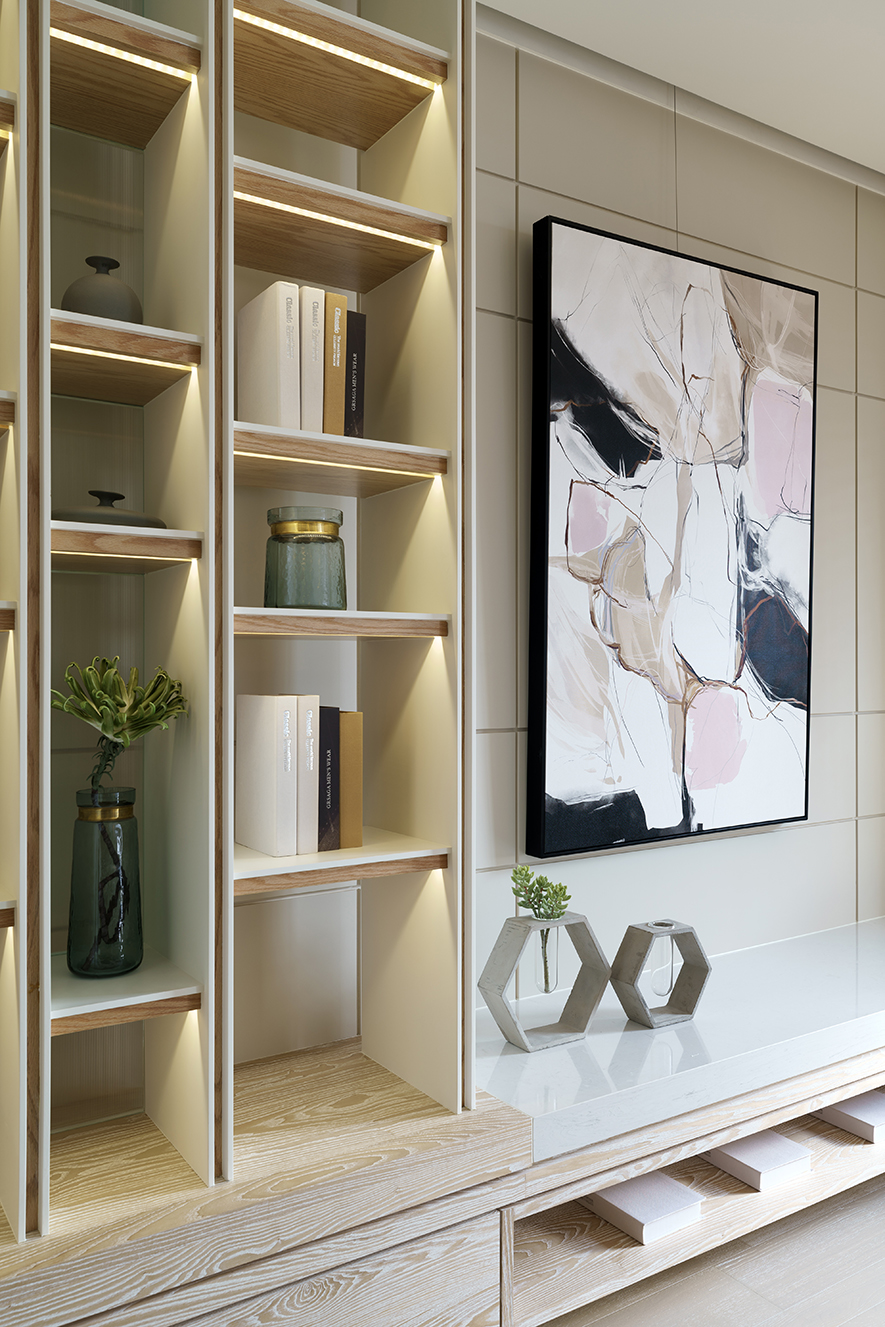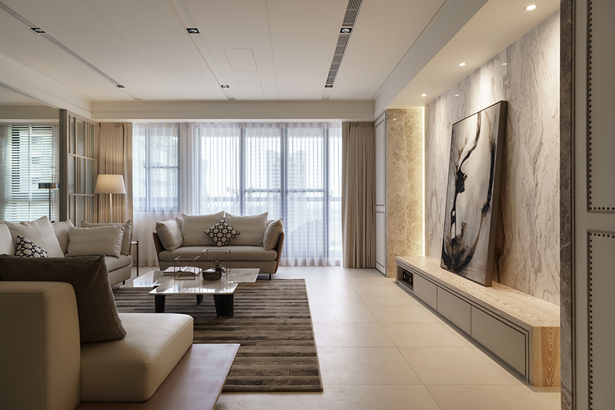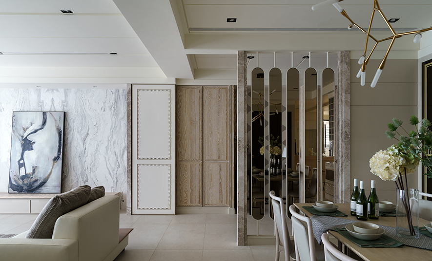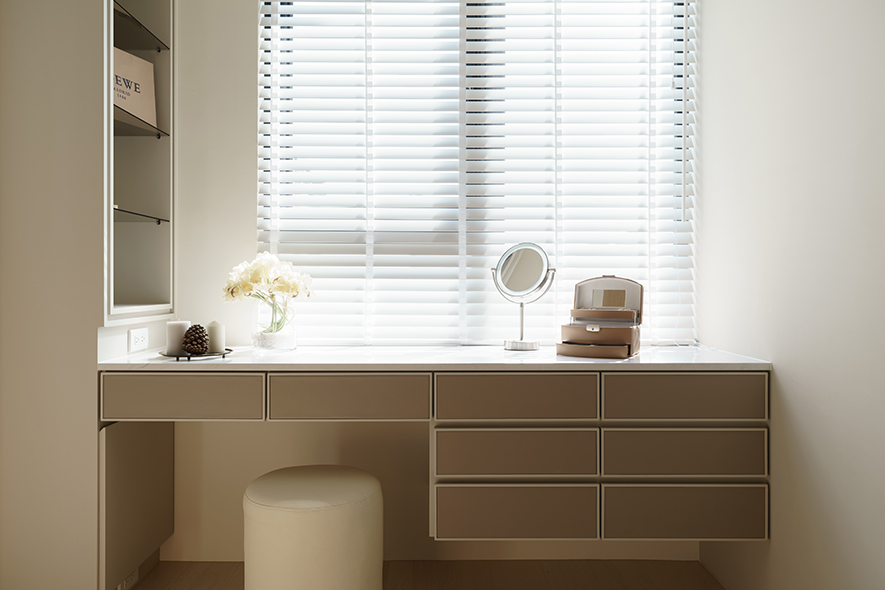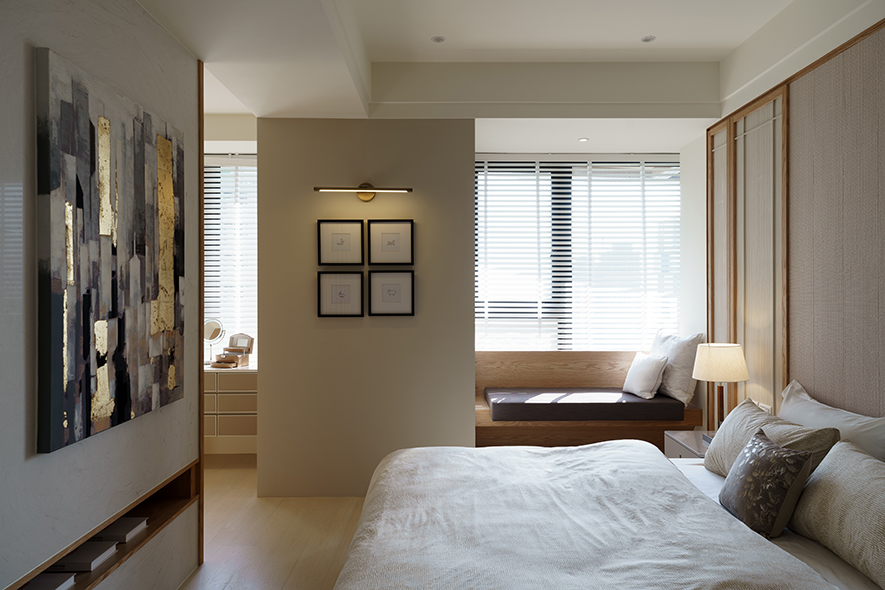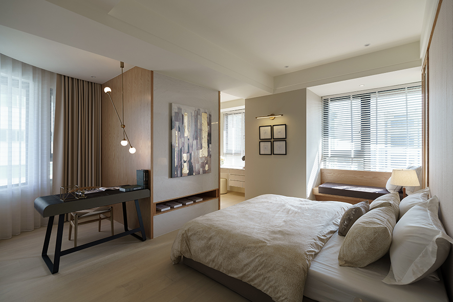 整體設計以明亮潔淨的白色為主調,在細節處注入暖調色系,搭配木皮紋路加工刷白處理,視覺及觸覺能感受木紋的溫潤、自然之美。設計者針對燈光安排別有用心,光與影的編排,將細節之處點綴於無形,細膩而雋永。