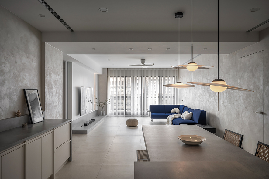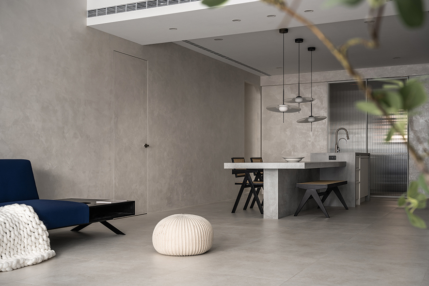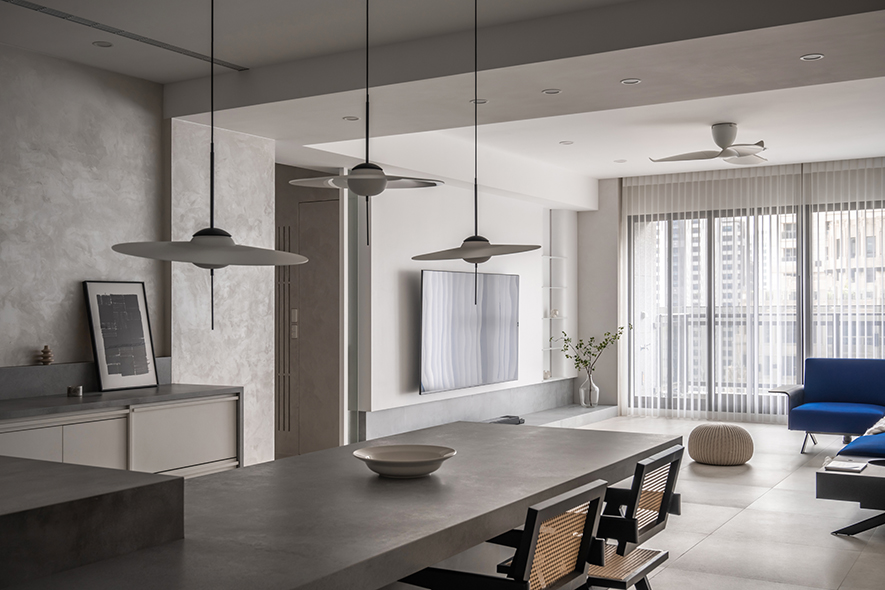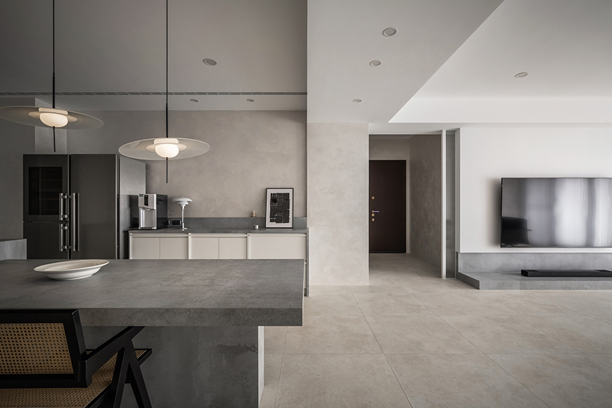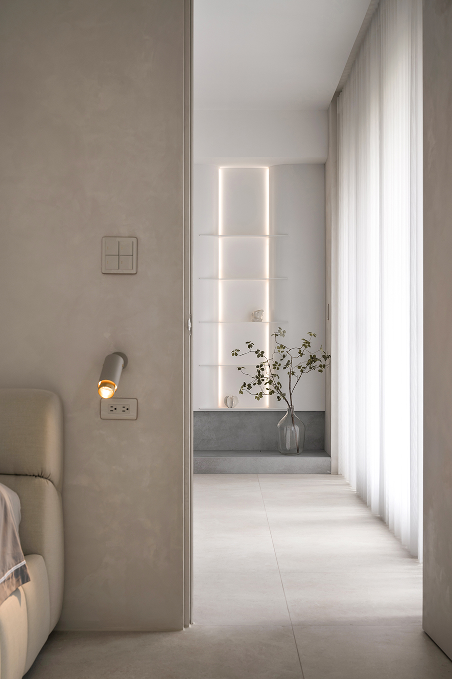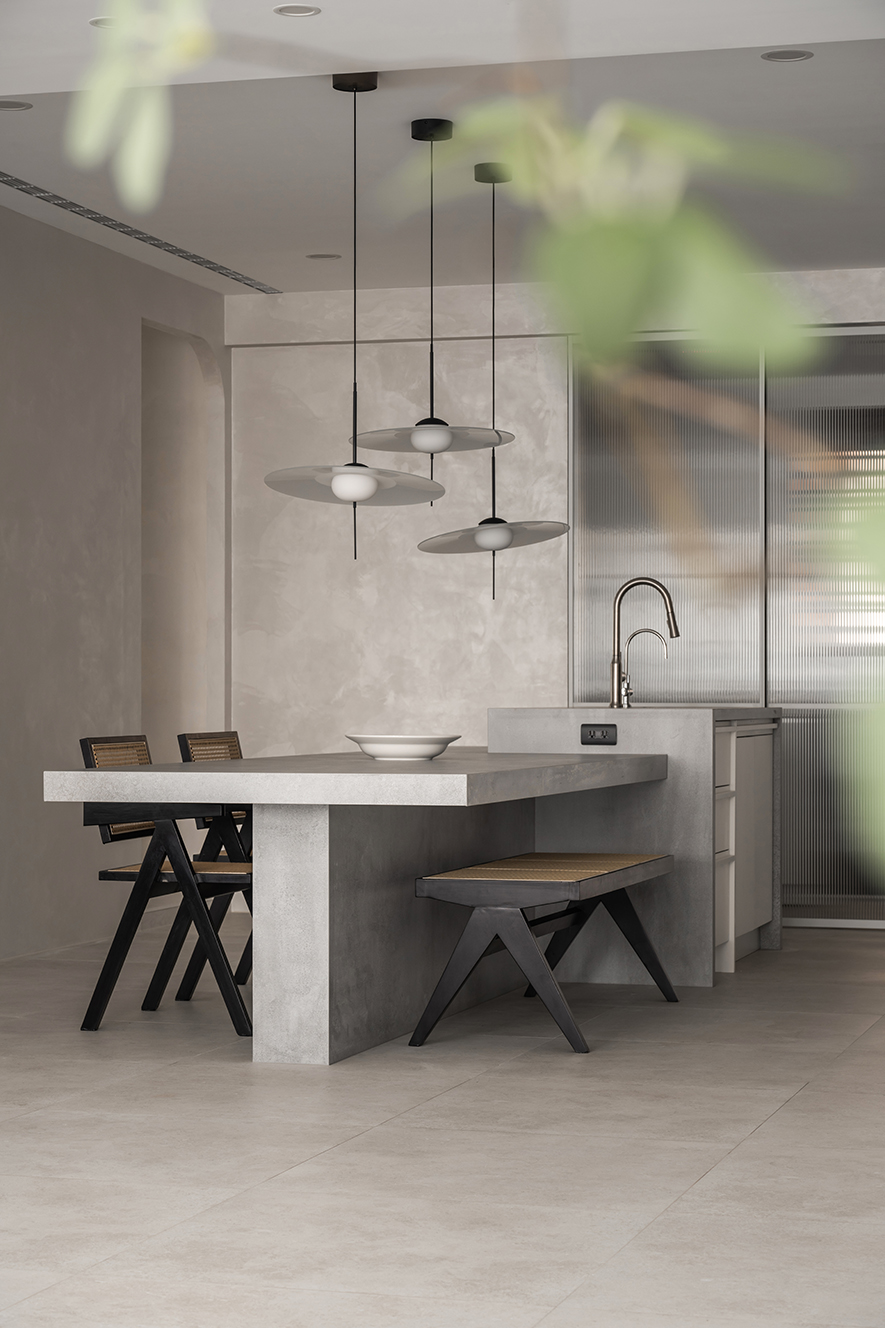 米白與淺灰交織而成的簡靜質地,在日光浸潤下,緩緩流動著斑駁詩意,於心裡泛起陣陣漣漪,彷彿按下時間的暫停格,消融瑣碎日常積累的紛雜心緒,接住疲於奔走的身心,於此獲得一隅安謐。