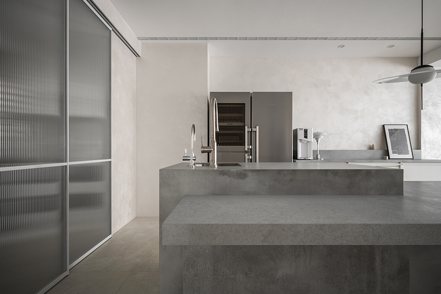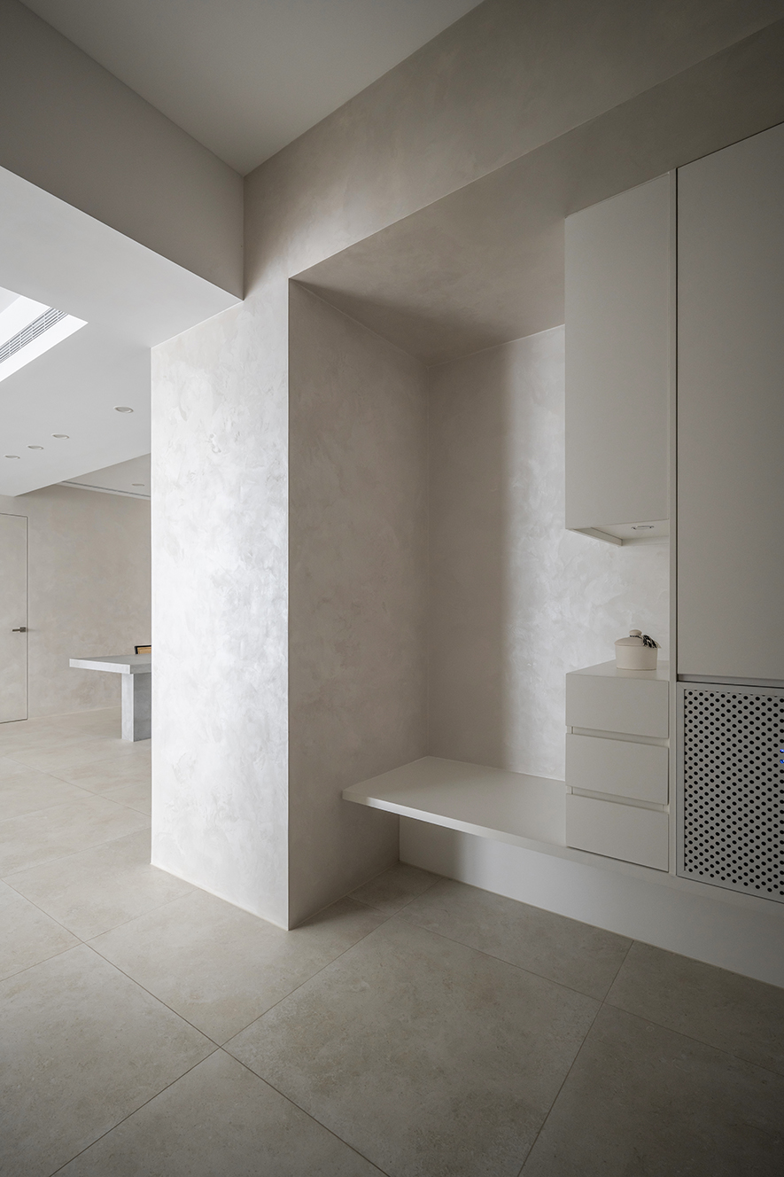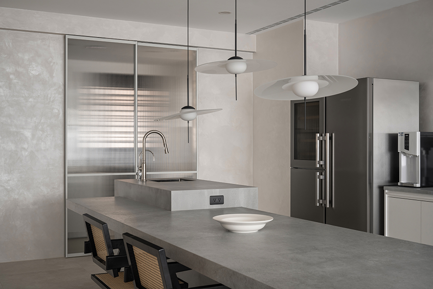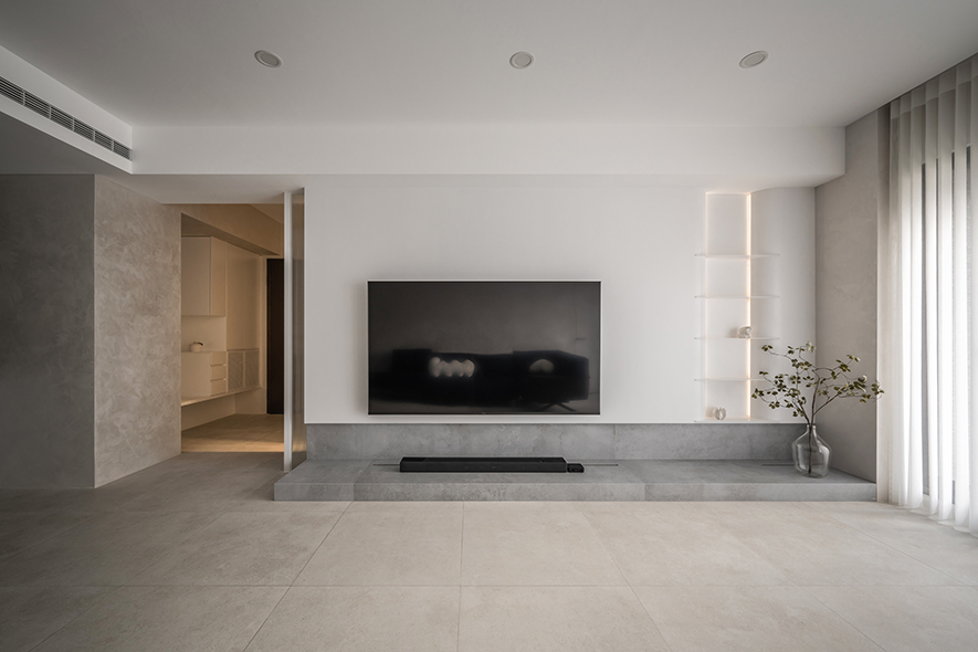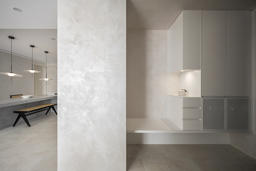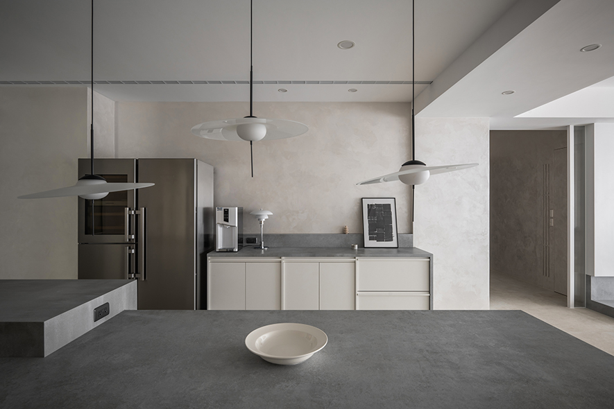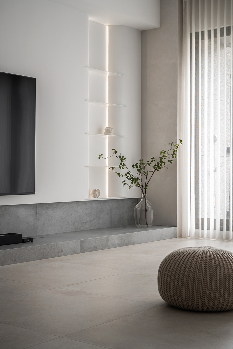 米白與淺灰交織而成的簡靜質地,在日光浸潤下,緩緩流動著斑駁詩意,於心裡泛起陣陣漣漪,彷彿按下時間的暫停格,消融瑣碎日常積累的紛雜心緒,接住疲於奔走的身心,於此獲得一隅安謐。