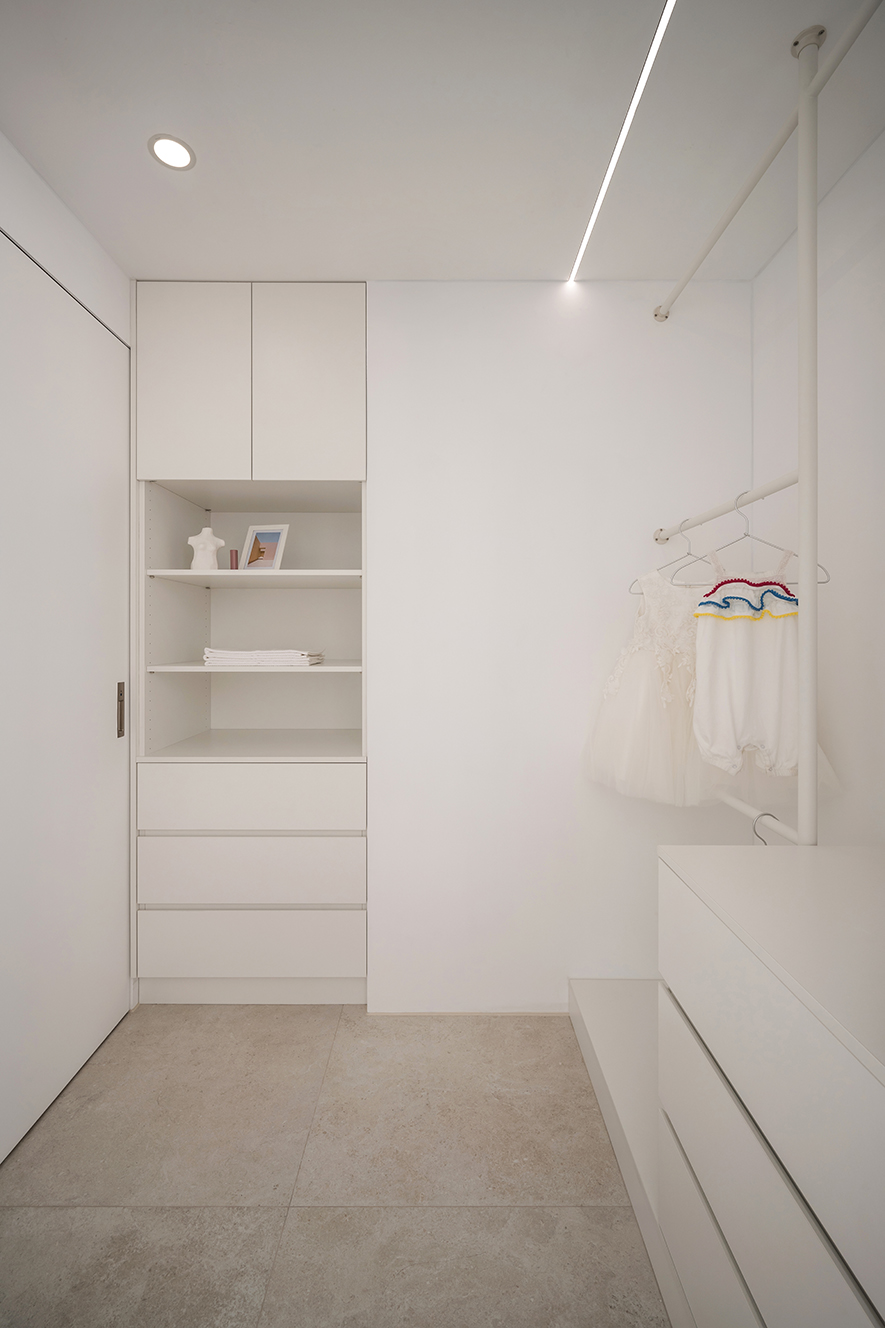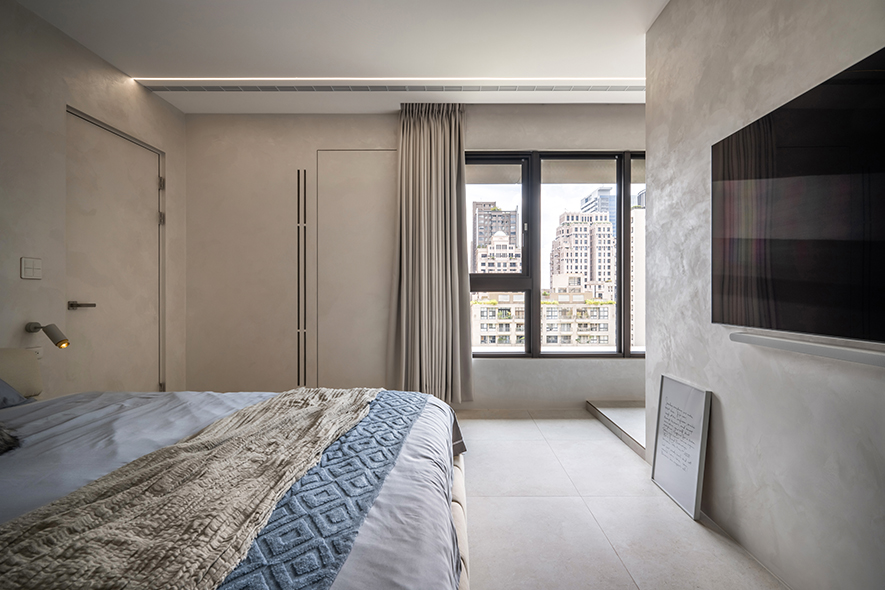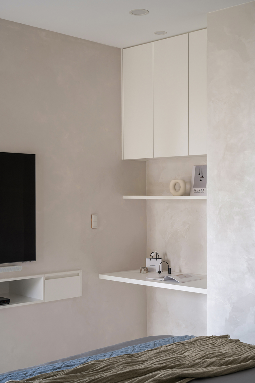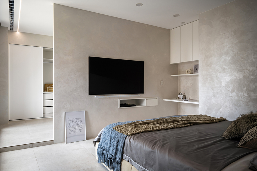 業主以「度假宅」為主要訴求,希望能在休閒之時尋一靜謐之處,讓平日身處繁忙的男女主人忘卻工作中的疲憊,於是汲取兩人喜愛的中性色系,以「化繁為簡」將舒適度放到最大,拆除隔間引入光線,並將機能整合於立面,創造開闊視覺,放眼望去心曠神怡,在這處清淺溫潤的度假宅邸,實現五口之家的美好光景。