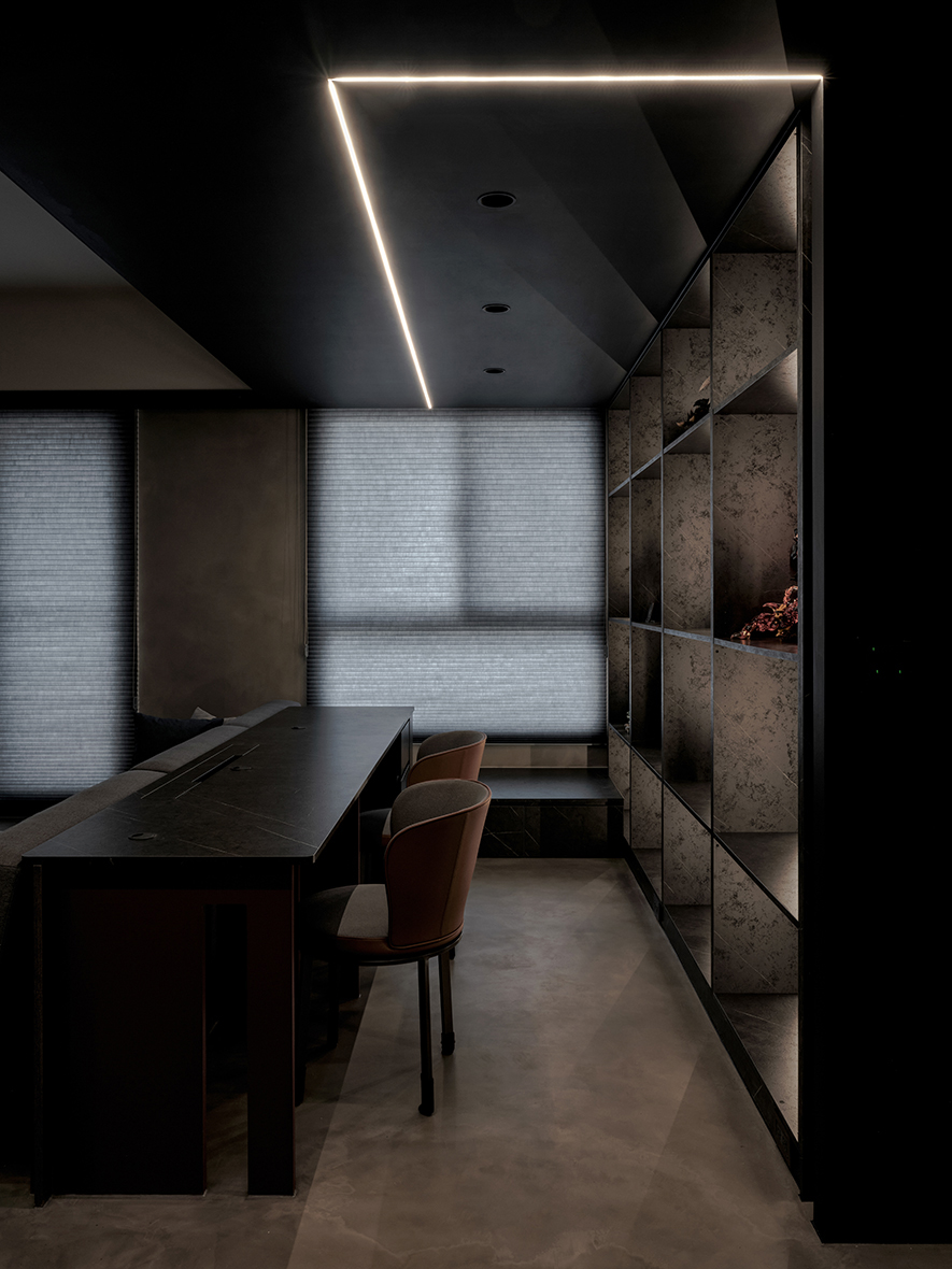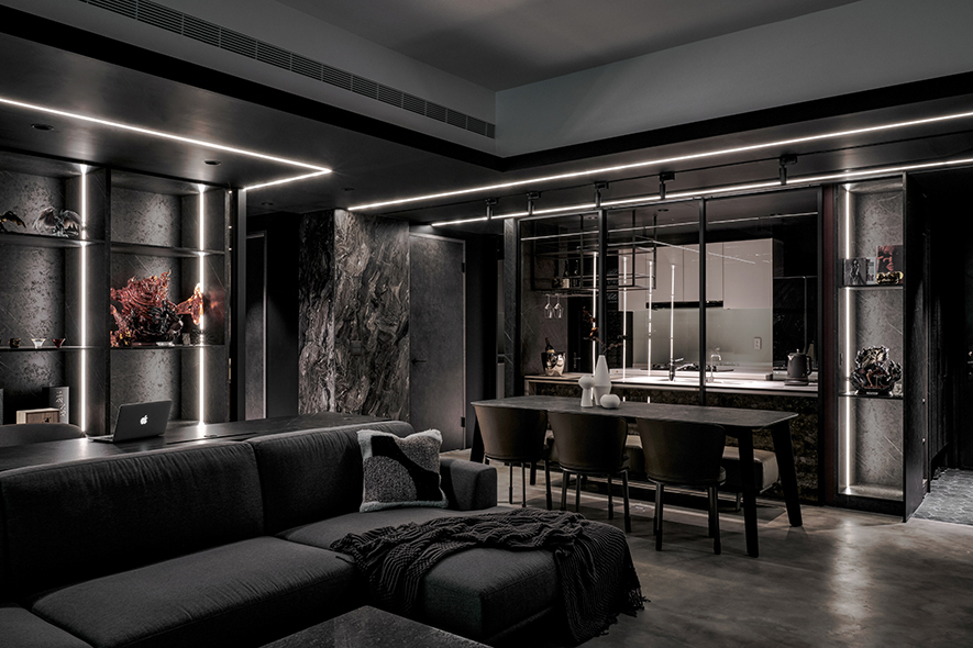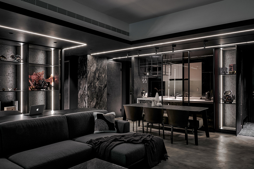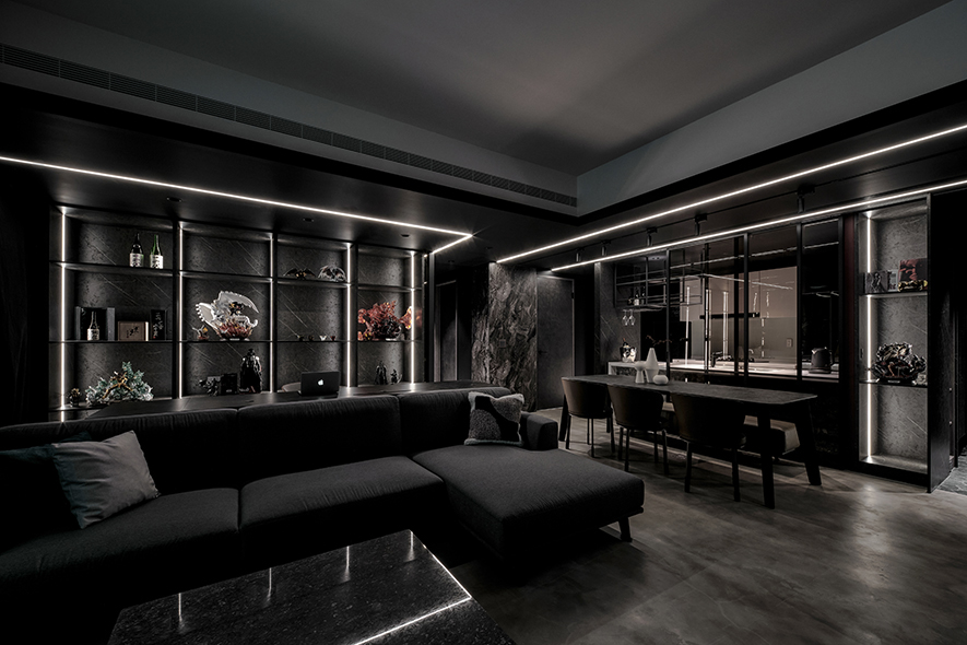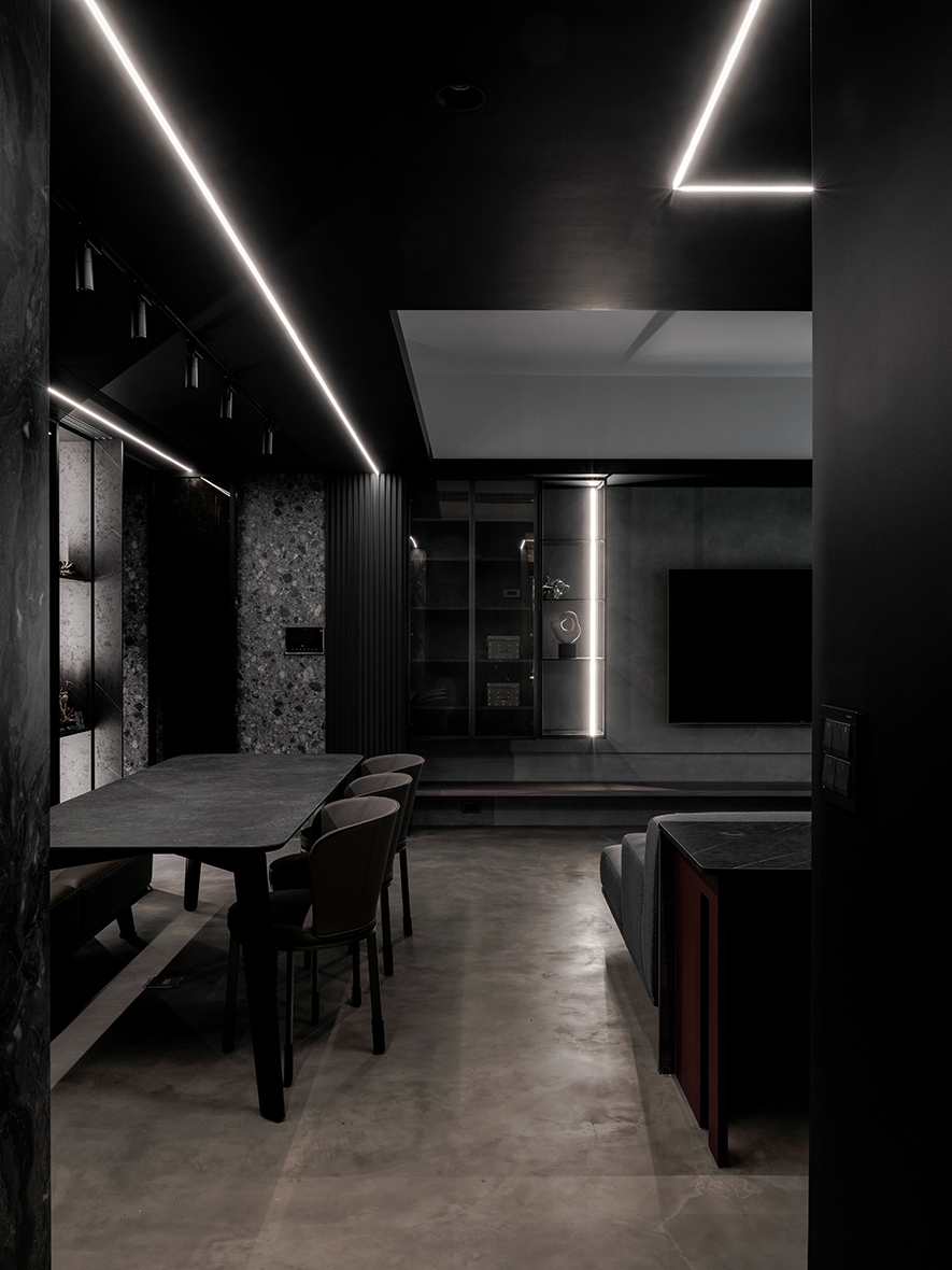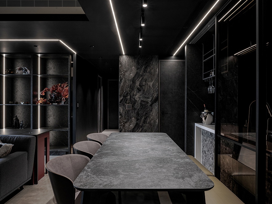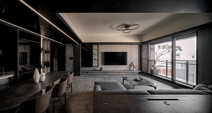 回應屋主喜好,設計師以黑色為基調,選搭石紋和素雅的藝術漆,於多元照明下呈現生動的層次變化,悄然敘述輕奢質調,而全屋地坪刷抹淡灰塗料,無接縫效果引出自然氣息,並串聯客、餐廳及書房,呈遞清爽明通的開放式公領域,令居者在滿室美韻裡,相偕浸漫天、地的柔光共呼吸。