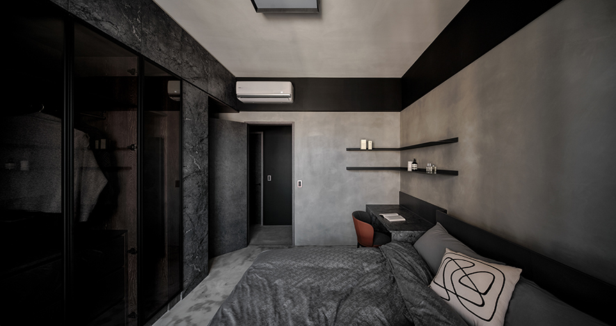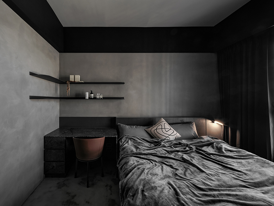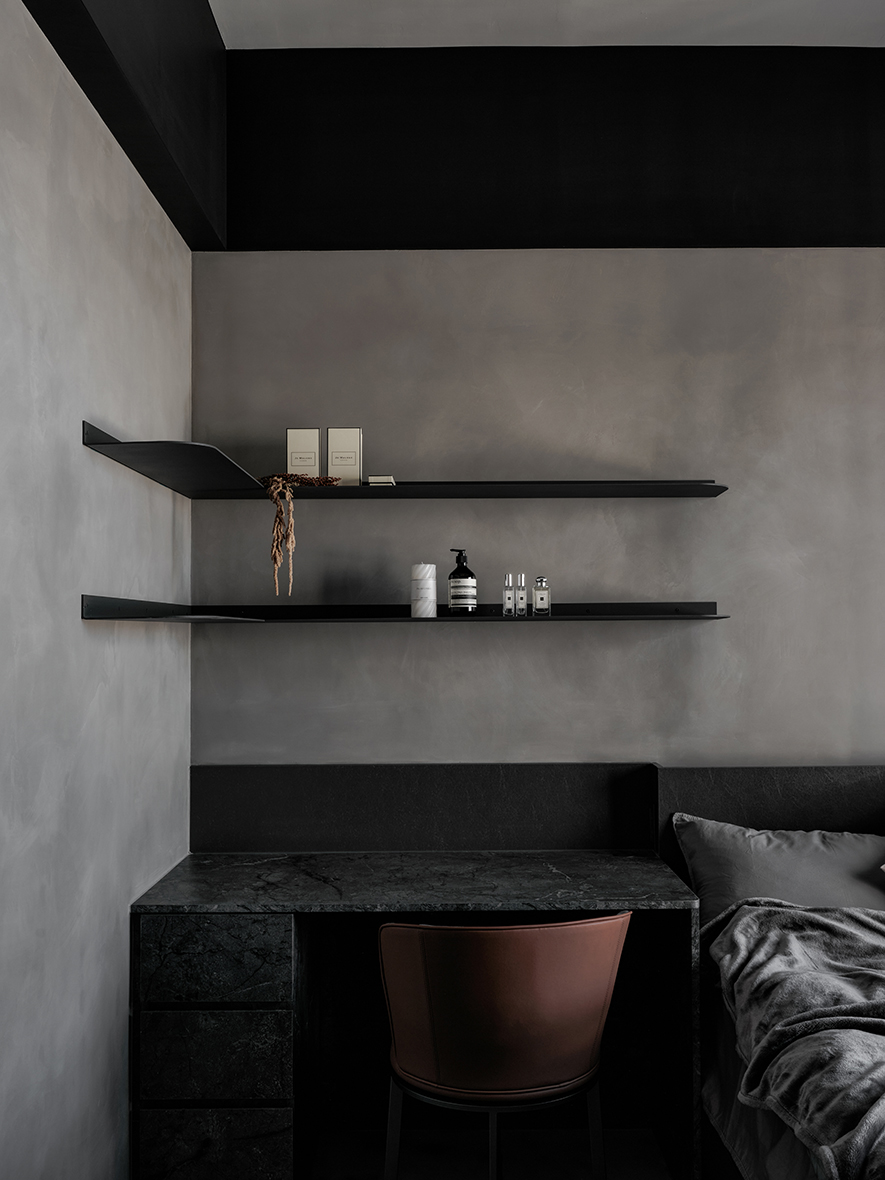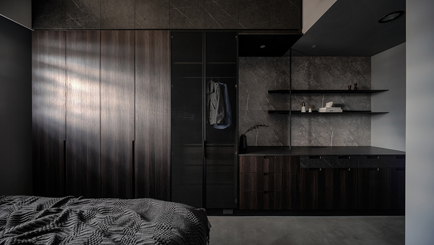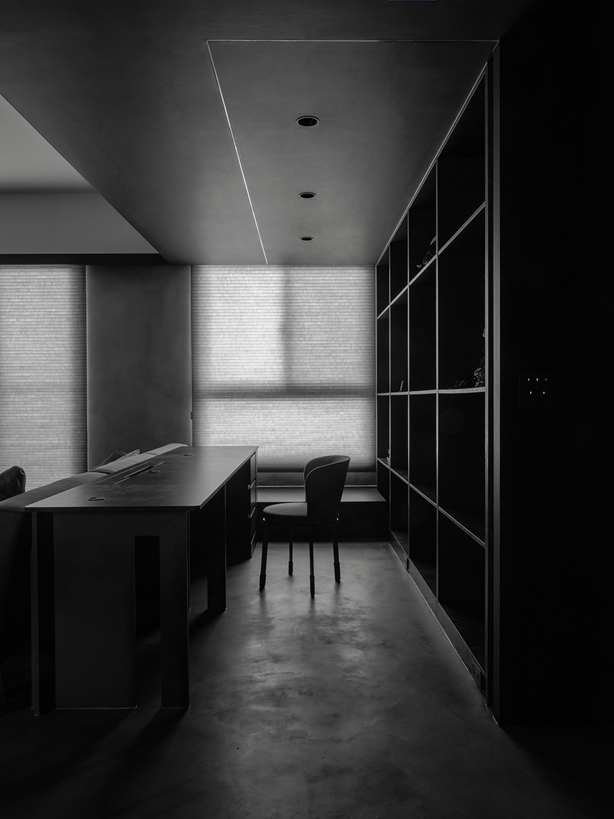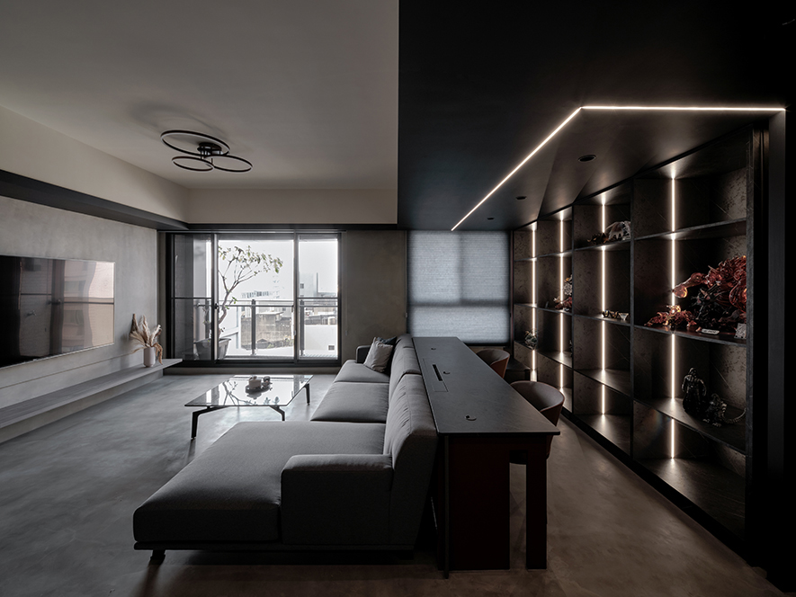 回應屋主喜好,設計師以黑色為基調,選搭石紋和素雅的藝術漆,於多元照明下呈現生動的層次變化,悄然敘述輕奢質調,而全屋地坪刷抹淡灰塗料,無接縫效果引出自然氣息,並串聯客、餐廳及書房,呈遞清爽明通的開放式公領域,令居者在滿室美韻裡,相偕浸漫天、地的柔光共呼吸。