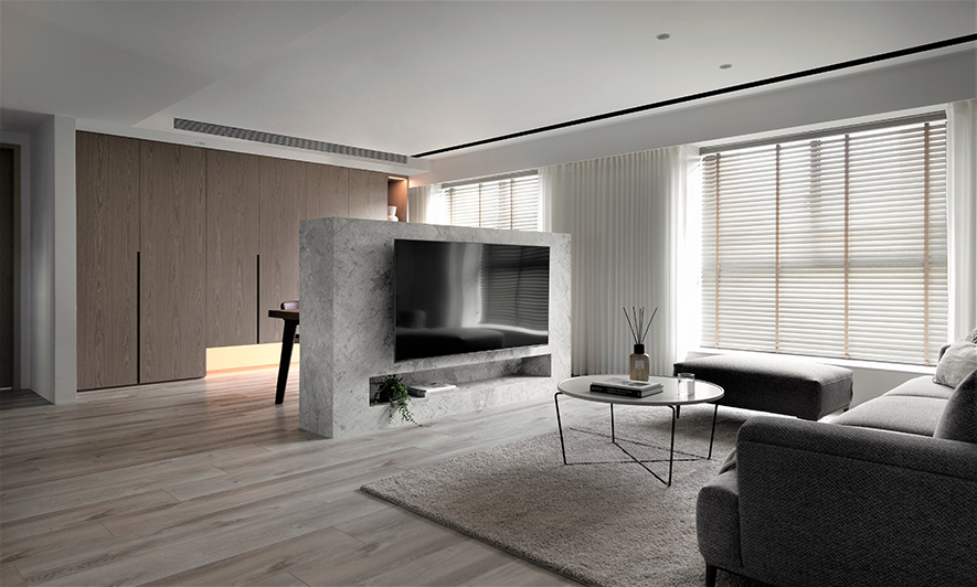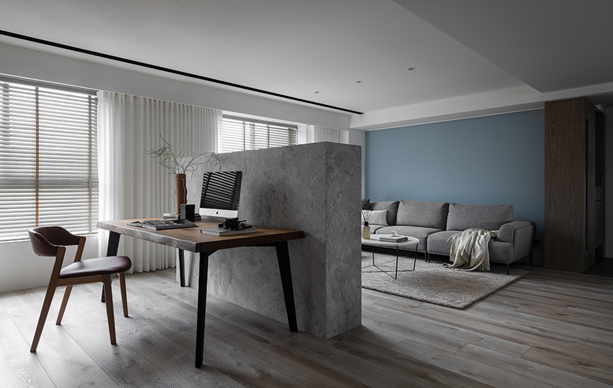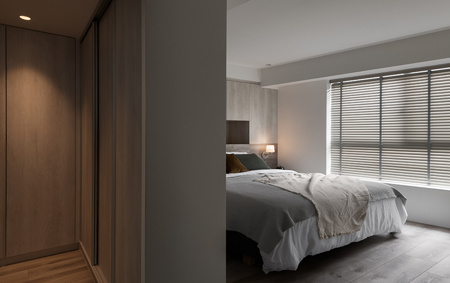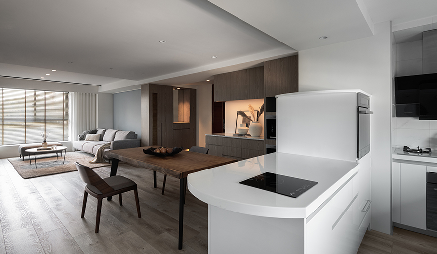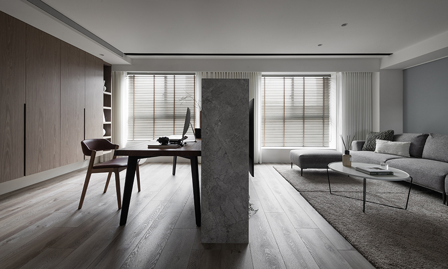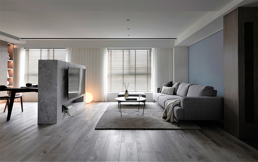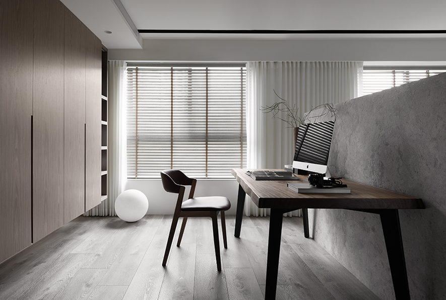 依循業主對放鬆感的需求,本案串聯客、餐廳及書房,呈現開闊舒適的公領域,另採用百葉窗簾濾擇日光,地面擺置球型燈,打造舒緩情緒的柔和照明,結合簡潔明淨的軟裝配置,詮釋消解生活疲意的溫馨家居。