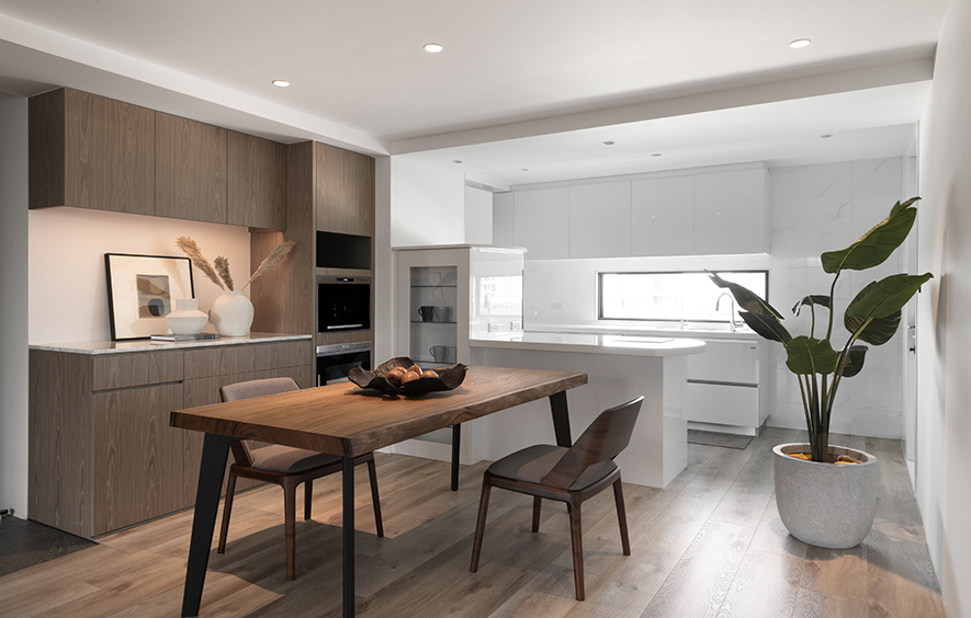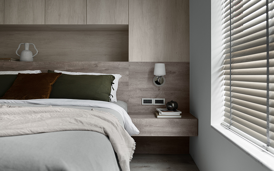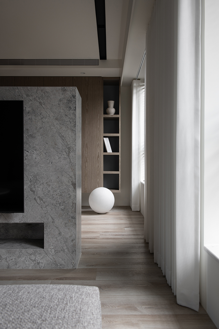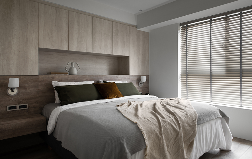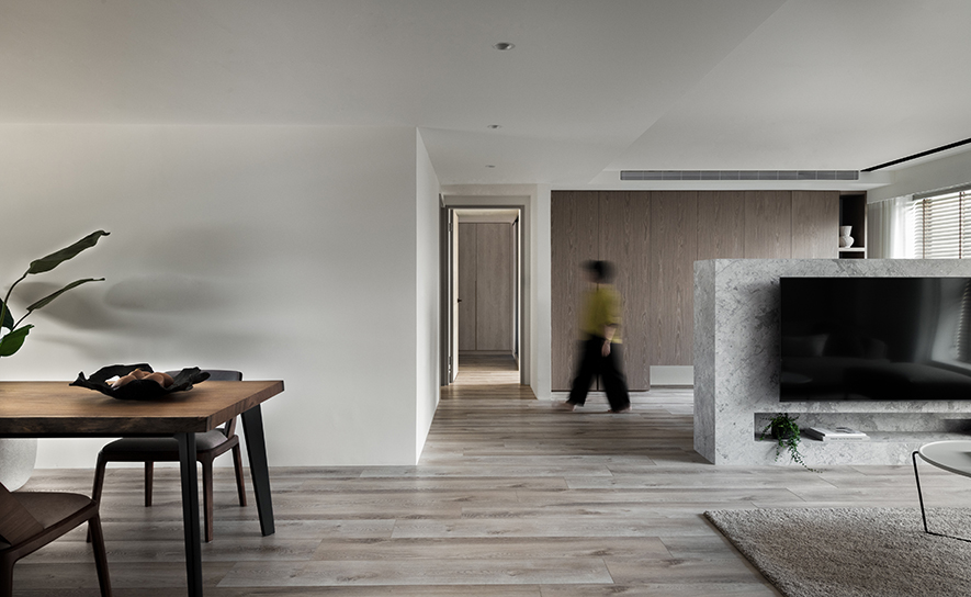 依循業主對放鬆感的需求,本案串聯客、餐廳及書房,呈現開闊舒適的公領域,另採用百葉窗簾濾擇日光,地面擺置球型燈,打造舒緩情緒的柔和照明,結合簡潔明淨的軟裝配置,詮釋消解生活疲意的溫馨家居。