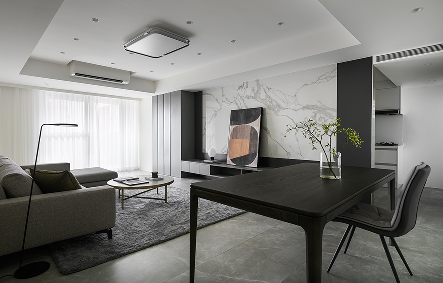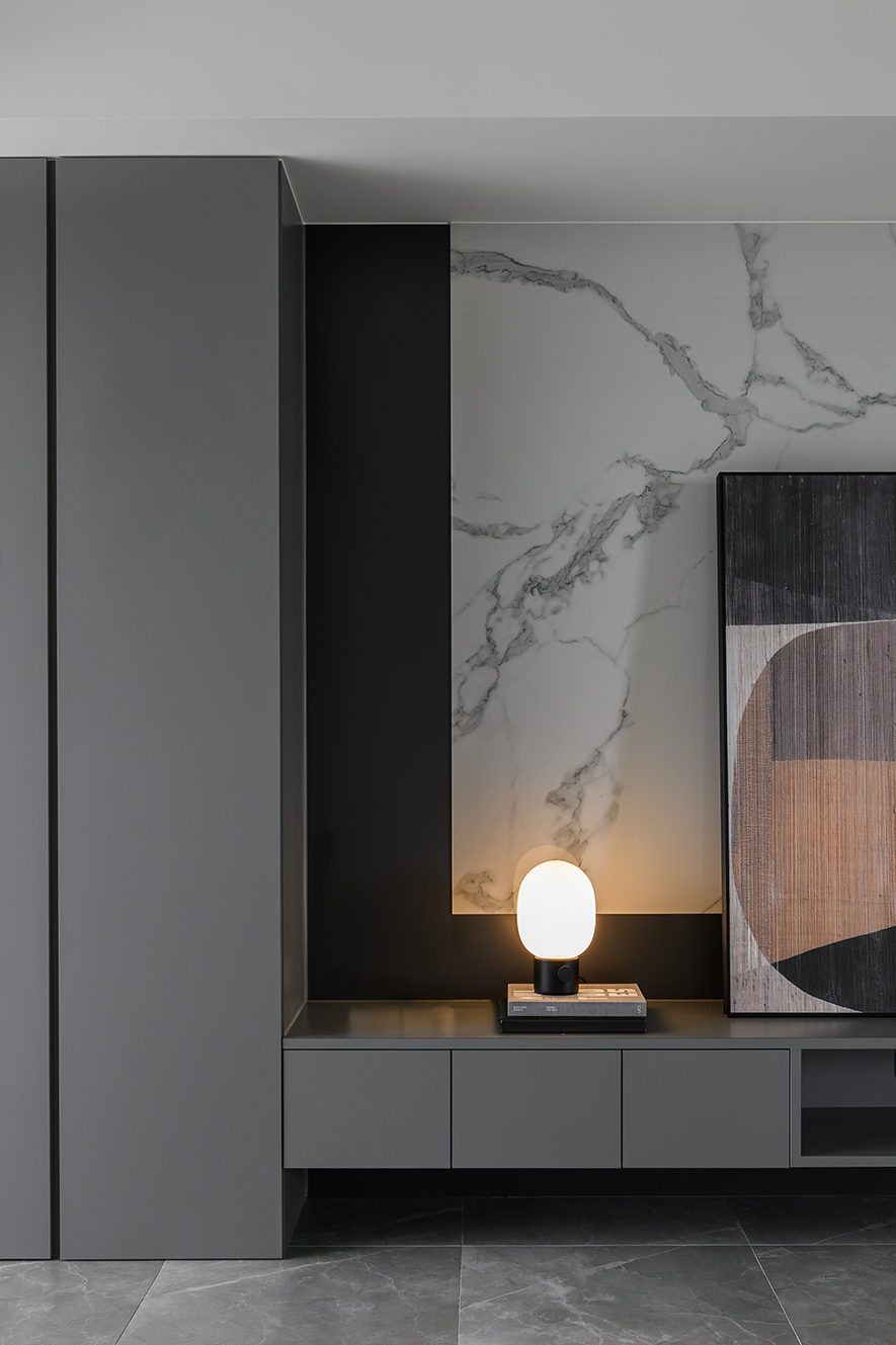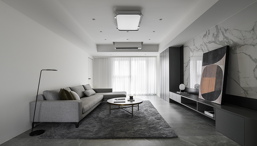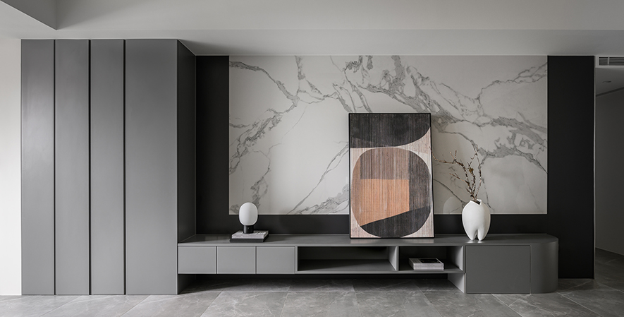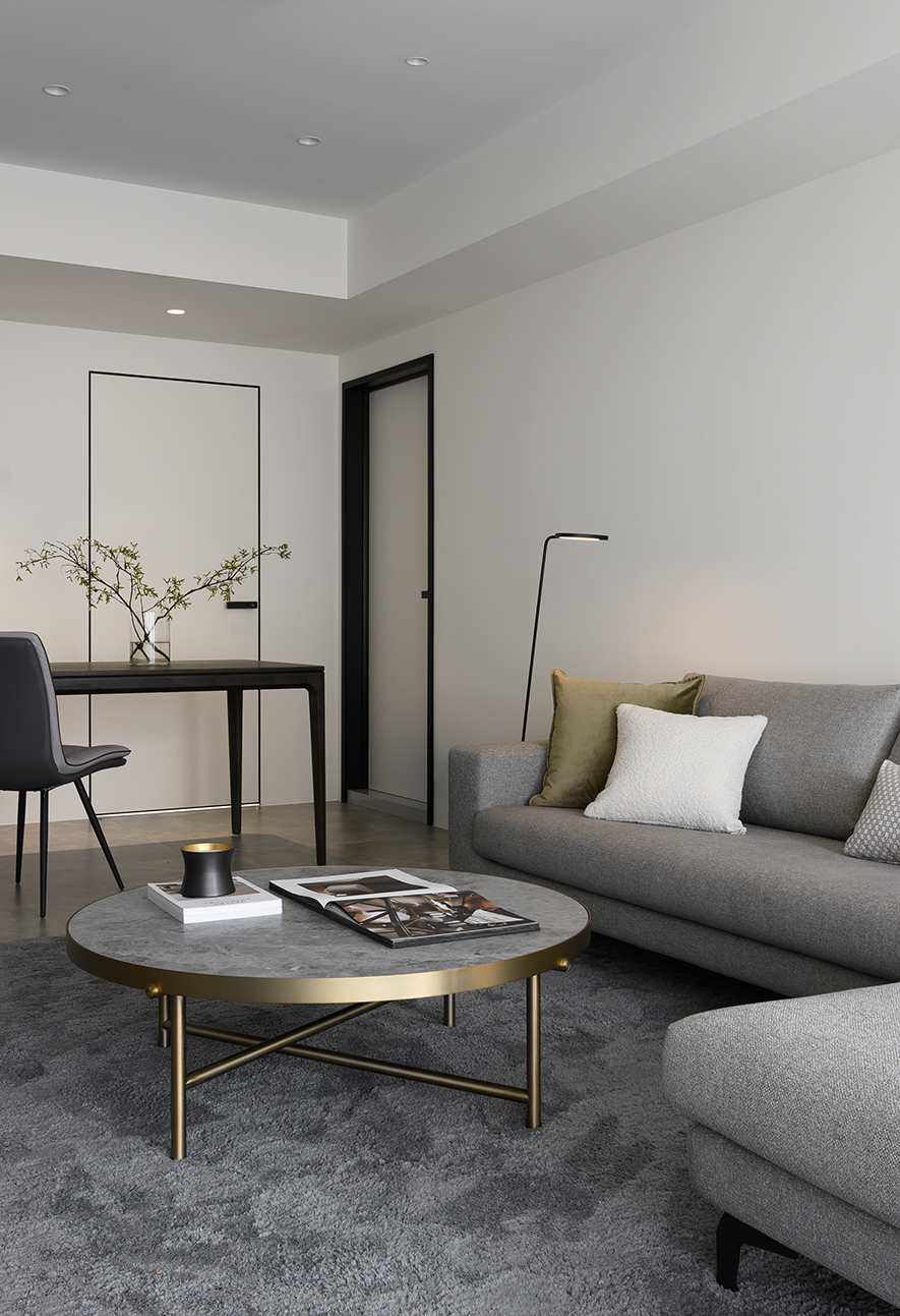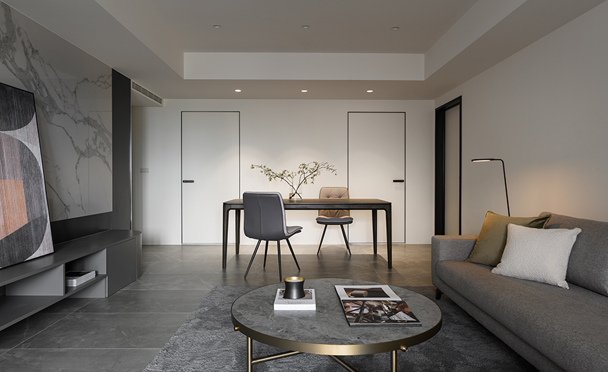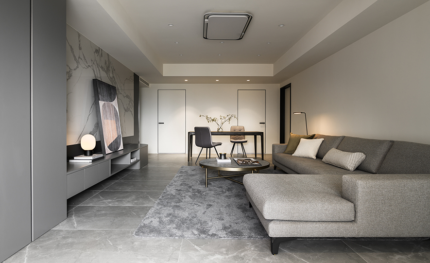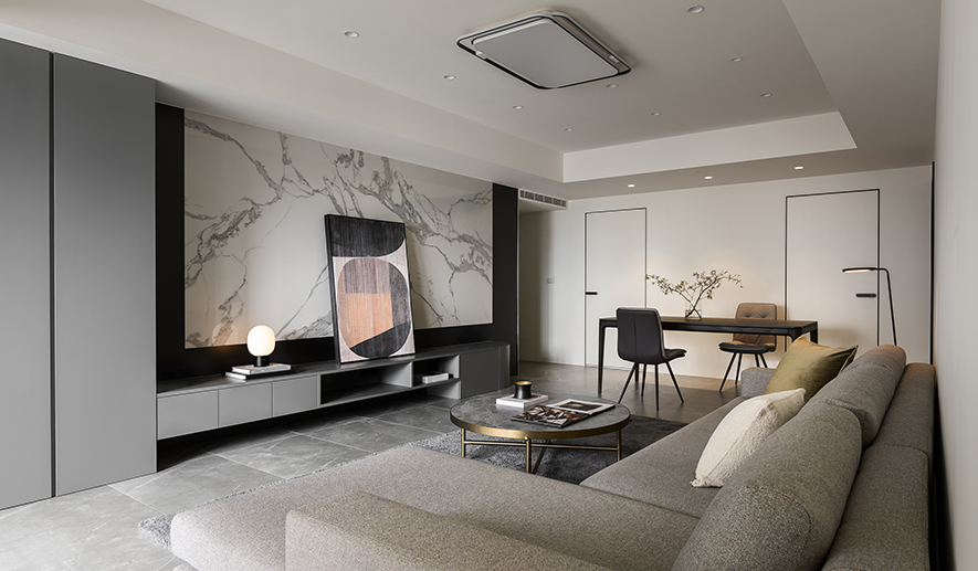 霧灰石紋地坪如晨霧初散般,作為基底靜靜鋪展開來,搭配大面留白牆面與灰階軟裝,沉靜中流露克制的氛圍。沙發、窗簾與家飾運用相近色階鋪陳,讓視線自然延展,並引導居者沉澱情緒。電視牆選用灰白大理石紋面板,紋理在光影間隱現如煙,形塑沉穩安定的空間主景。整體設計以極簡語彙承載生活,減去繁複裝飾,專注光影與材質交互下的純淨肌理,讓日常於通透而靜穩的空間中緩緩展開。