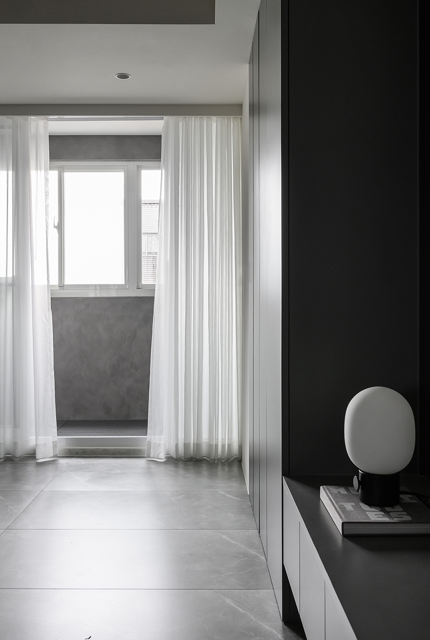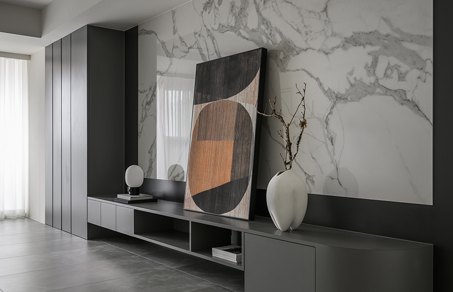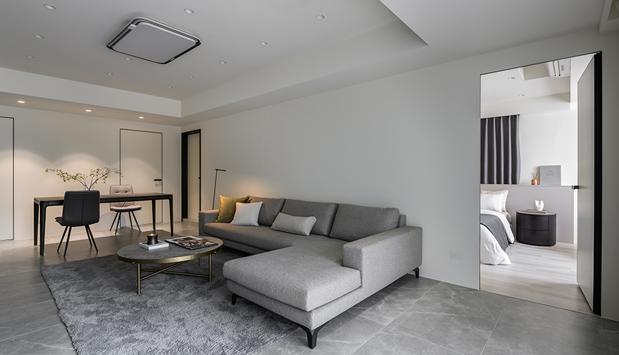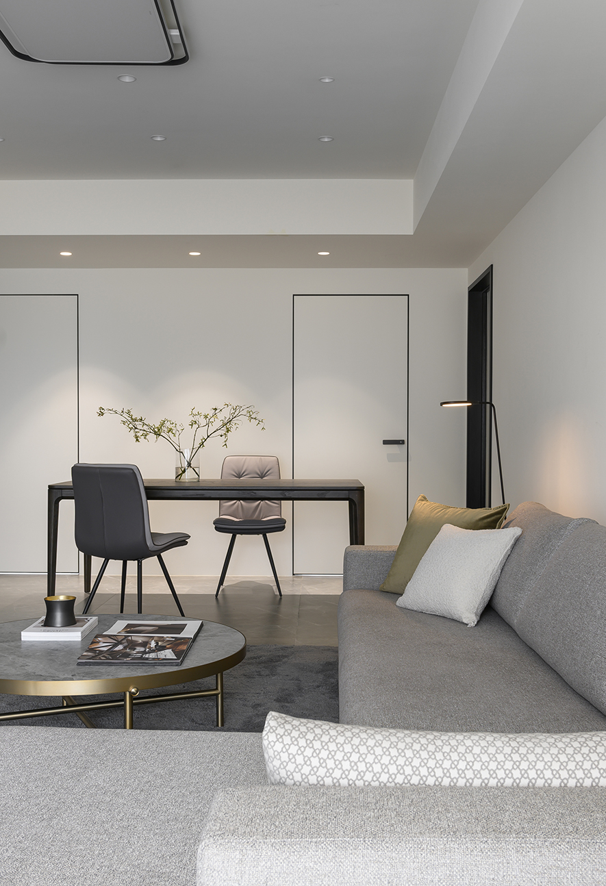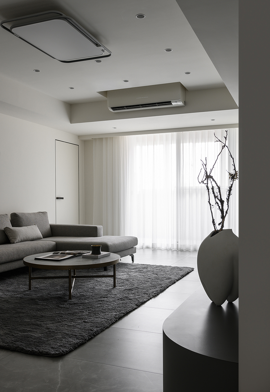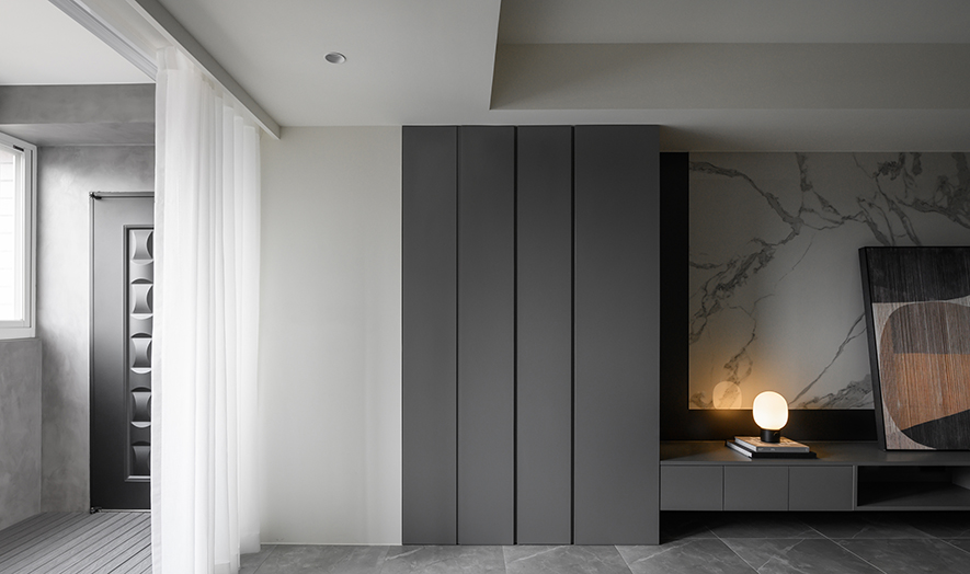 霧灰石紋地坪如晨霧初散般,作為基底靜靜鋪展開來,搭配大面留白牆面與灰階軟裝,沉靜中流露克制的氛圍。沙發、窗簾與家飾運用相近色階鋪陳,讓視線自然延展,並引導居者沉澱情緒。電視牆選用灰白大理石紋面板,紋理在光影間隱現如煙,形塑沉穩安定的空間主景。整體設計以極簡語彙承載生活,減去繁複裝飾,專注光影與材質交互下的純淨肌理,讓日常於通透而靜穩的空間中緩緩展開。
