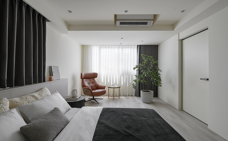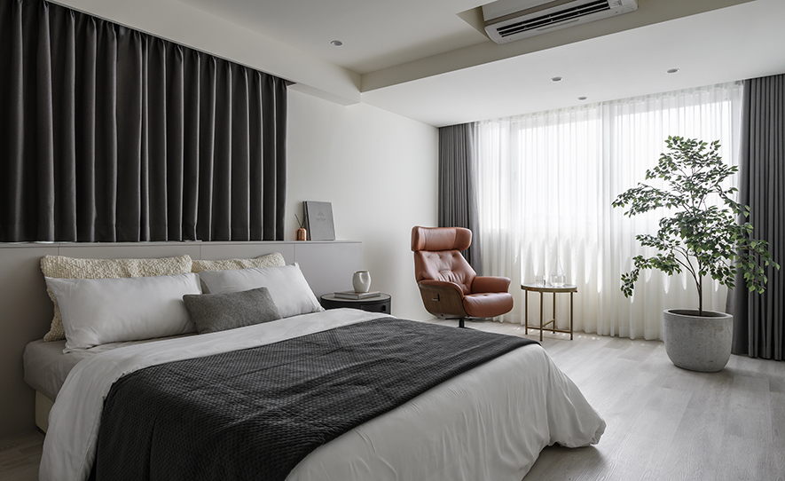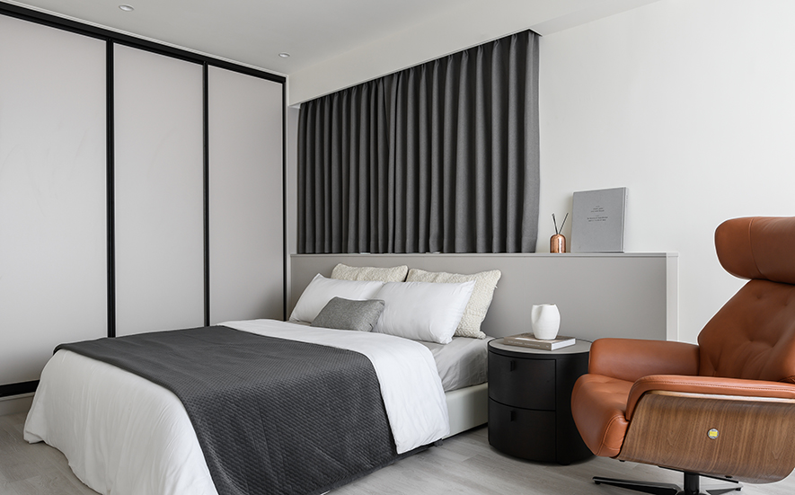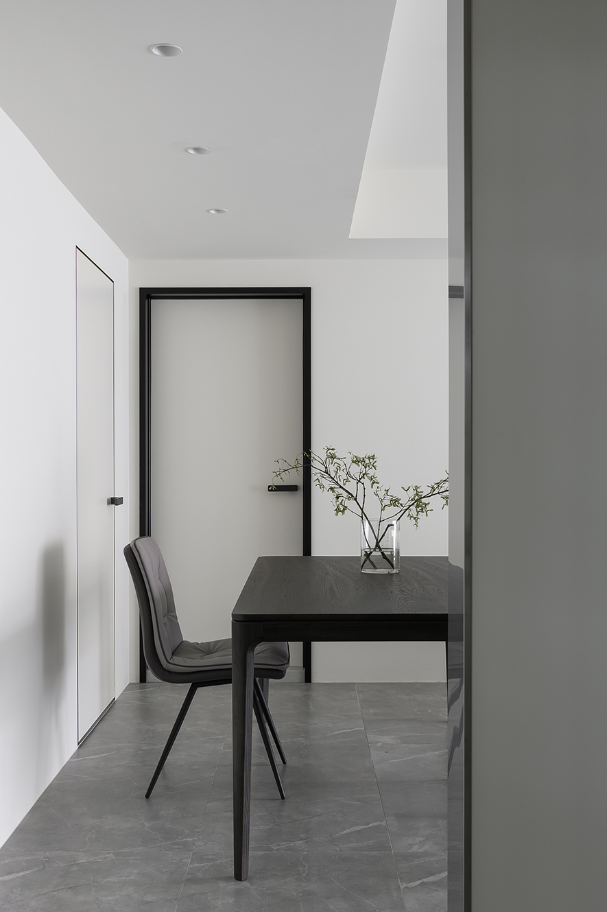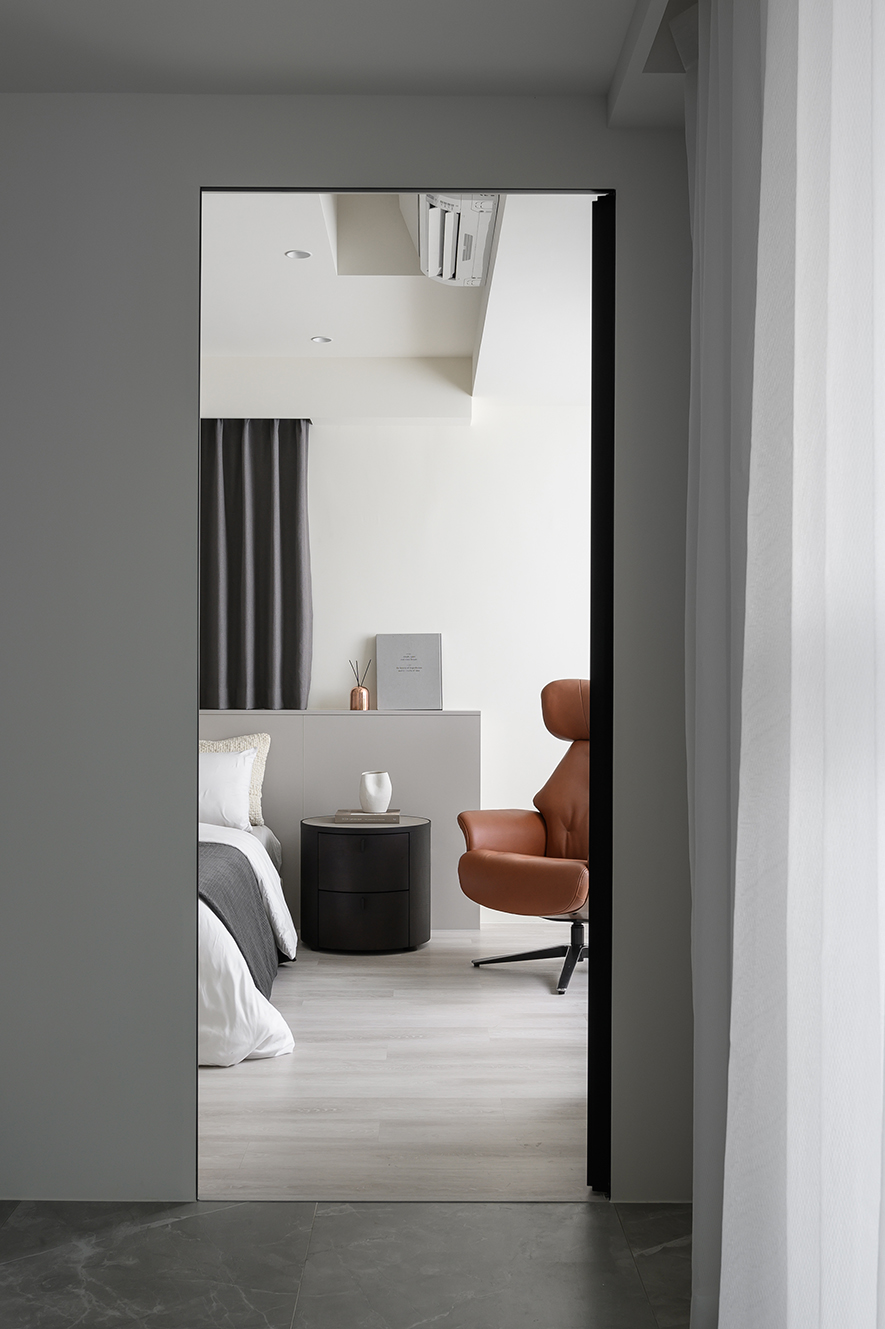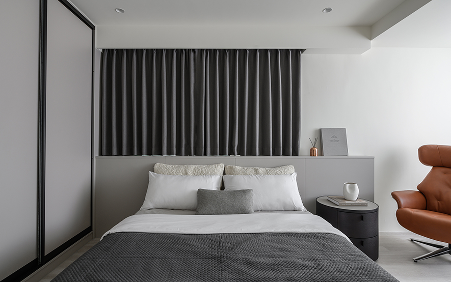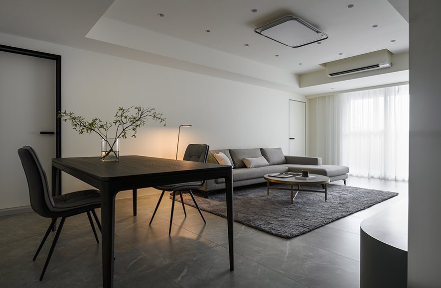 霧灰石紋地坪如晨霧初散般,作為基底靜靜鋪展開來,搭配大面留白牆面與灰階軟裝,沉靜中流露克制的氛圍。沙發、窗簾與家飾運用相近色階鋪陳,讓視線自然延展,並引導居者沉澱情緒。電視牆選用灰白大理石紋面板,紋理在光影間隱現如煙,形塑沉穩安定的空間主景。整體設計以極簡語彙承載生活,減去繁複裝飾,專注光影與材質交互下的純淨肌理,讓日常於通透而靜穩的空間中緩緩展開。