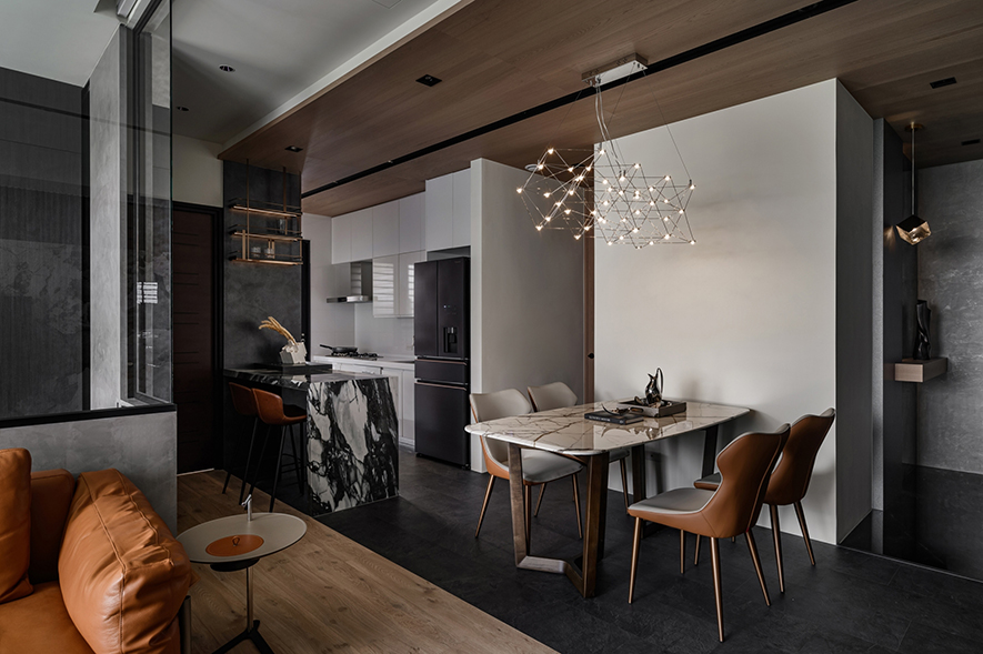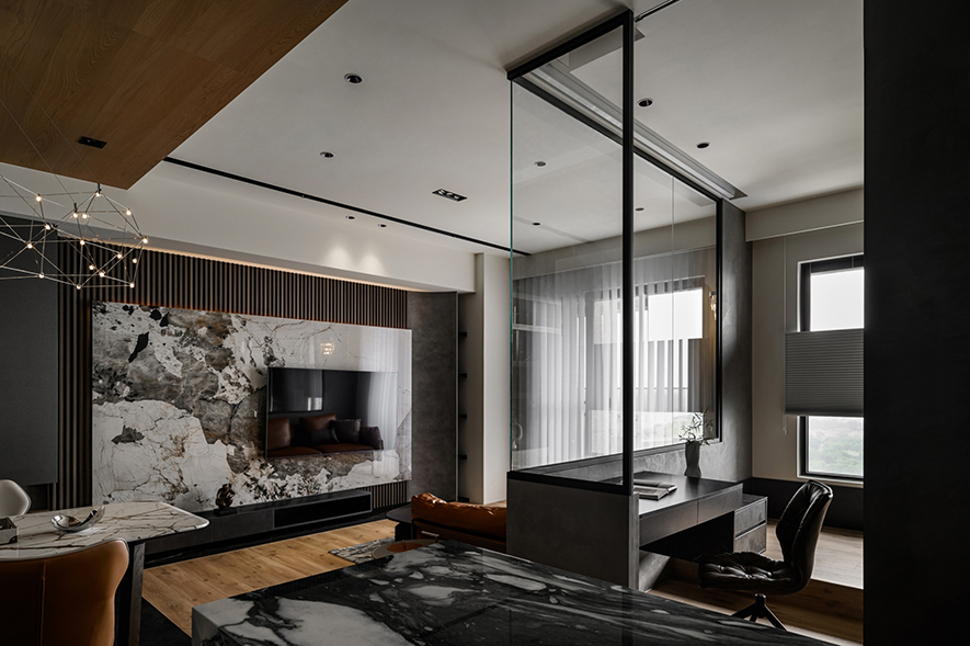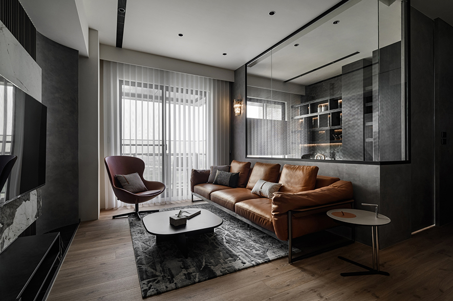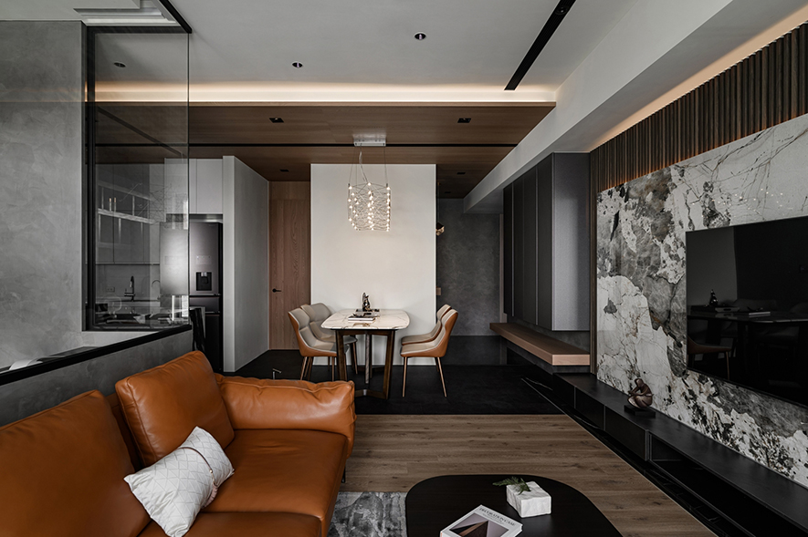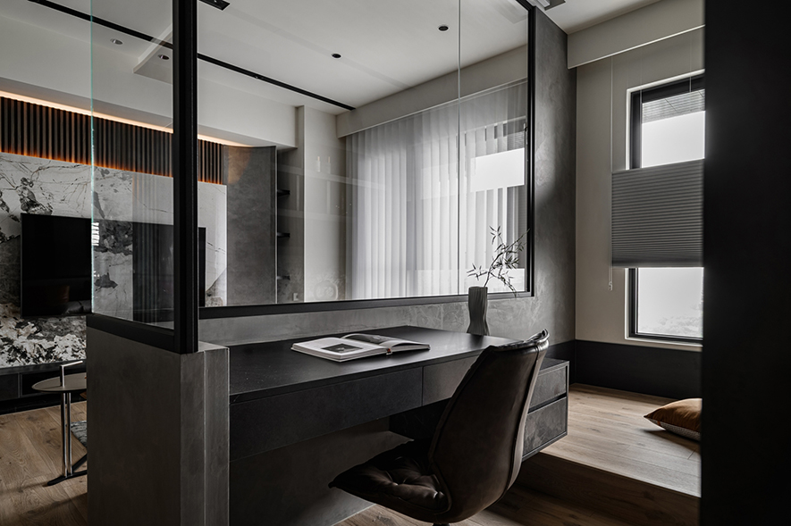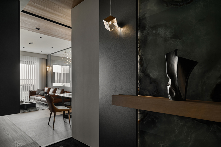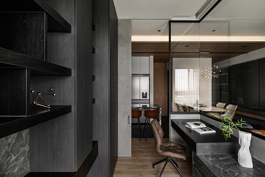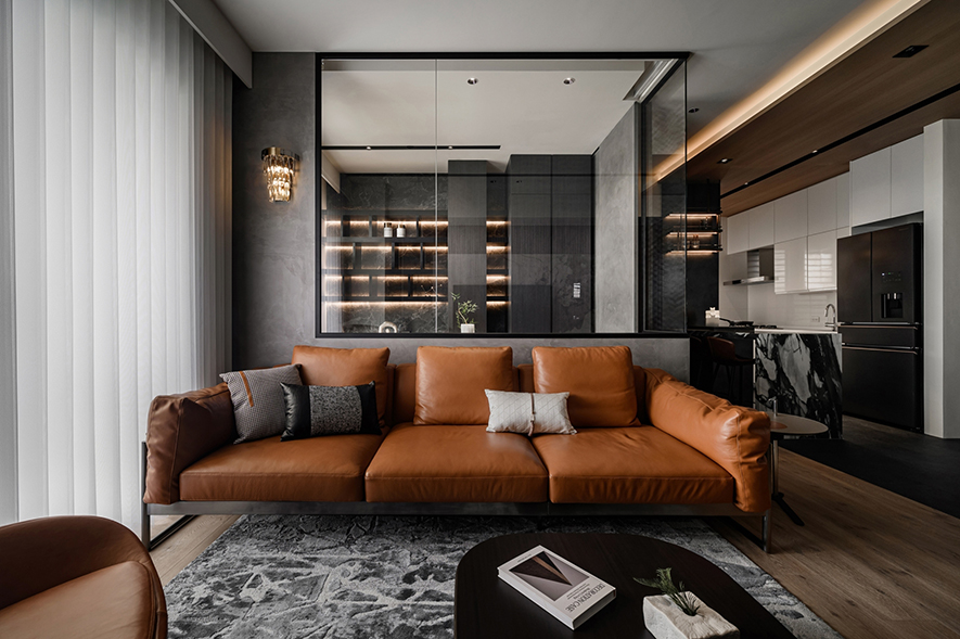 輕啟大門,沉穩暗調自足下、身側漫染至屋中,相佐其間多處異材的細膩紋理、天壁簡約白色基調,醞釀俐落的現代藝韻,一旁,大片清透玻璃引入輕盈煦光,柔潤遍室墨色、綴點細處精緻質感,為屋主鋪敘品味獨到的絕美屋宅。