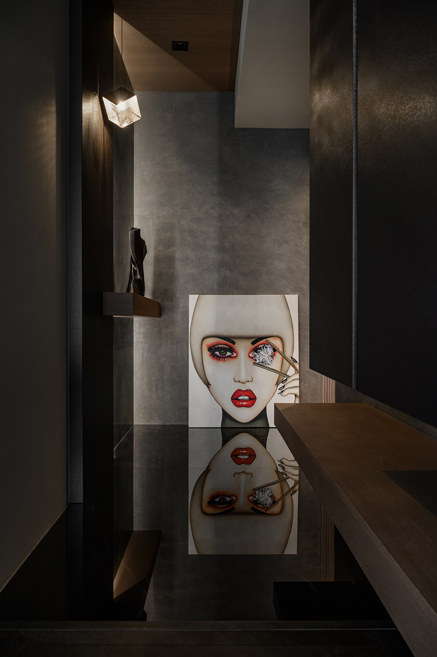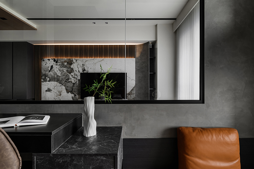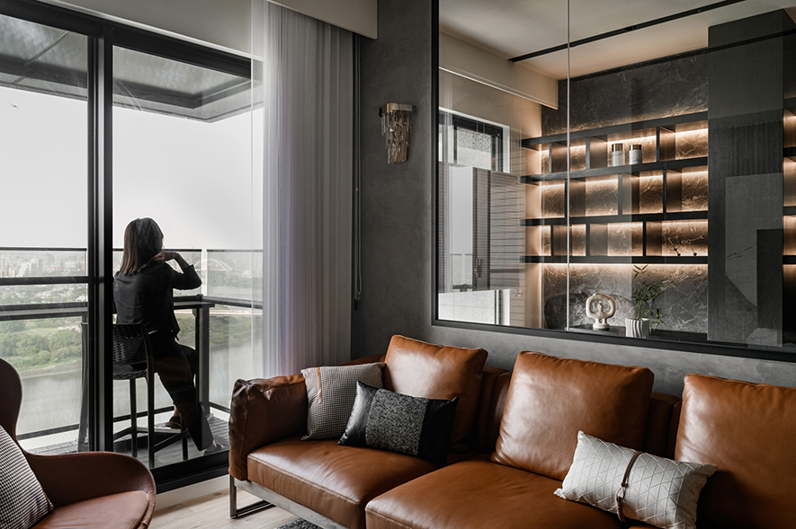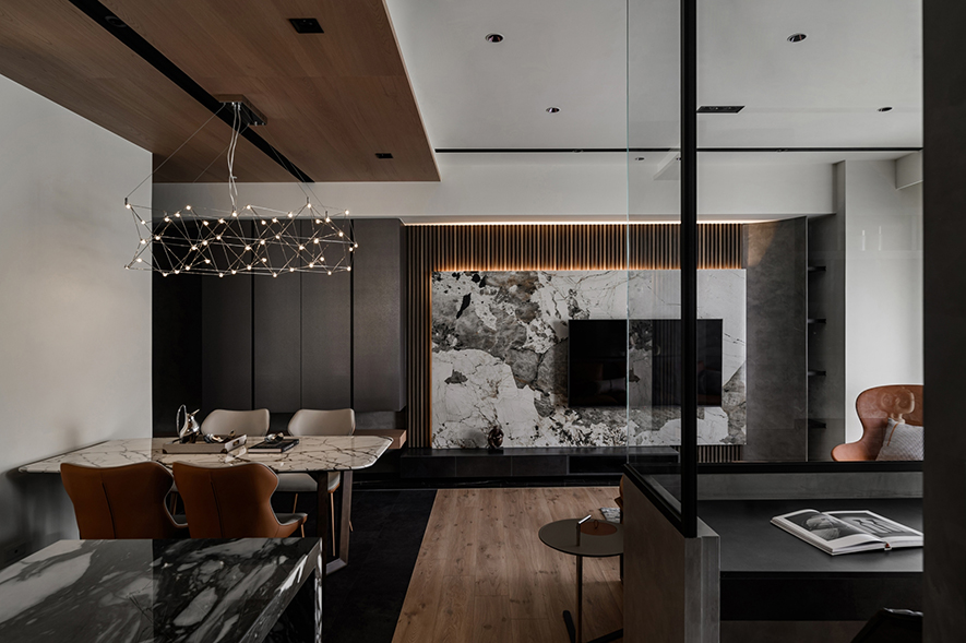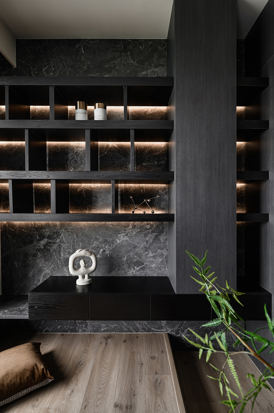 輕啟大門,沉穩暗調自足下、身側漫染至屋中,相佐其間多處異材的細膩紋理、天壁簡約白色基調,醞釀俐落的現代藝韻,一旁,大片清透玻璃引入輕盈煦光,柔潤遍室墨色、綴點細處精緻質感,為屋主鋪敘品味獨到的絕美屋宅。