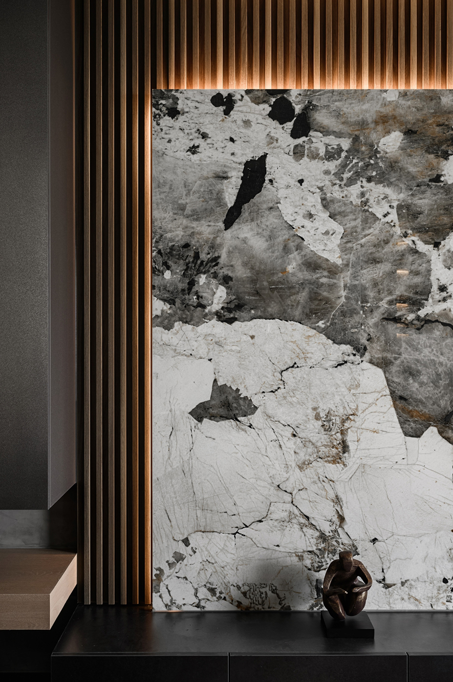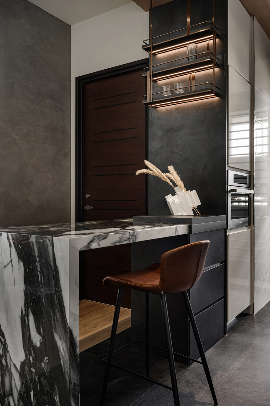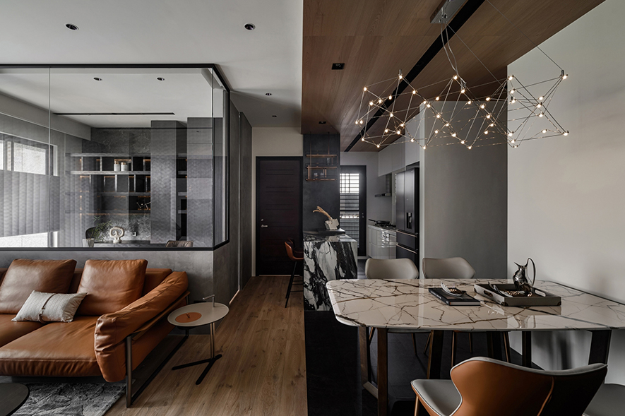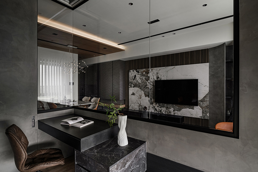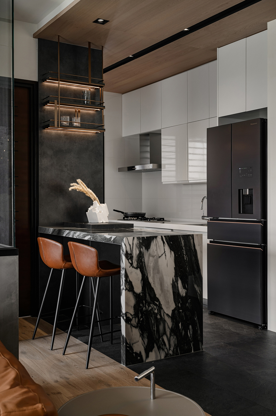 輕啟大門,沉穩暗調自足下、身側漫染至屋中,相佐其間多處異材的細膩紋理、天壁簡約白色基調,醞釀俐落的現代藝韻,一旁,大片清透玻璃引入輕盈煦光,柔潤遍室墨色、綴點細處精緻質感,為屋主鋪敘品味獨到的絕美屋宅。