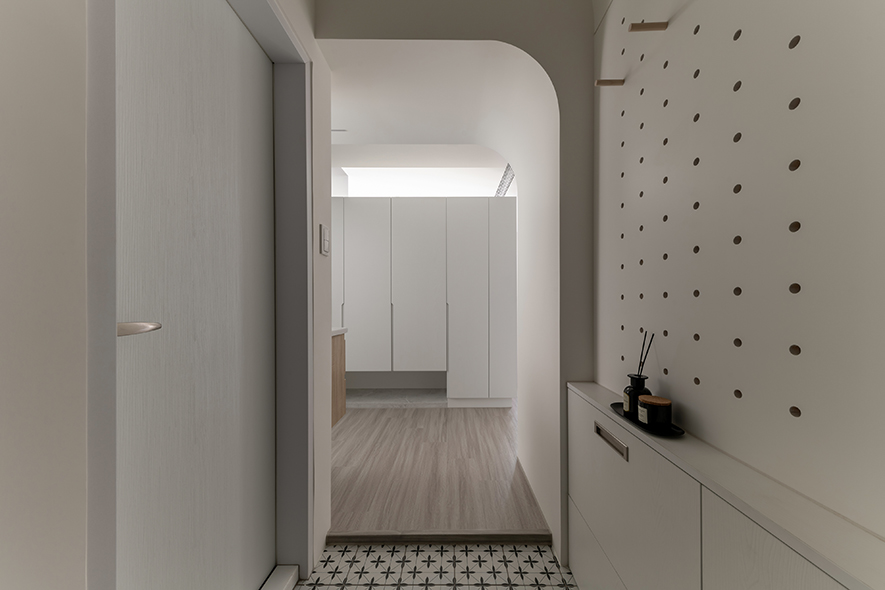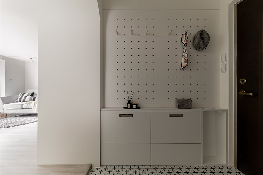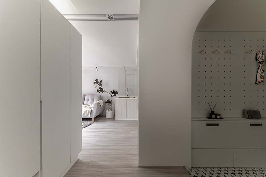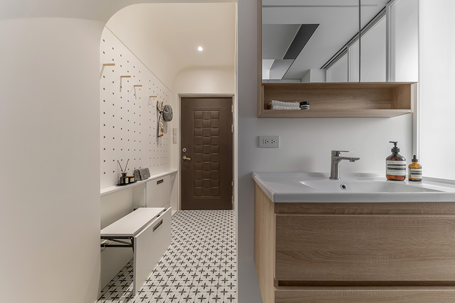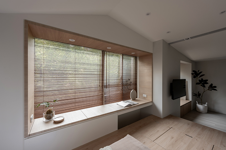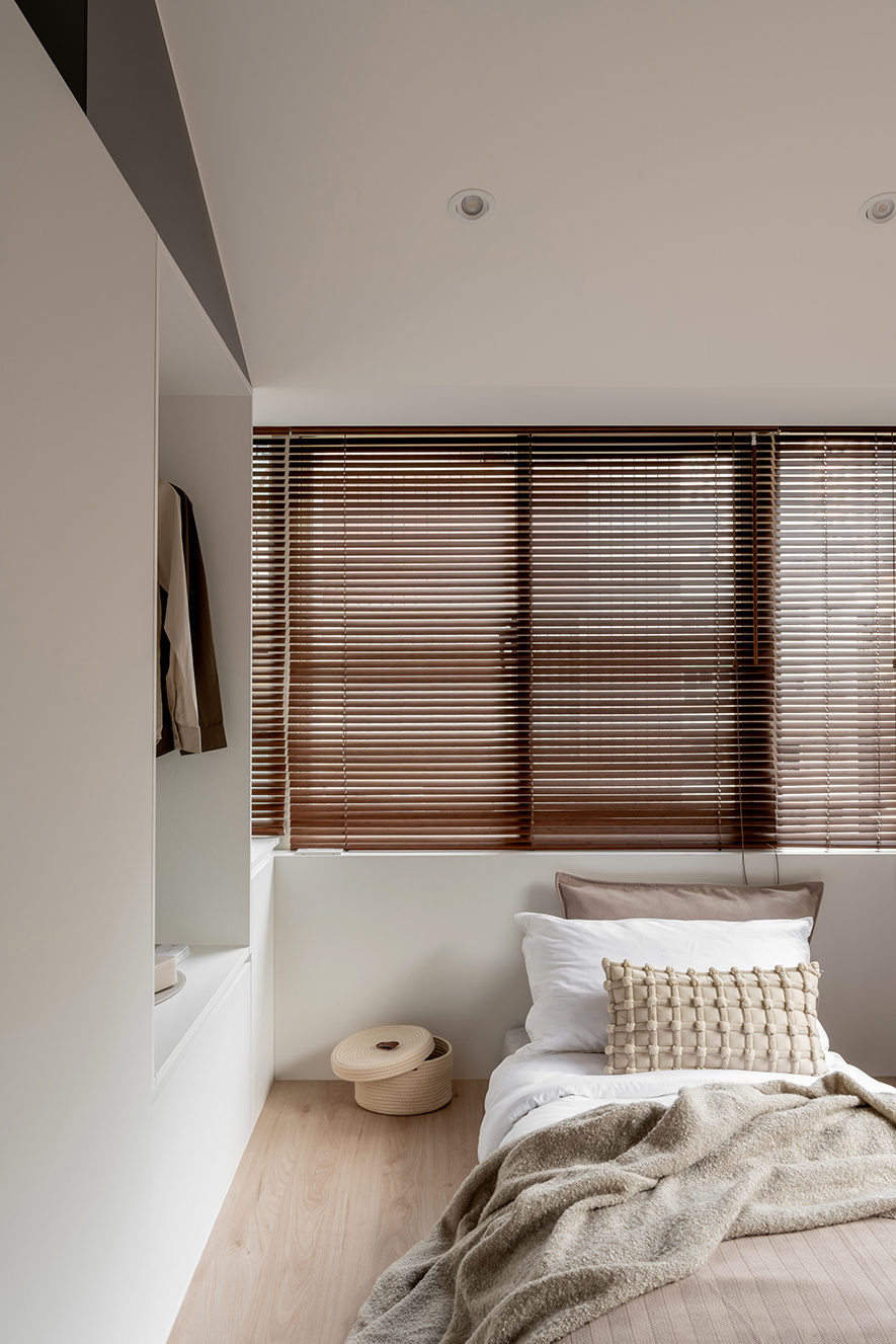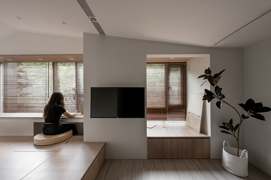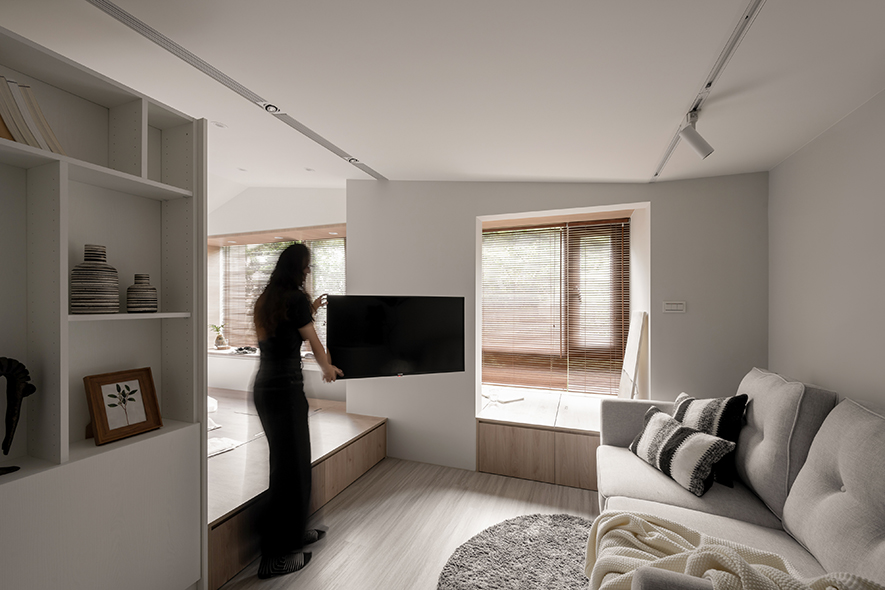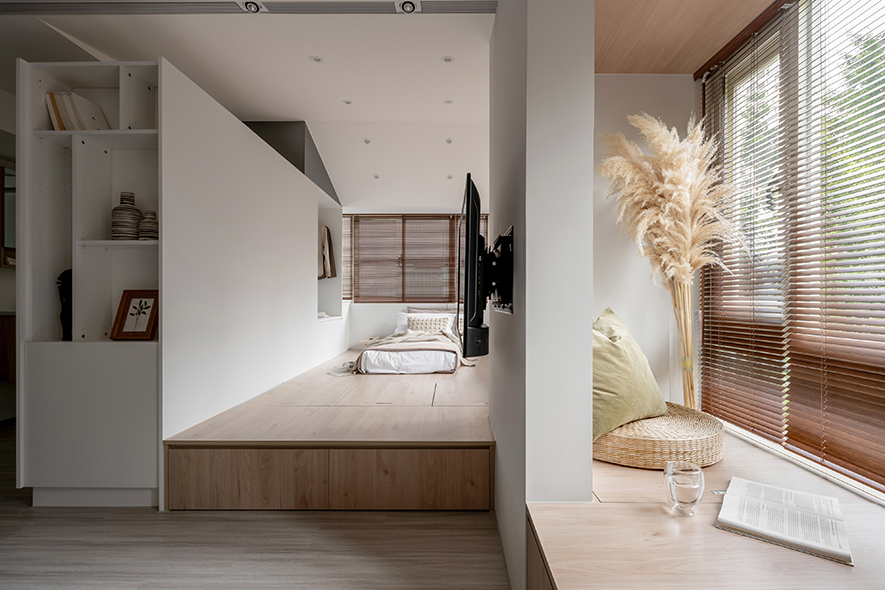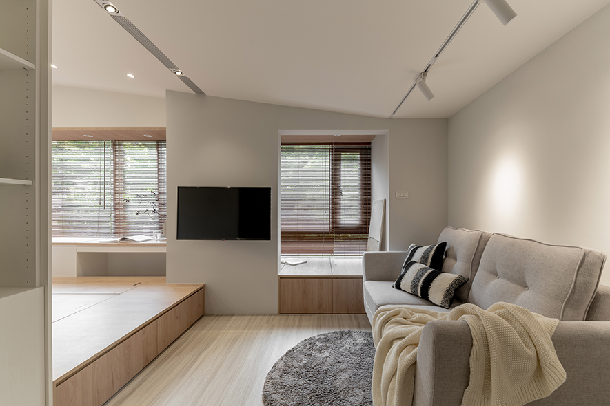 僅有9坪大的案場,首要面對舒適度和空間利用率的課題,設計師於天花板運用屋頂般的斜面造型連接客廳、臥室兩處的低梁,消弭量體存在同時增加視覺層次,並以半高櫃取代部分牆體,提升各區開闊及相連感,方便身處不同區域的家人輕鬆溝通交流,另將收納櫃悄然藏匿於臥榻、架高地坪等處,化微型場域為機能完善住所。