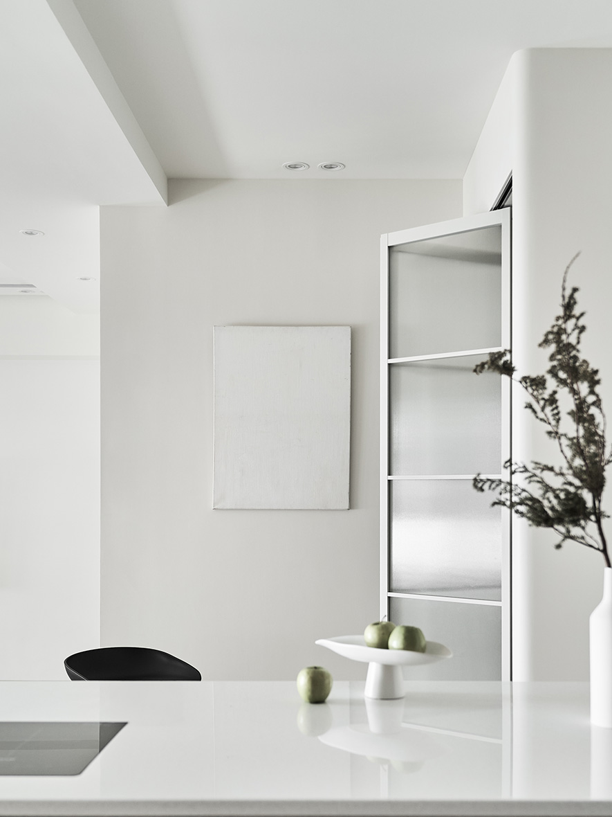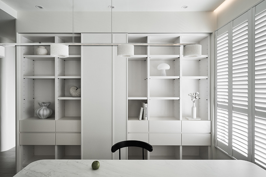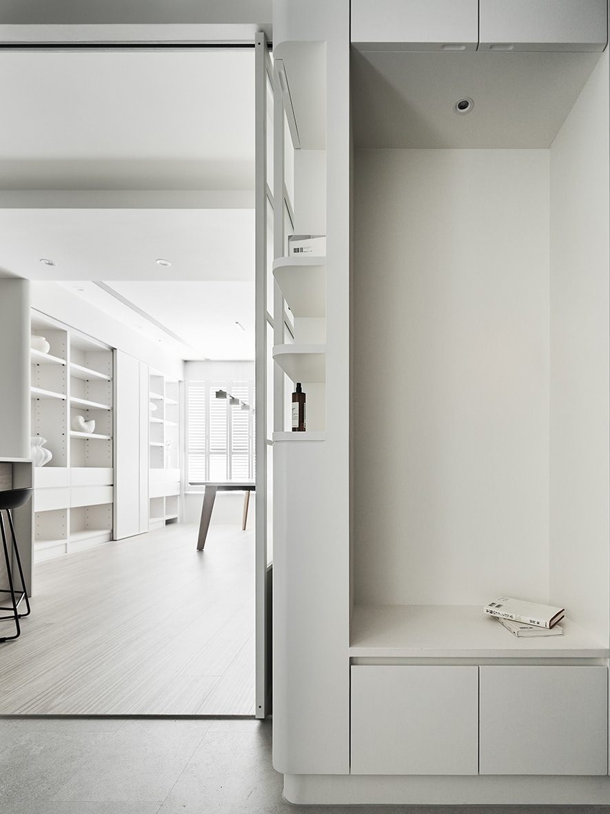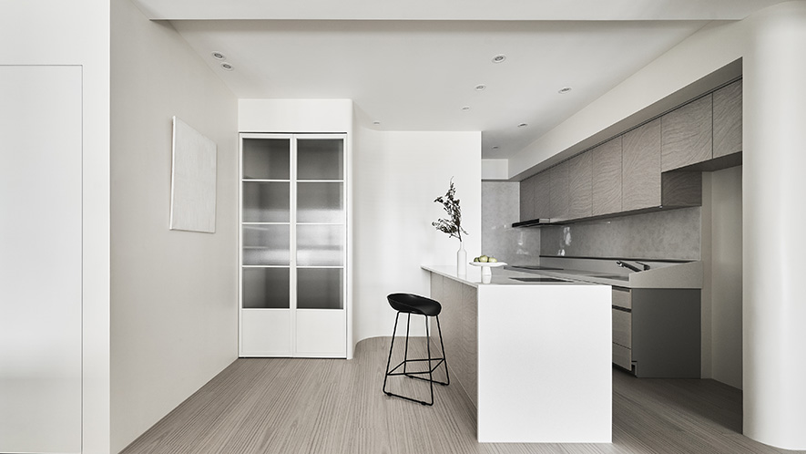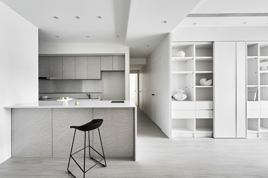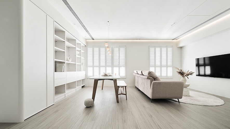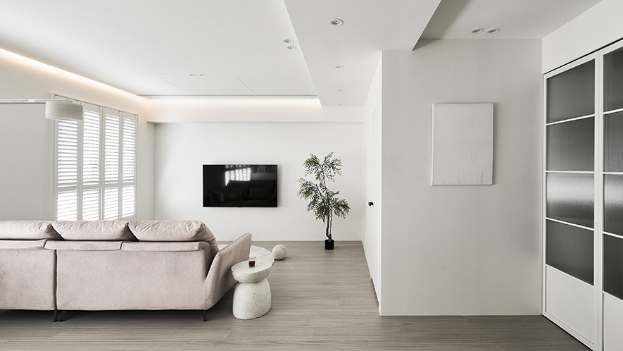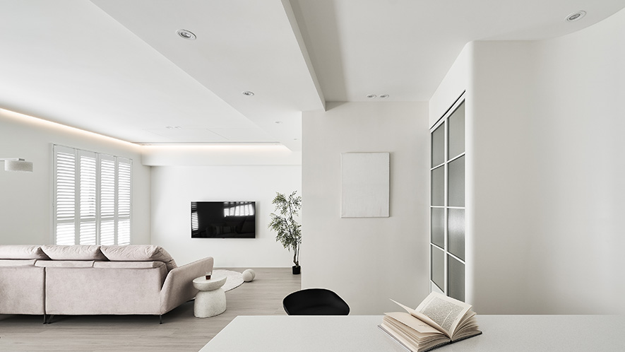 居者鍾情極簡設計,設計團隊以「少即是多」的極簡美學貫穿脈絡、「白」作為軸心:白色,象徵純淨、簡單,契合居者心之所向,剔除繁複裝飾,隨晝夜推移間顯現出白色系的微差層次,使「一抹白」隨時間顯影為流動之詩,悄然助屋主平復城市喧囂所遺留的感官紛擾。
