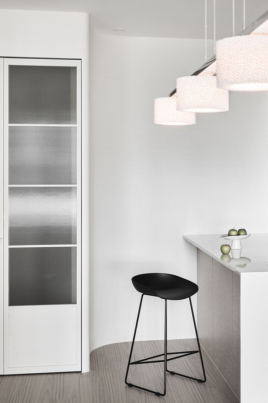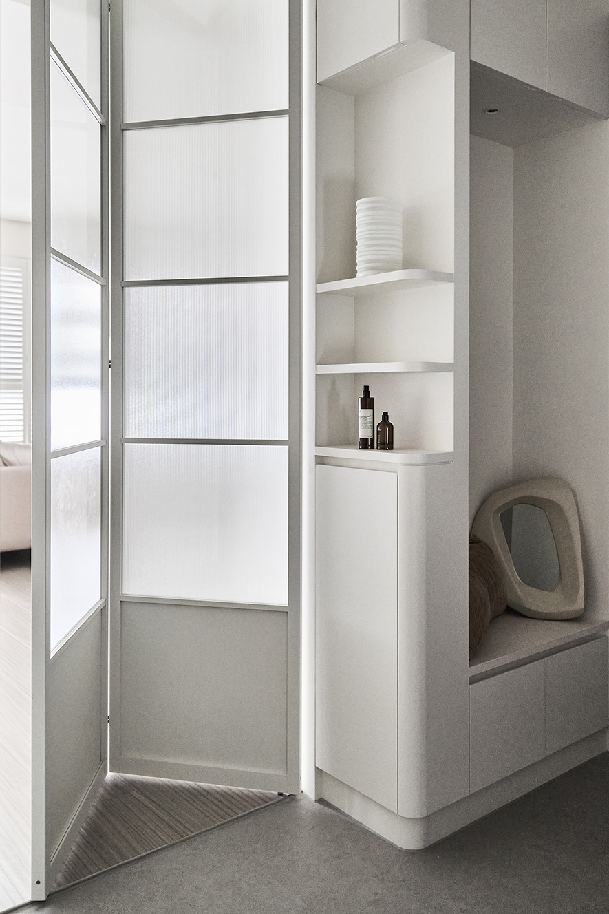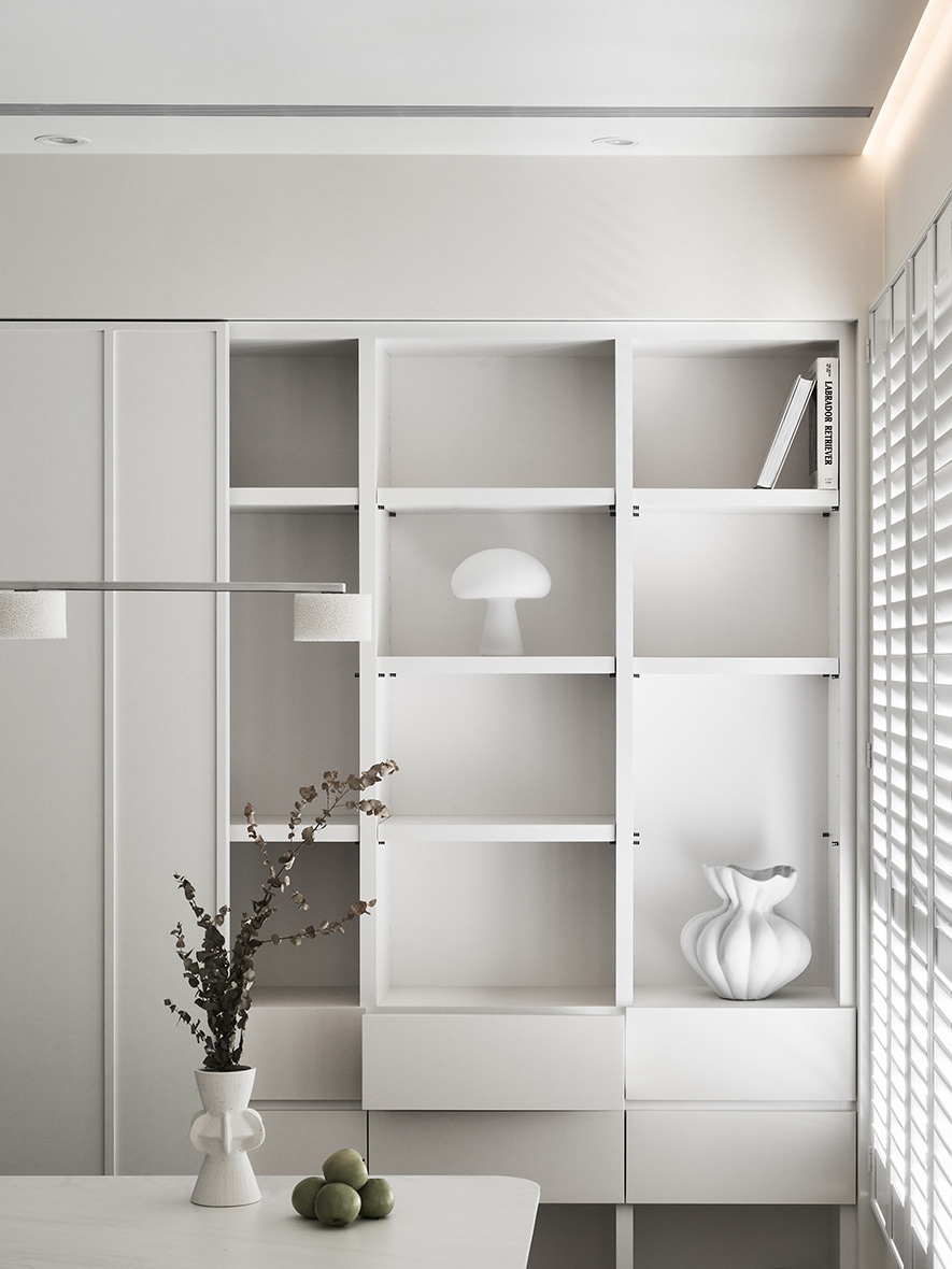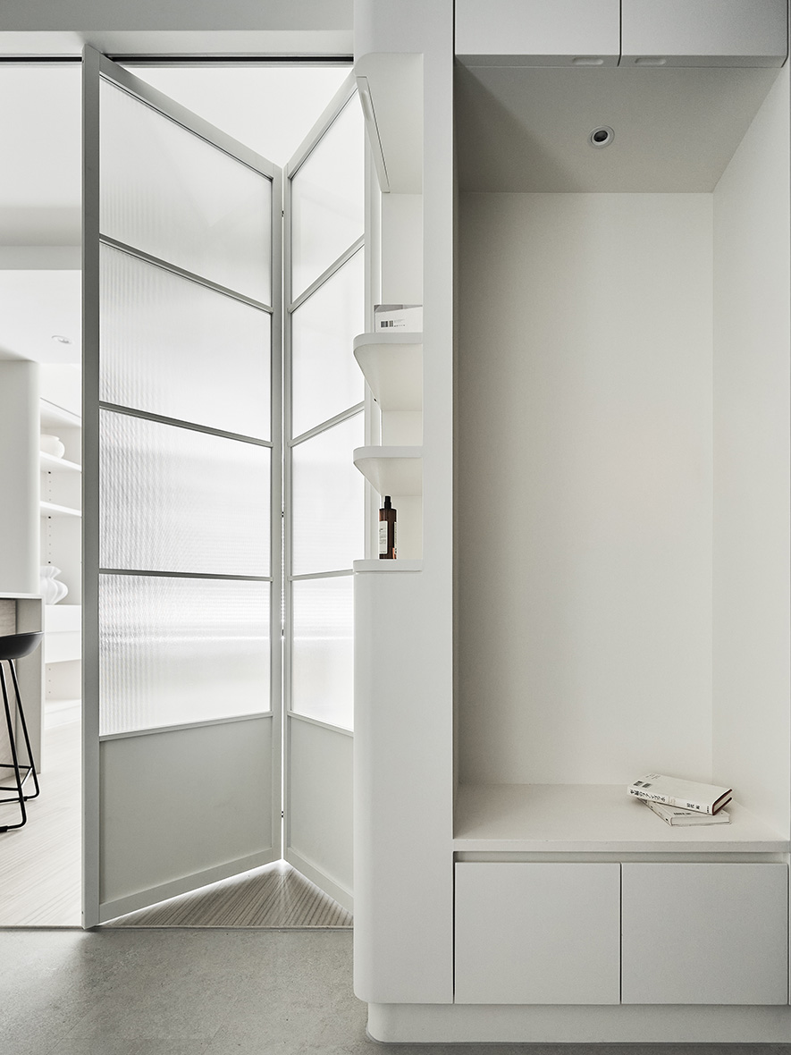 居者鍾情極簡設計,設計團隊以「少即是多」的極簡美學貫穿脈絡、「白」作為軸心:白色,象徵純淨、簡單,契合居者心之所向,剔除繁複裝飾,隨晝夜推移間顯現出白色系的微差層次,使「一抹白」隨時間顯影為流動之詩,悄然助屋主平復城市喧囂所遺留的感官紛擾。