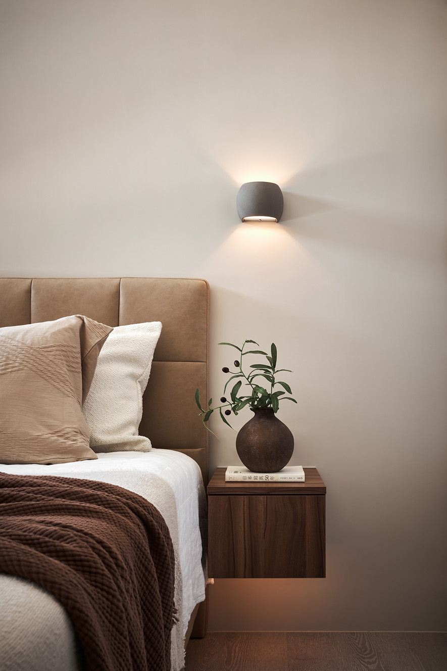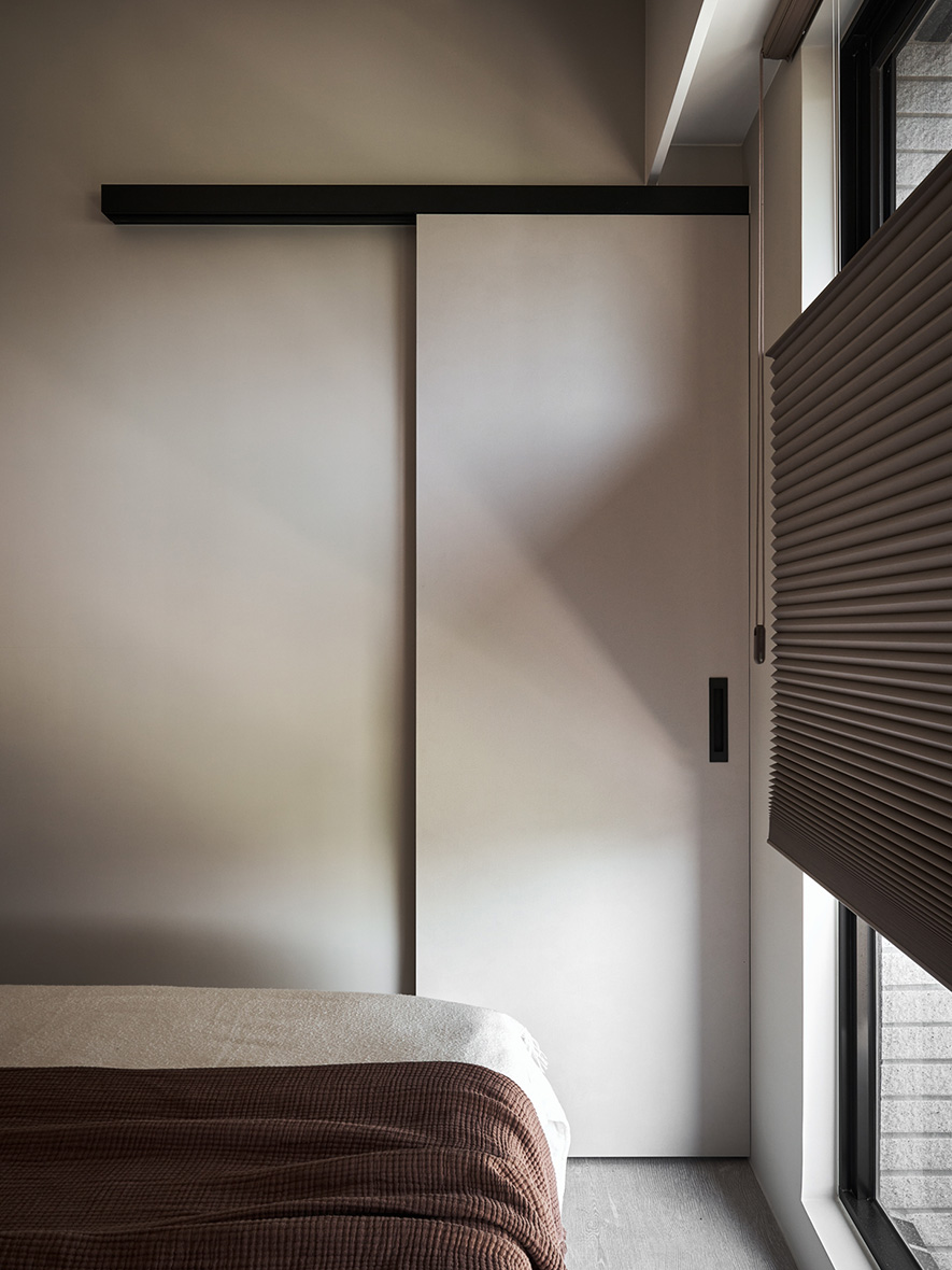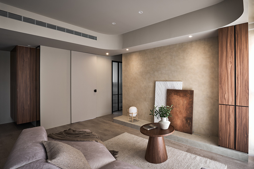 並透過間接照明、石材、鐵件來豐富空間層次,電視牆保留大面積牆面與底座使用暖、灰兩色特殊漆相互襯托,