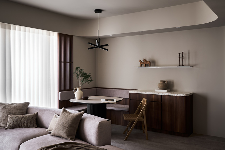 天花的圓弧元素也置入在空間中的櫃體、卡座、電視底臺,讓圓弧元素延伸至各區域中的細節處。