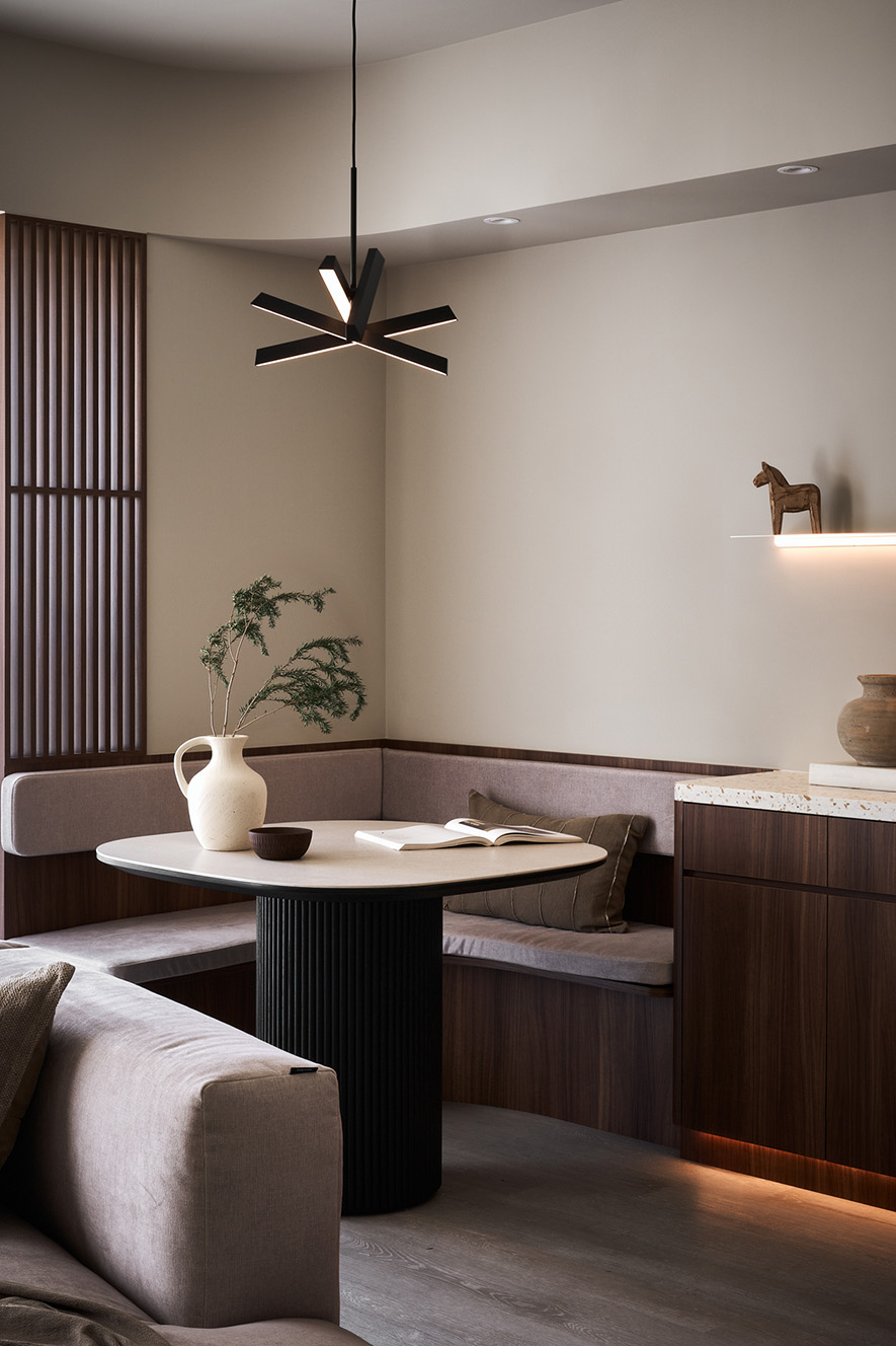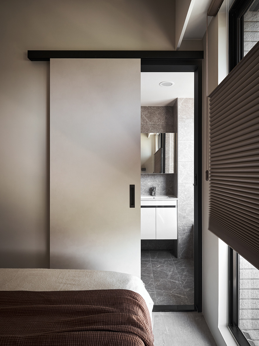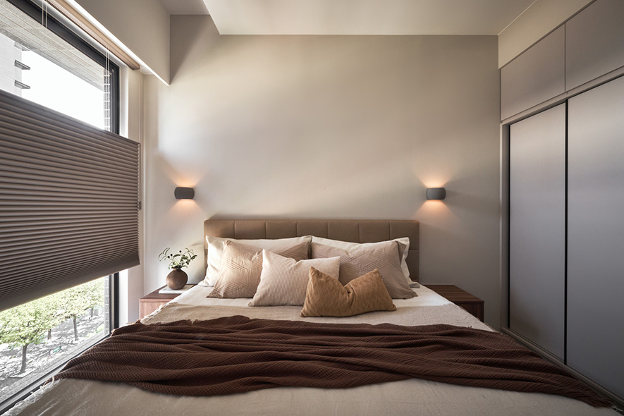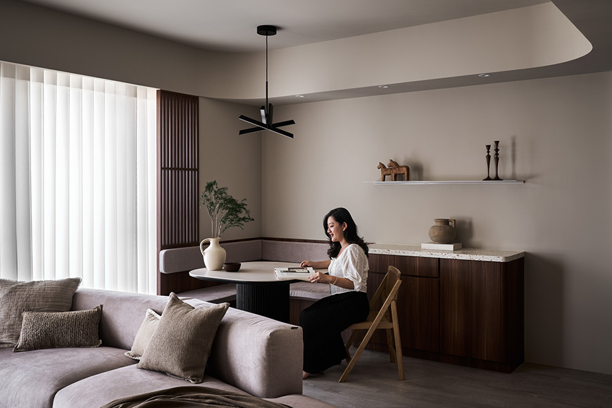 整體空間調性以暖色調為主,搭配深色木紋作為空間次要材料,