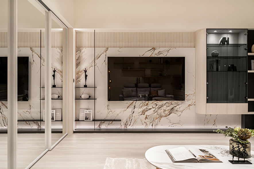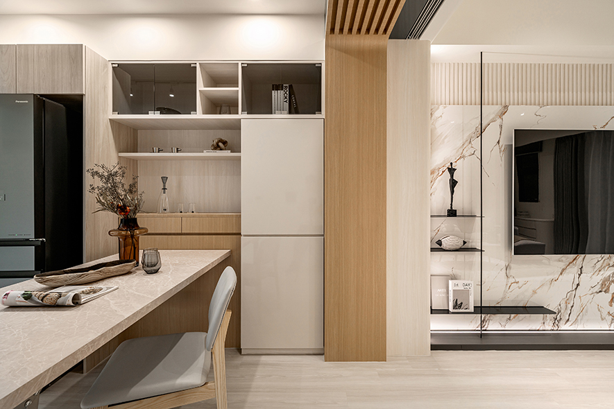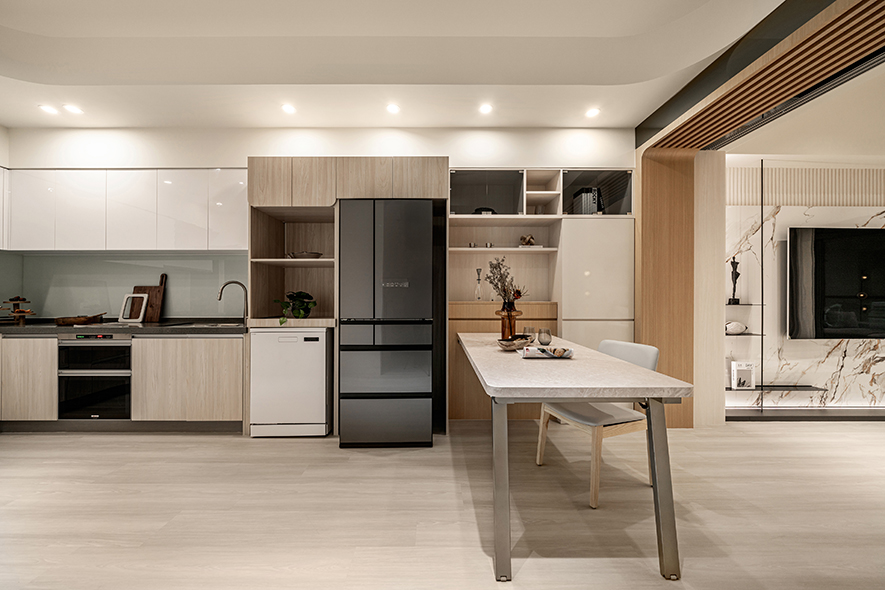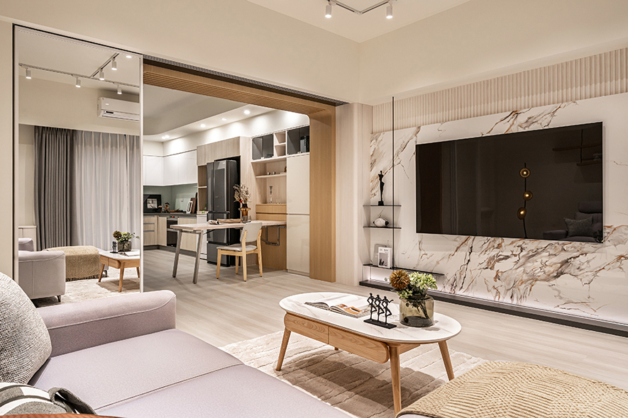 餐廚空間則透過折疊式餐桌與全鏡面拉門設計,不僅提升使用彈性,也放大視覺空間感,使生活更富層次。