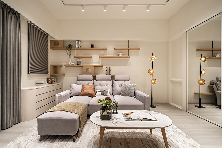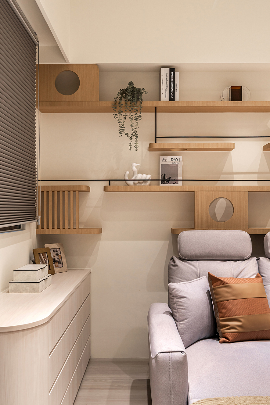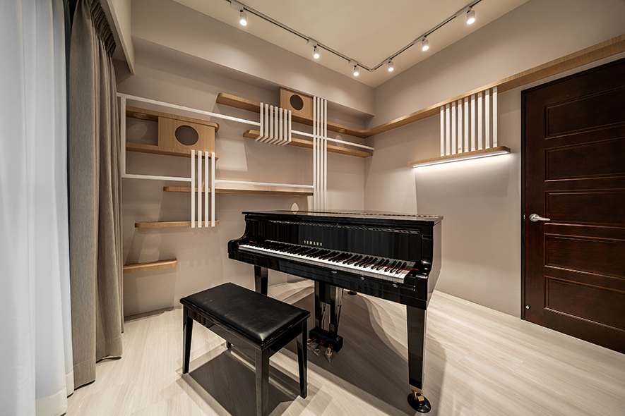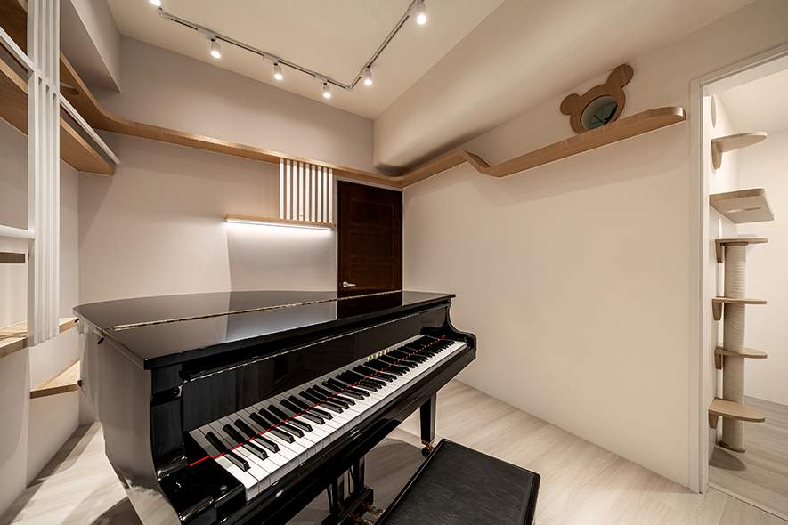 為了滿足家中貓咪自在穿梭的需求,客廳與琴房設置貓跳台與動線走道,創造人寵共享的溫馨環境。