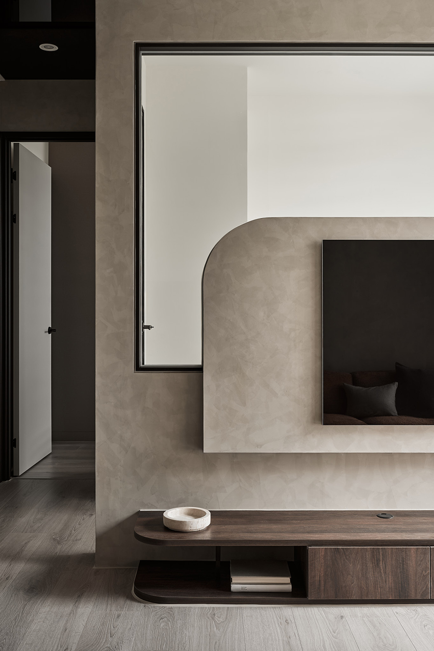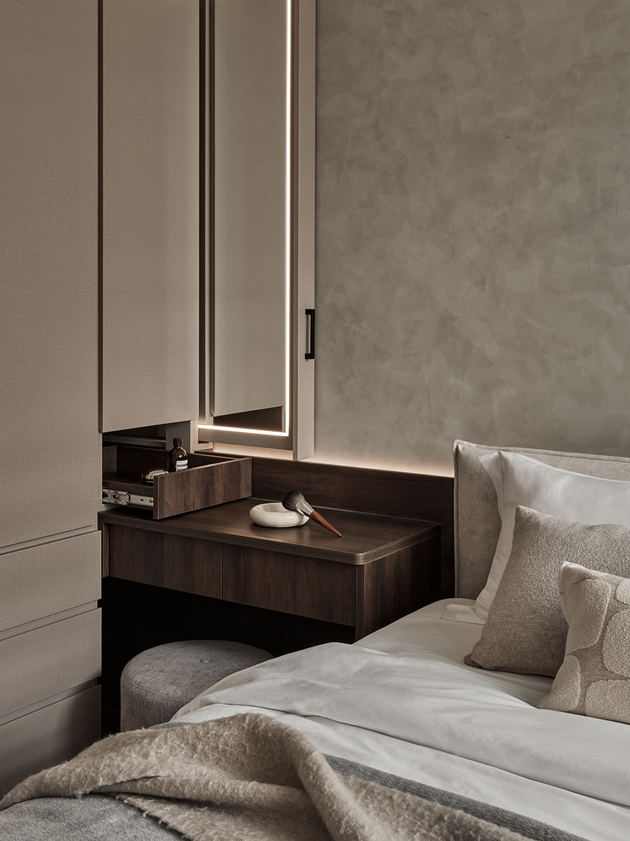 主臥室延續整體簡約風格,衣櫃內嵌隱藏式化妝鏡,使用時可拉出,不用時則完全收納於側邊,保有整潔線條。床頭板由化妝桌一路延伸至窗邊,上方牆面以特殊塗料處理,輕輕凸顯主牆質感,搭配右側壁燈,在夜晚營造出靜謐柔和的氛圍,有助於身心放鬆與入睡。