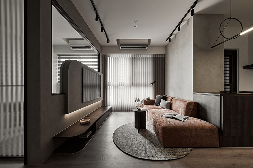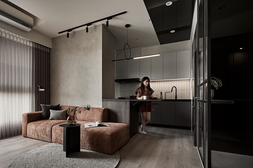 由於整體坪數有限,公共空間以開放式規劃提升使用效能。電視牆改為半高設計並結合玻璃材質,使視覺穿透、空間更顯通透;廚房區域打開為開放格局,配置中島檯面及可活動桌板,讓料理、收納與用餐更具彈性,也有效延伸空間的深度與動線流暢度。