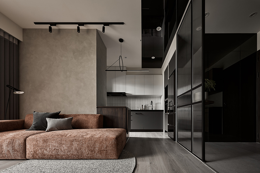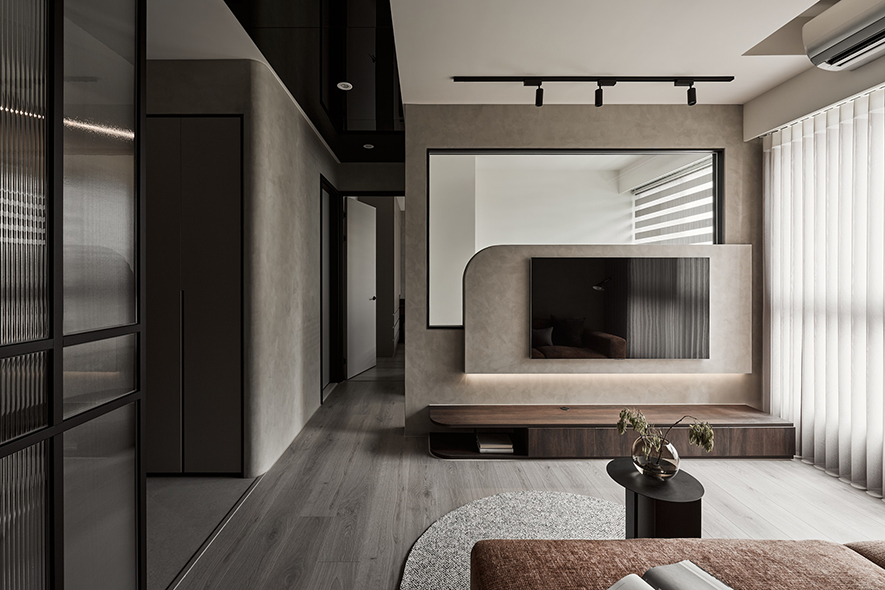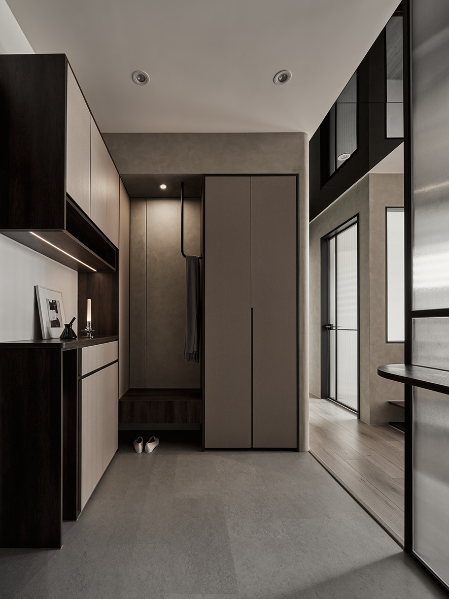 玄關區機能性強,左側整合了穿鞋椅、小物收納櫃、傘具收納、汙衣櫃與鞋櫃等多項需求,滿足日常生活的便利性;右側牆面則設置一面大面穿衣鏡,透過比例分割設計延伸屏風線條,並巧妙隱藏通往儲藏室的暗門,兼顧空間放大效果與簡約視覺美感。