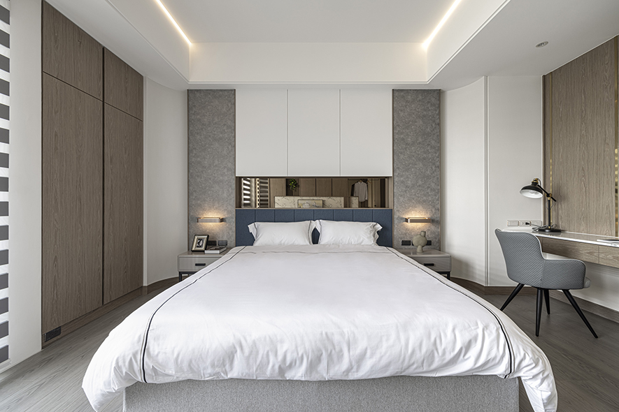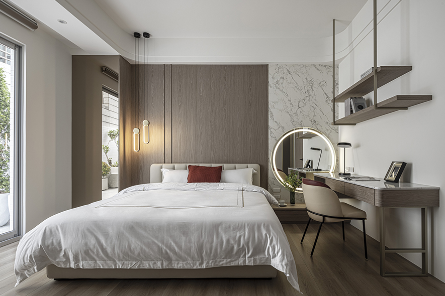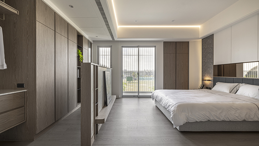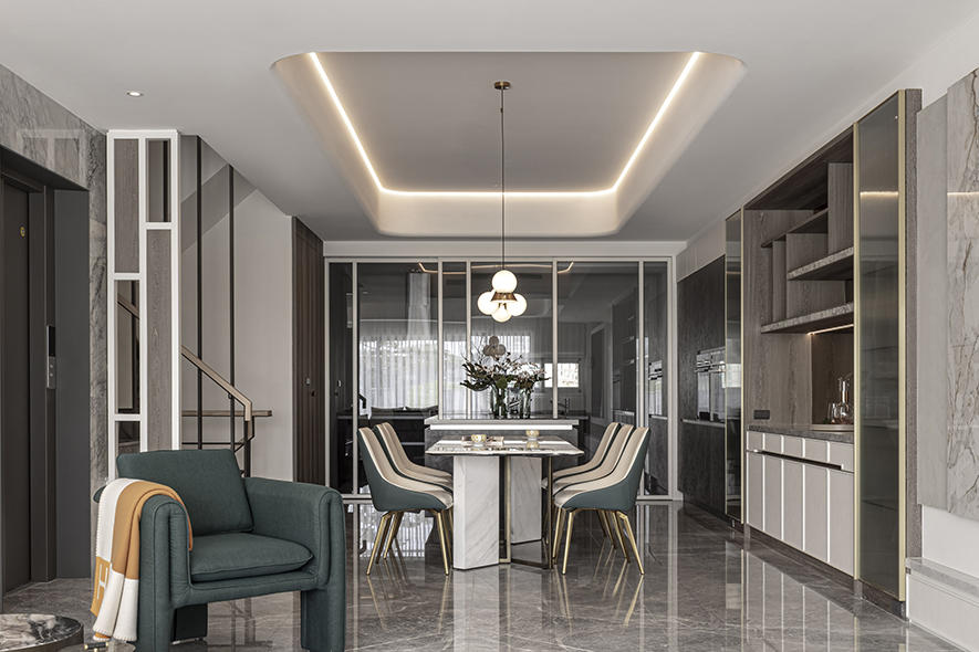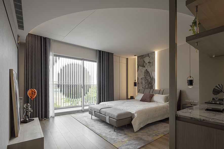 這座三代同堂的透天住宅,以剛柔並濟的設計風格形塑出動靜皆宜的美好圖景,堅毅的線條與柔美的曲面彼此交織,亮面的石材、鐵件與霧面的水染木皮相互調和,讓人在一片和諧且療癒的氛圍中,忘卻外界一切紛擾,和最親密的家人共享天倫之樂。