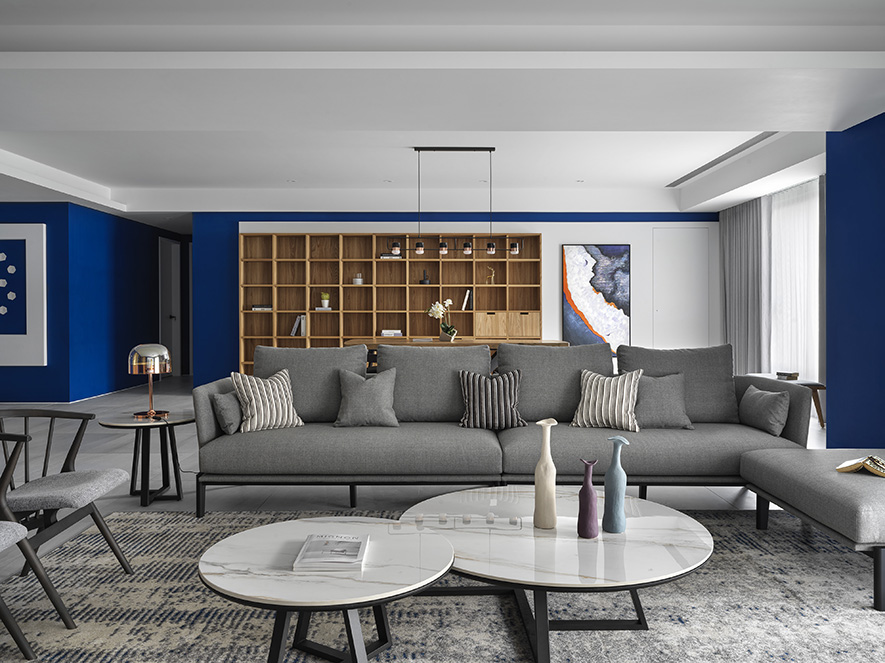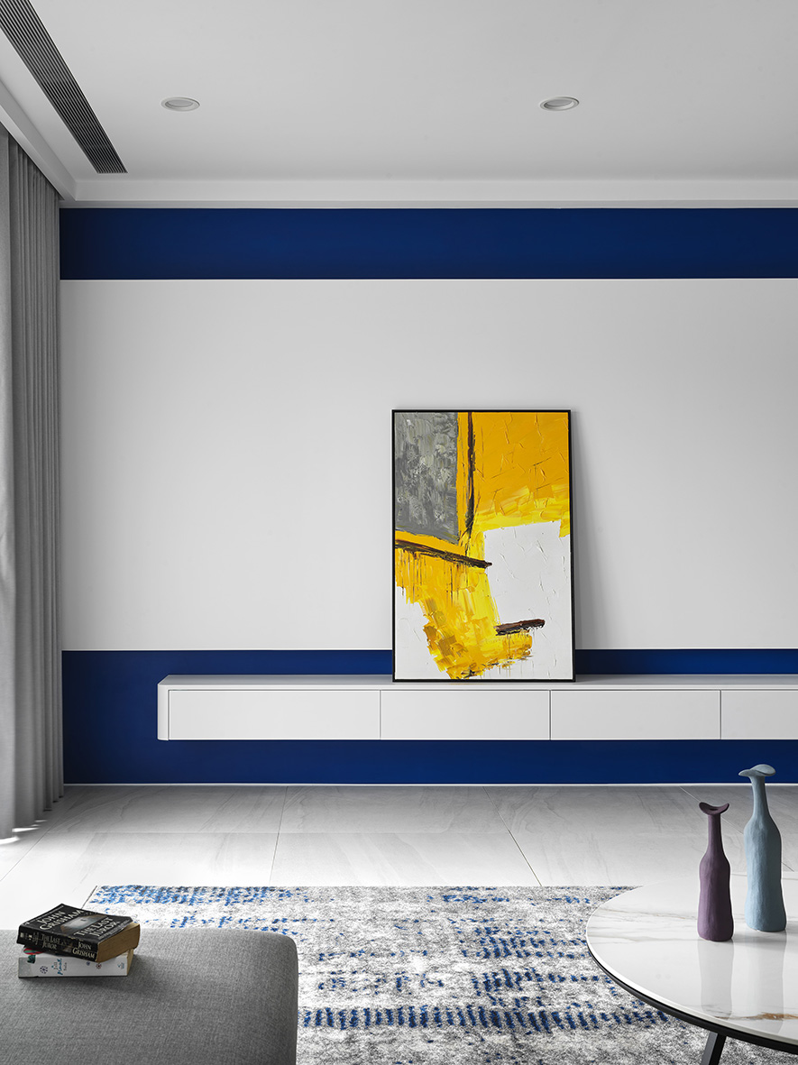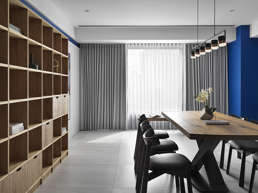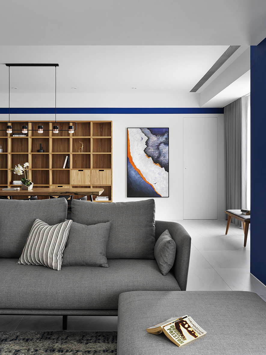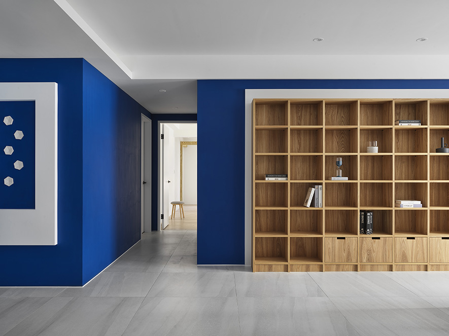 汪洋般的深藍色浸漫寬廣境地,純白與木質穿插其中,一同呈現畫面繽紛而氣氛沉穩的美麗圖景;步入其他領域,映入眼簾的是清新的淺綠、活潑的鮮黃與質樸的黑調……種種色彩紛至沓來,移步換景之間,家庭成員的鮮明性格也逐一展現。
