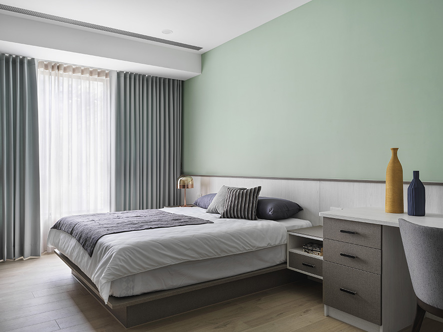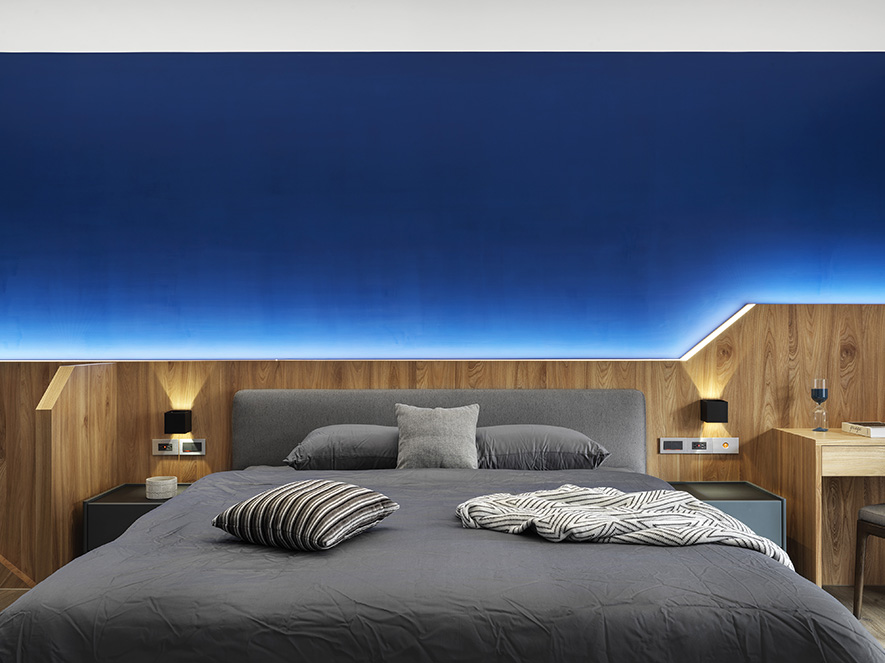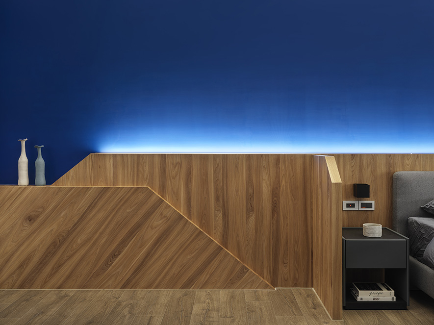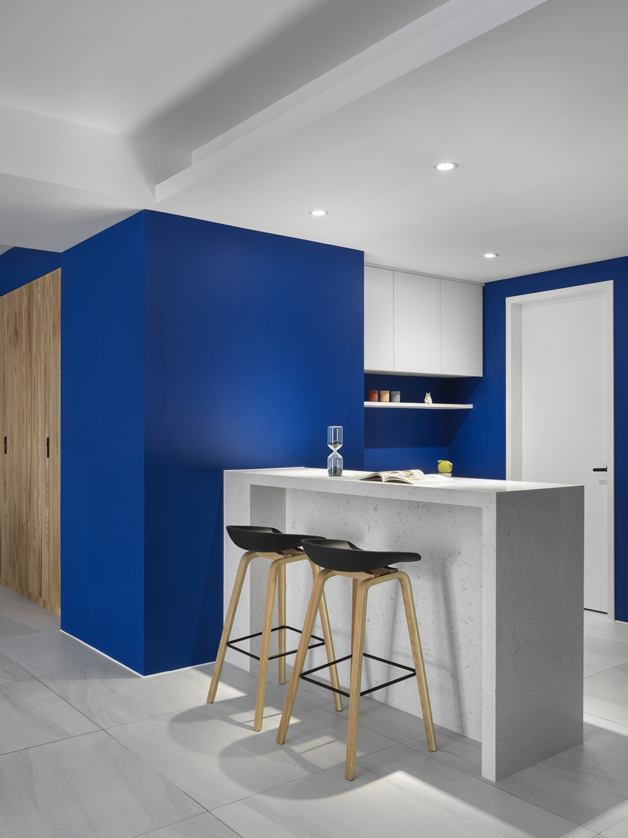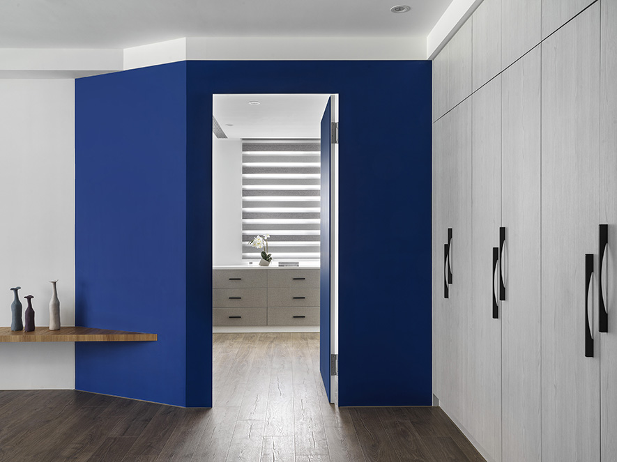 汪洋般的深藍色浸漫寬廣境地,純白與木質穿插其中,一同呈現畫面繽紛而氣氛沉穩的美麗圖景;步入其他領域,映入眼簾的是清新的淺綠、活潑的鮮黃與質樸的黑調……種種色彩紛至沓來,移步換景之間,家庭成員的鮮明性格也逐一展現。