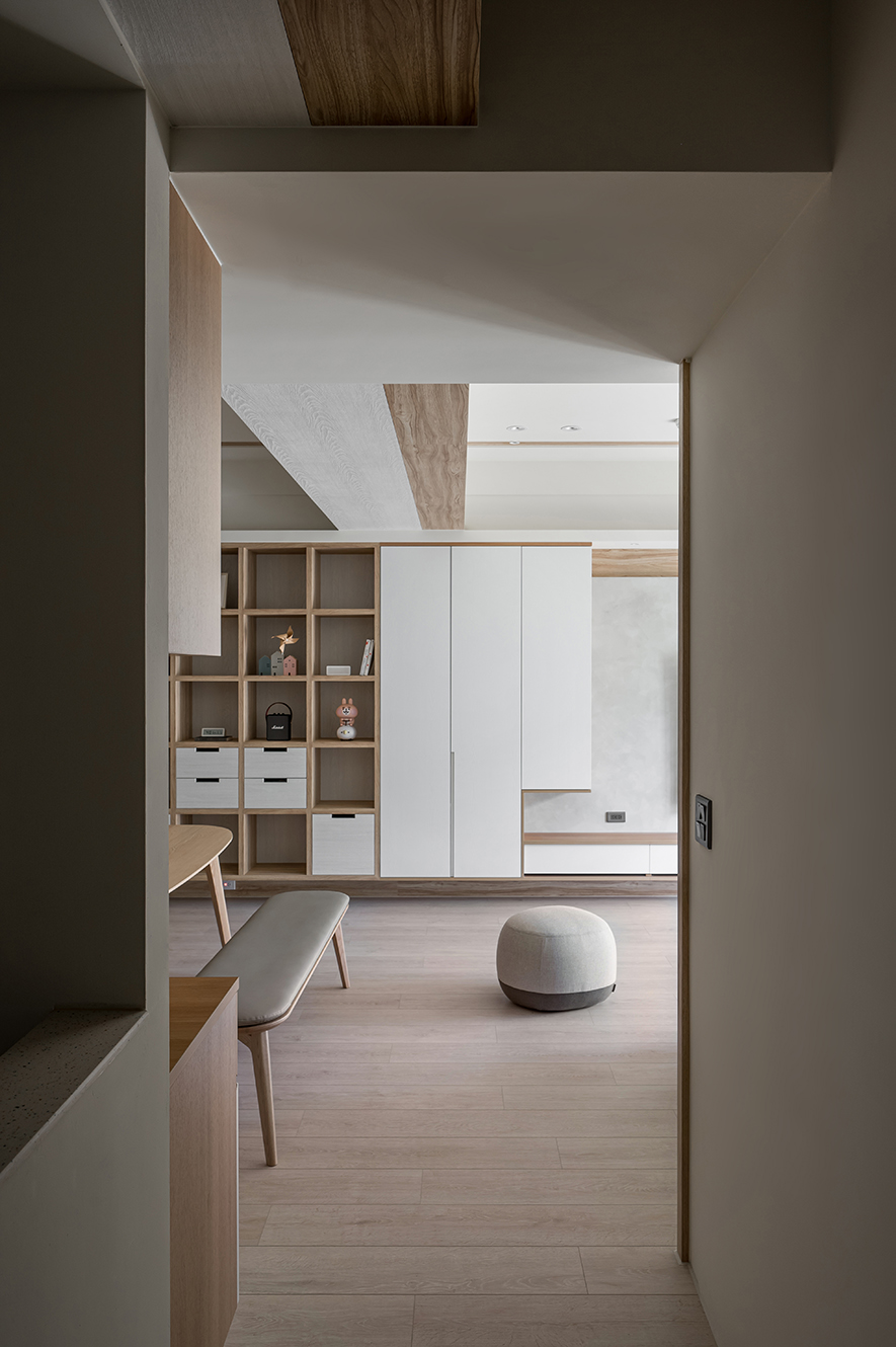 微風輕拂,晨曦溫柔照映,清光灑落一室,清新舒坦的樣貌,形成家的純粹姿態。優雅潔白,交錯以木紋,淺色調的質地,鋪展出和諧輕鬆的親情敘事,沉浸共伴時光於簡約線條勾勒之中。