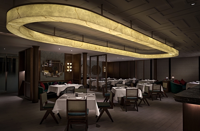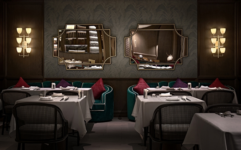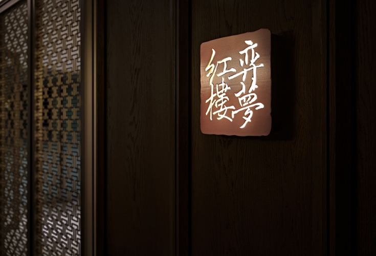 呼應商空主打的粵菜佳餚,以及品牌名中的「紅樓」二字,設計師由經典文學《紅樓夢》之章節〈壽怡紅群芳開夜宴〉發想,將宴中高朋滿座、人來人往的歡笑畫面,與調和多元文化的老上海風格重疊,以昏黃朦朧的微光,烘托木皮、藤編、雕紋屏風等中式元素,佐搭線板、鍍鈦鐵件及各式燈具,造就東西合璧的繁華宴景,賦予訪客重返1920年代十里洋場般的沉浸體驗,也透過異材展顯古今並存的混搭美感,象徵餐廳持續創新懷舊餐點的經營理念。