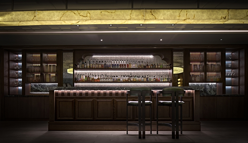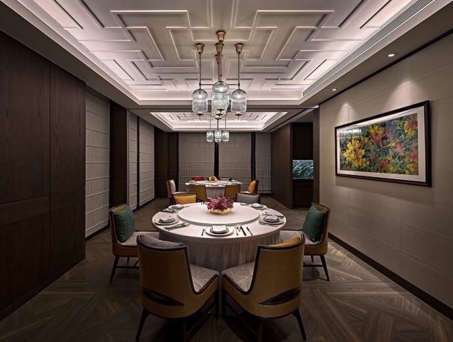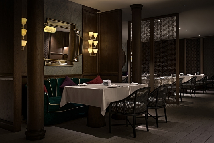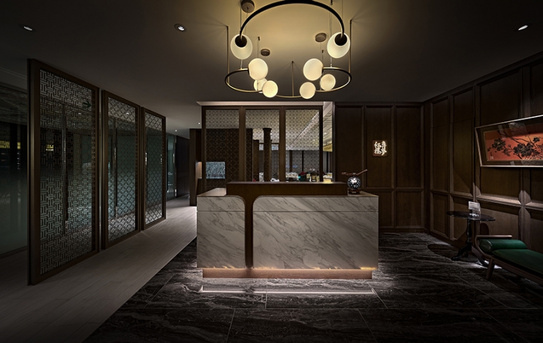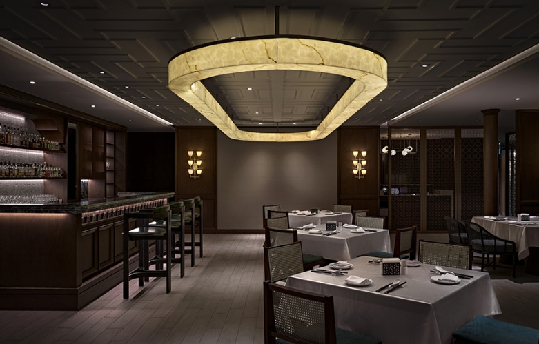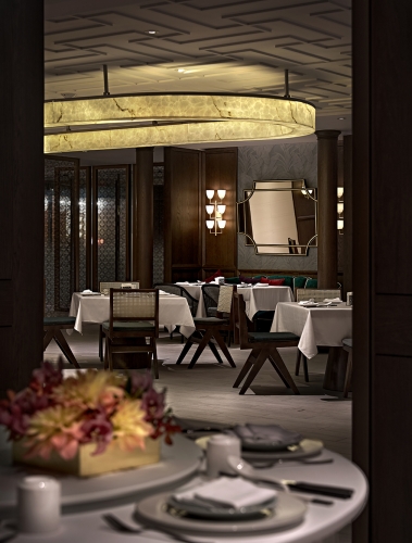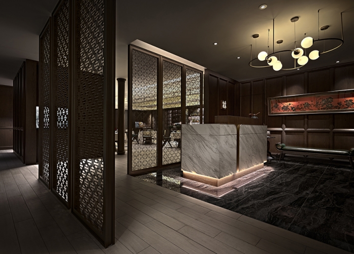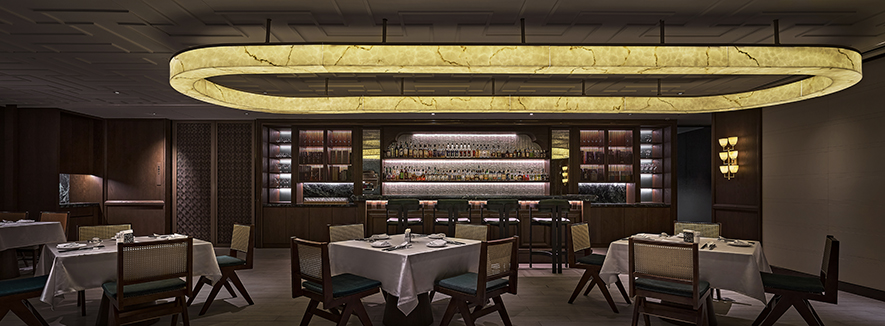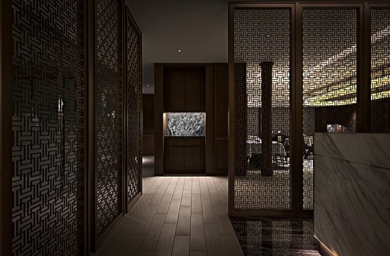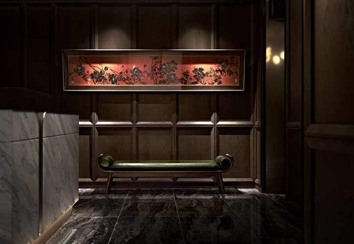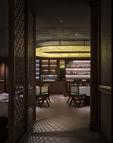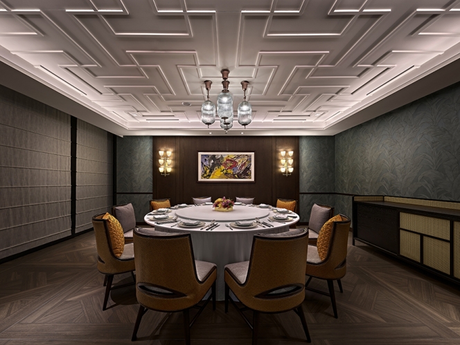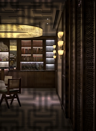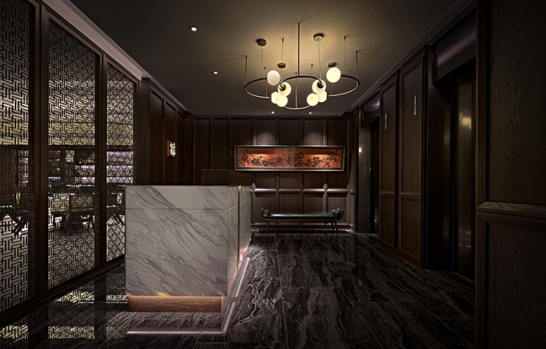 由淺白色系的飯店大廳乘搭電梯,僅是數秒間的樓層轉換,便抵達二十世紀初期的上海──眼前,天壁精緻球型吊燈搖曳柔光,灑落一派清幽,伴隨地坪富麗石紋、壁面深沉木韻的謐靜雍雅,開展現代交融復古的對比趣味;優美大氣的迎賓氛圍縈繞身側,恍惚間,宛如踏入熱鬧迷人、而又似虛若實的異國租界中……。