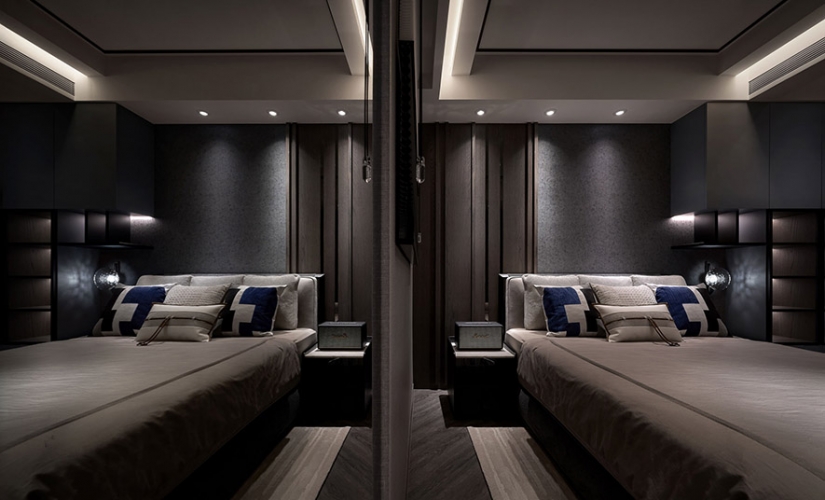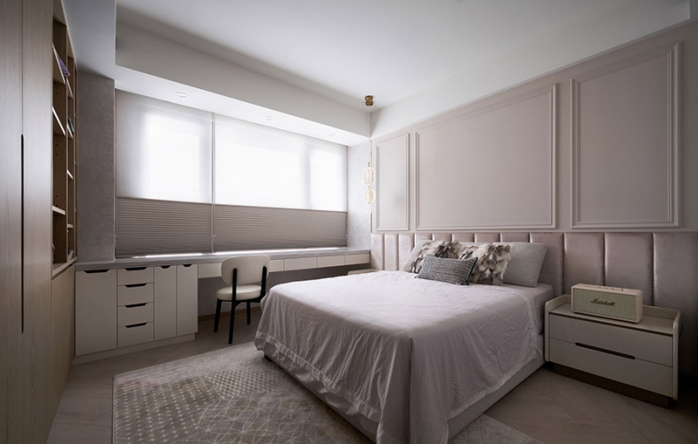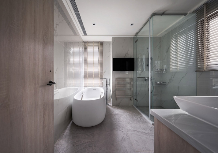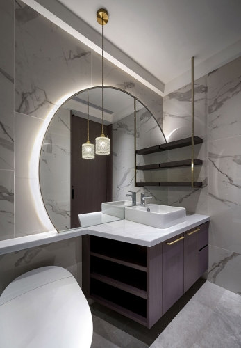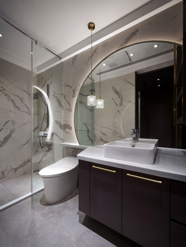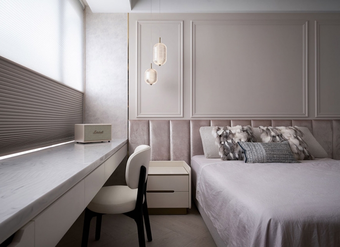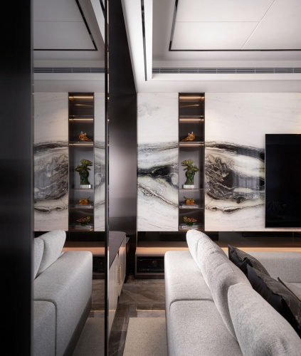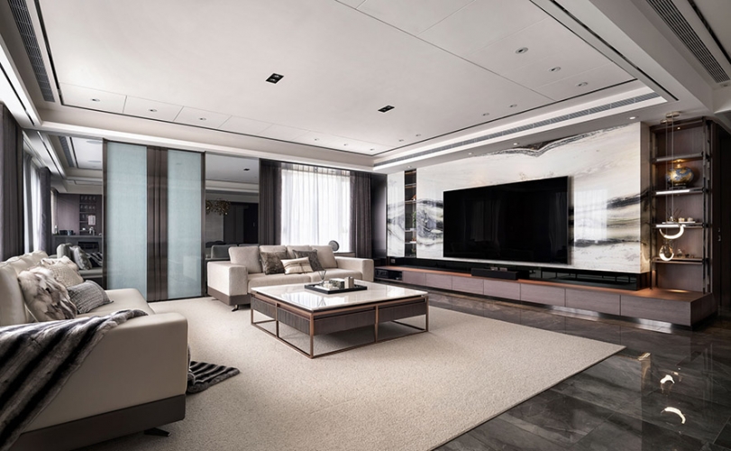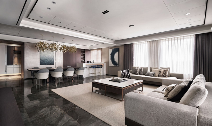 團隊以暖灰色調鋪陳公領域的基底,呼應米白色大理石電視牆,其牆面紋理流轉,勾勒臥龍盤踞之韻,將窗外基隆河的靈動姿態化為長龍意象延展入室,淬煉時尚奢華意境之餘,象徵吉祥與福氣。公共區注重開放互動,便於家人共享、彼此陪伴,並匯入數盞圓形、半圓形吊燈,以此寄託「家的圓滿」美好祝福;私領域則注重功能與個性結合,透過各式紋理壁紙、窗簾及軟裝細節,形塑現代精緻多樣的生活面貌。
