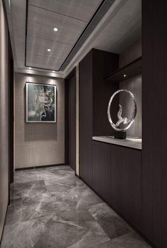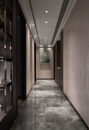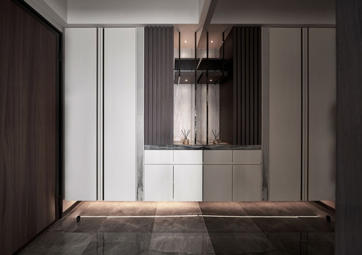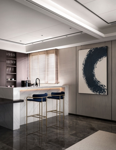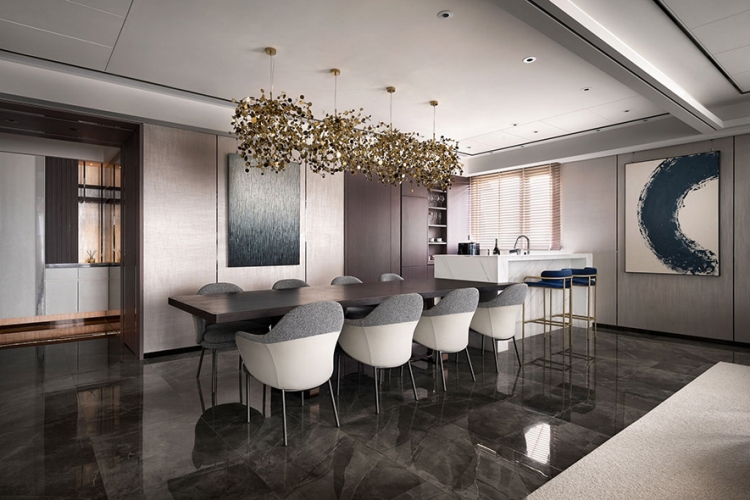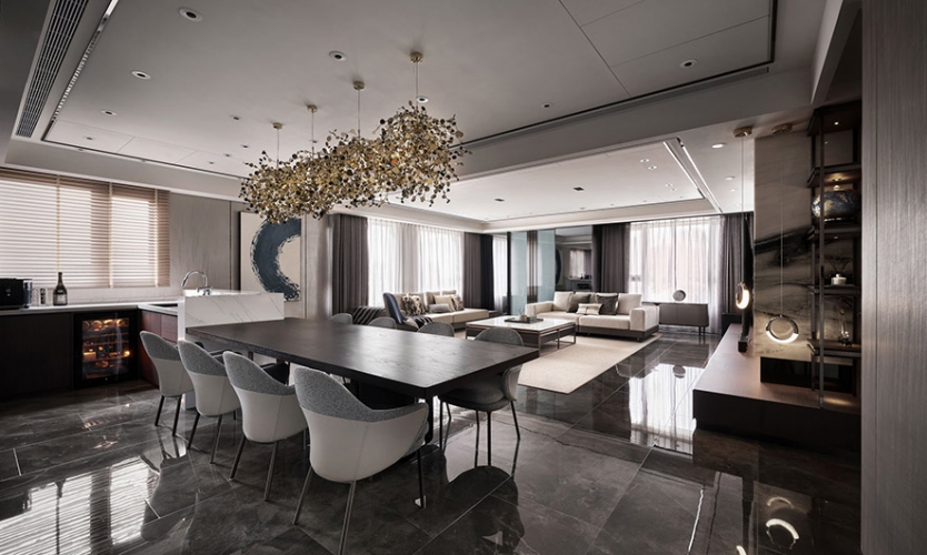 灰色基調與鍍鈦金屬元素交織,築起一片靜謐都市桃源。溫暖木質遍布其中,增添居所自然溫度與情感厚度,且藉細膩金屬亮片及藝術吊燈,光線穿透層層堆疊折射,變幻迷人層次,若城市中星光閃耀,同時點綴大理石和原色木皮,將現代奢華融合細緻優雅。寬敞公領域使家人自在相聚,共度溫馨愜意。