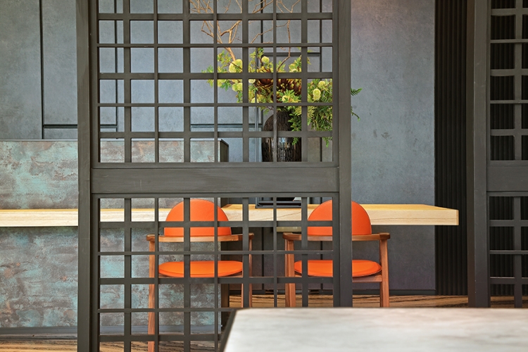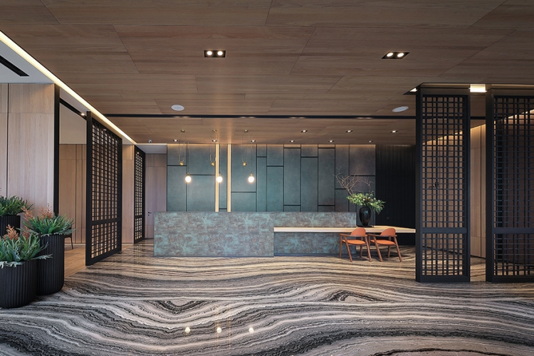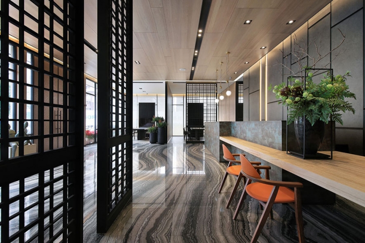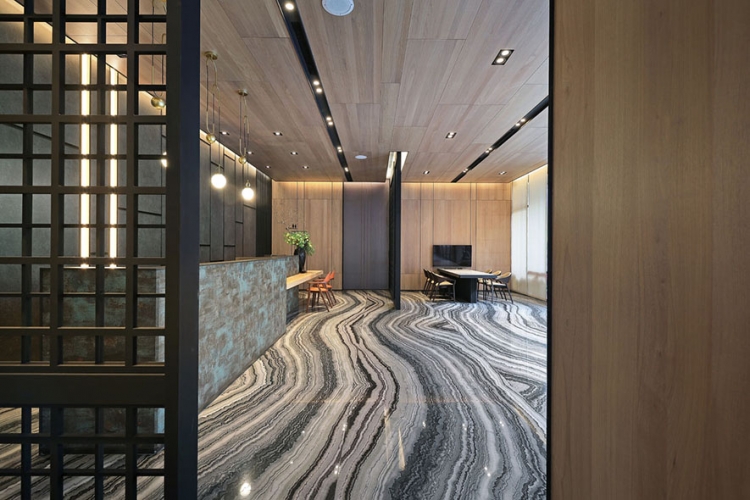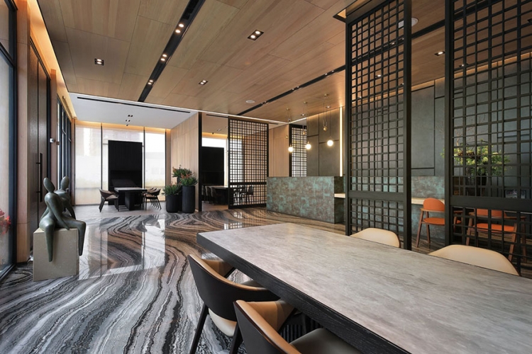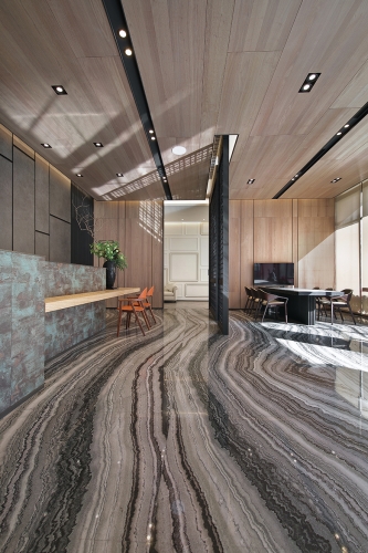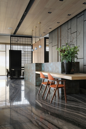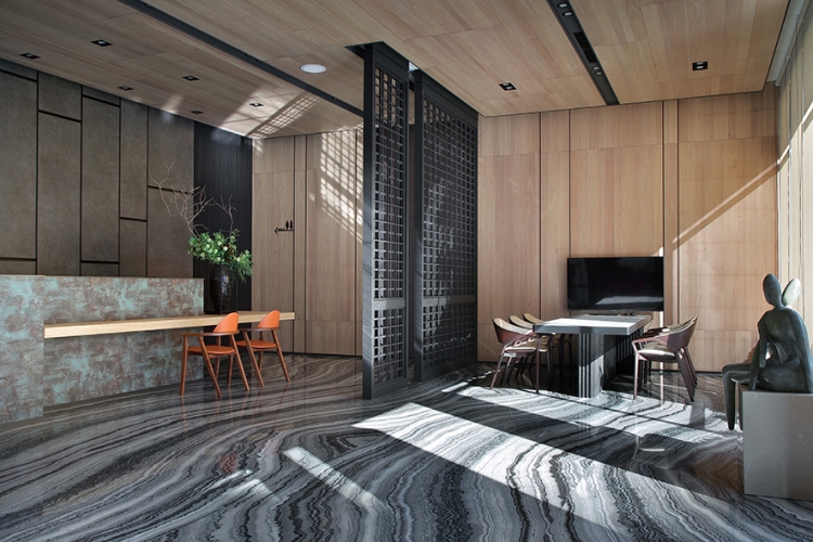 足下墨白交織的華美石紋,既似流水潺潺,又如雲彩翻舞,眼前屹立的青綠色岩壁,則仿若綿延的堅實山峰;步入這座山水環抱的雅緻境地,欣賞綠植、藝品的優美姿態,自然氣息與人文風韻油然而生。包裹木質的寬廣天壁,溫和地迎接賓客們攜手家人到訪,一同沐浴於格柵篩洗過後的唯美光影中,暢想未來的家庭生活願景,與此同時,也可慢享一杯好茶,共度禪風十足的靜好時光。