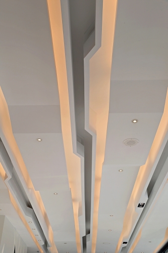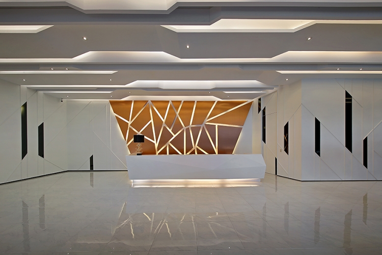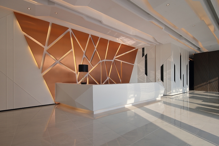 輕啟大門,閃爍古銅光澤的幾何立面烙印眼底,奪目的別緻質感醞釀一抹獨到的藝韻,而不規則線條間流溢的朦朧瑩光攜手上方間接照明,烘襯天壁秀麗精美的流線造型,創造宛如粼瀲波光的靈動光影,為空間灌注清朗活潑的新穎形象。
