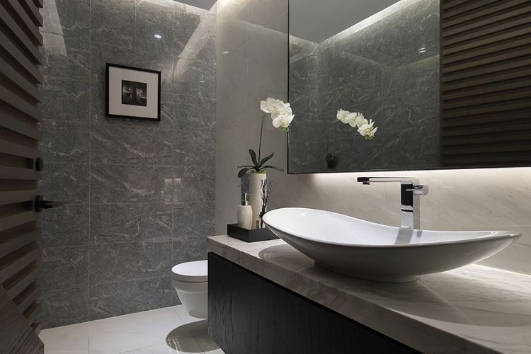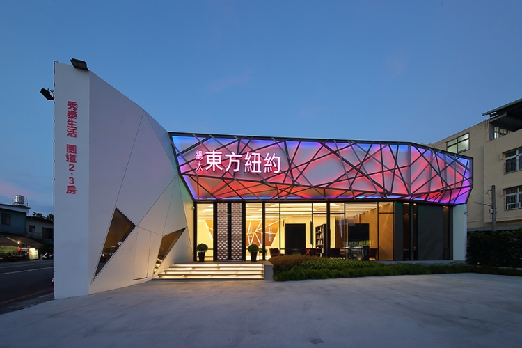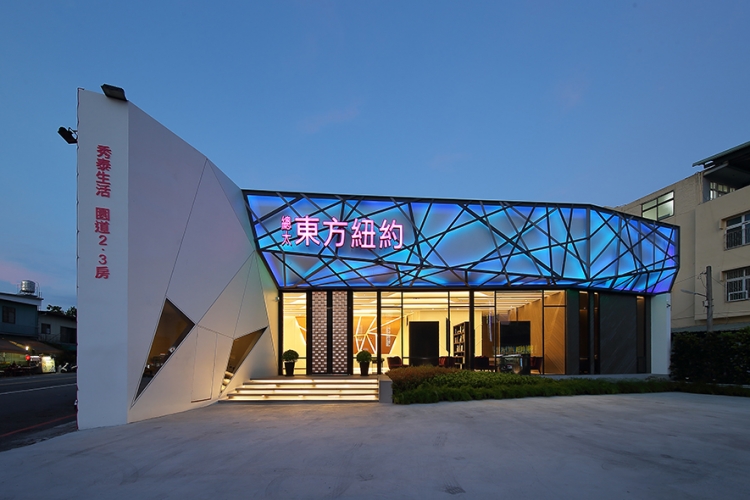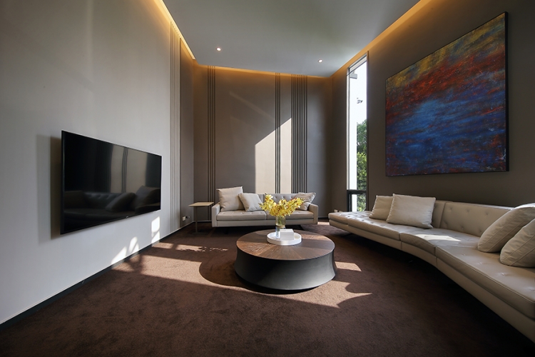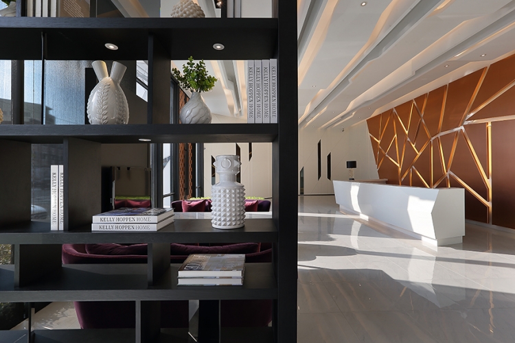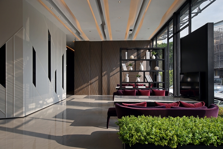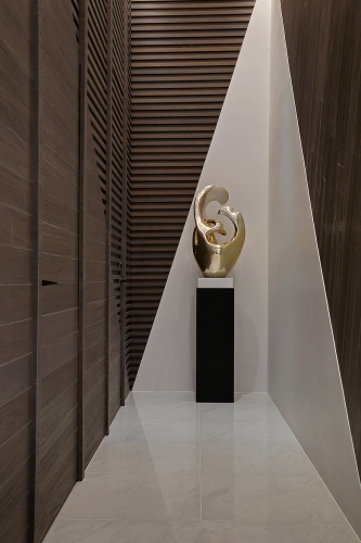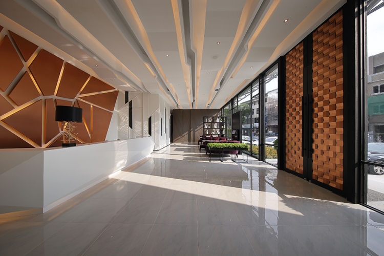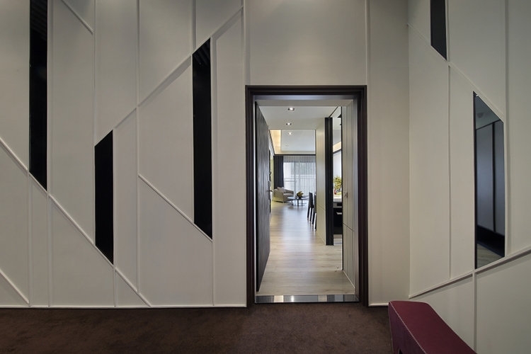 自接待中心推廣的建案名稱發想,設計師於本案白色基調的立面、天壁,匯入平行垂直及縱橫交錯的直線,其間局部點綴時尚黑鏡,彰顯線形滿盈個性的豐富俐落層次,同時呈現歐美都市大樓林立的玻璃反射感,並於深處端景選用暗褐木皮,發散東方風的沉穩寧靜氛圍之餘,細膩木紋更透過延續線性元素主軸,令分別代表東西方的樸實與現代設計語彙交織、碰撞,塑造此處獨樹一幟的複合美學。