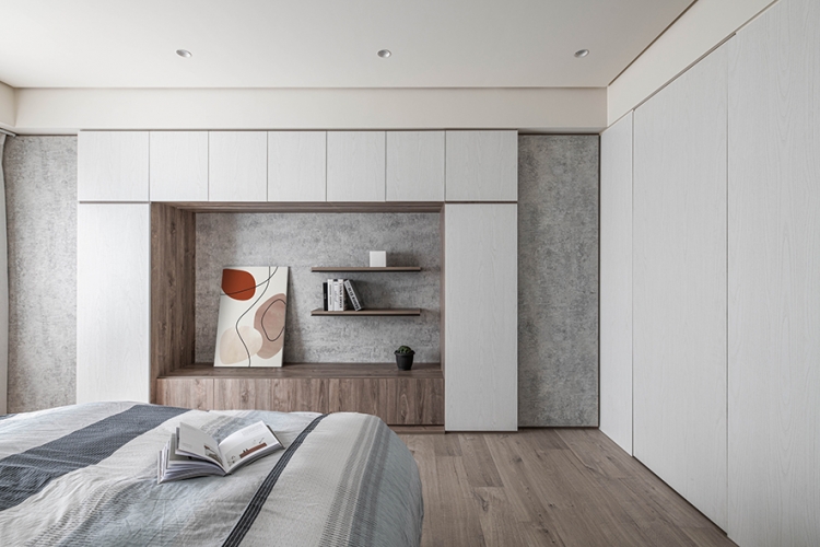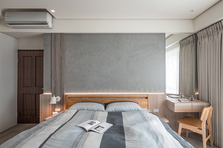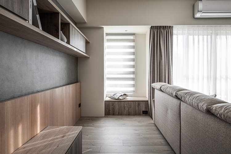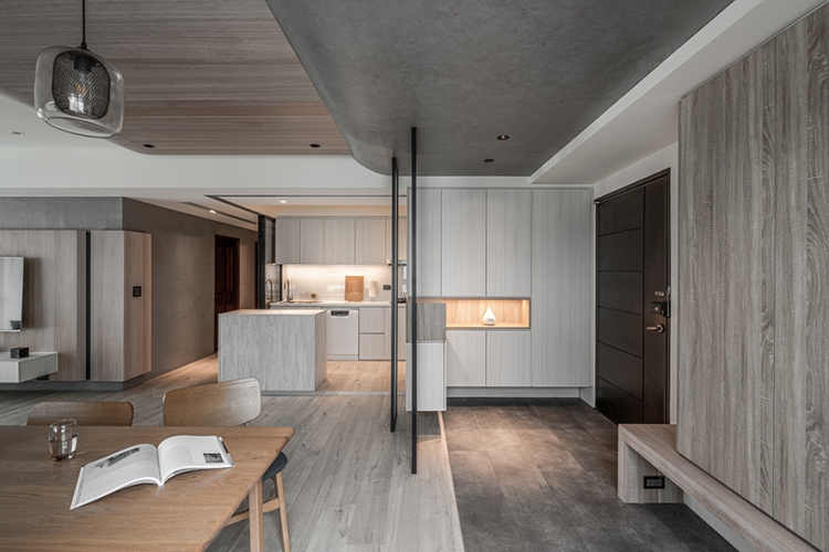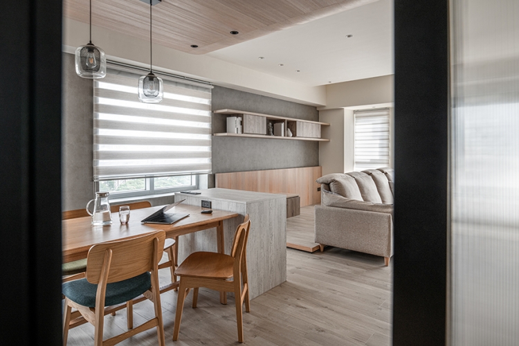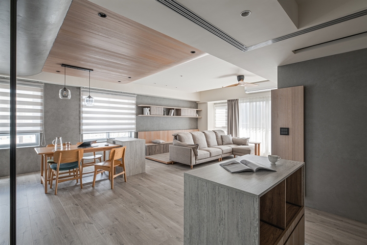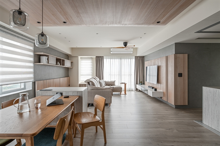 我們運用擅長的意象式設計,將高樓窗景轉化為層疊而上的天花板造型,形塑雲氣排開般的遼闊場面,巧妙結合清水模、實木皮、水泥漆三種材料,詮釋天地相映的風貌,並規劃彈性空間與休憩機能,打造恬逸的世外桃源。