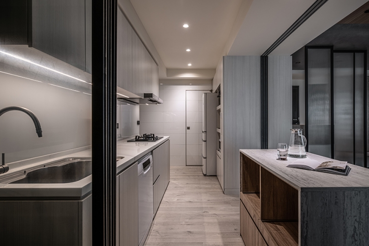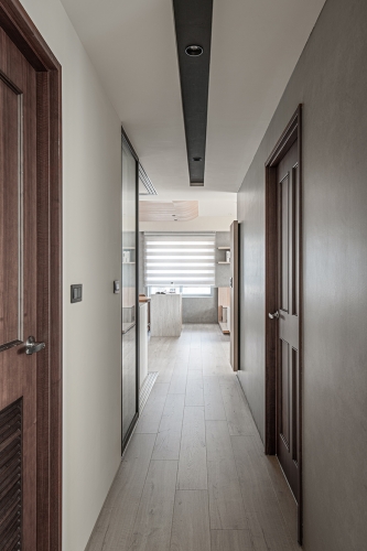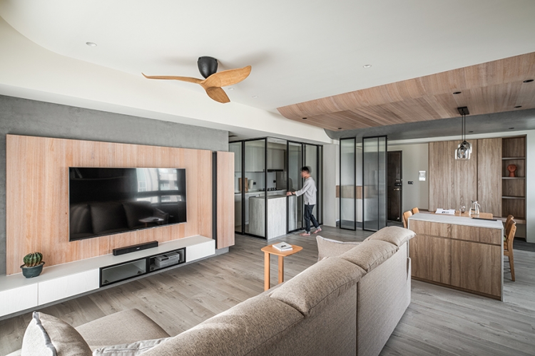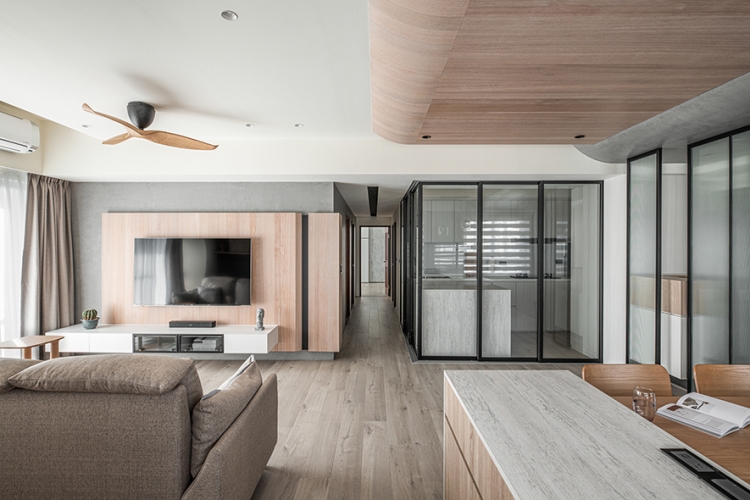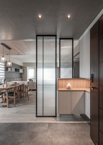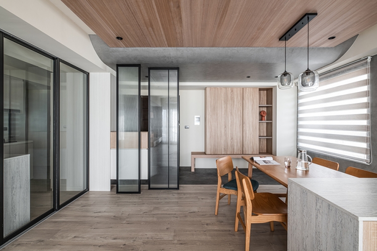 將窗外藍天與雲層景色融入設計,遞增玄關、餐廳至客廳的天花板層次,同時修飾圓弧的流線輪廓,形塑天空逐漸開闊的意象畫面,勾起居住者與外在環境的聯想與共鳴。在空間規劃方面,依循場域軸線分配各區寬度,規劃順暢有序的動線,並於廚房隔間選用透明玻璃材質,開拓公領域清晰相通的視野,自然促進家庭成員交流情感,創造舒適安心的幽境。