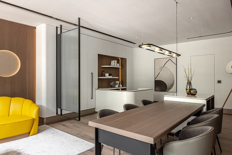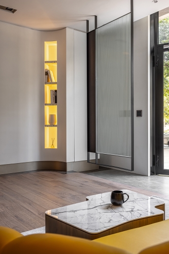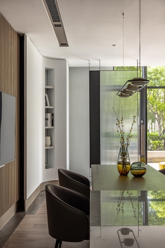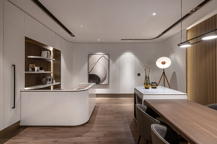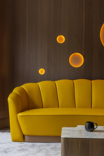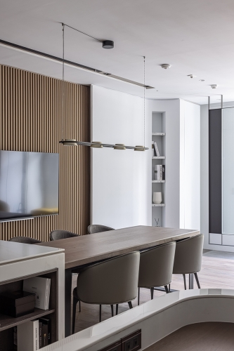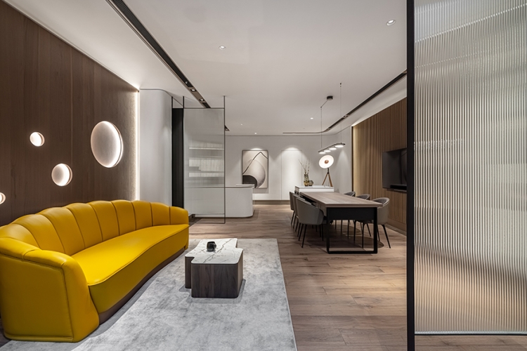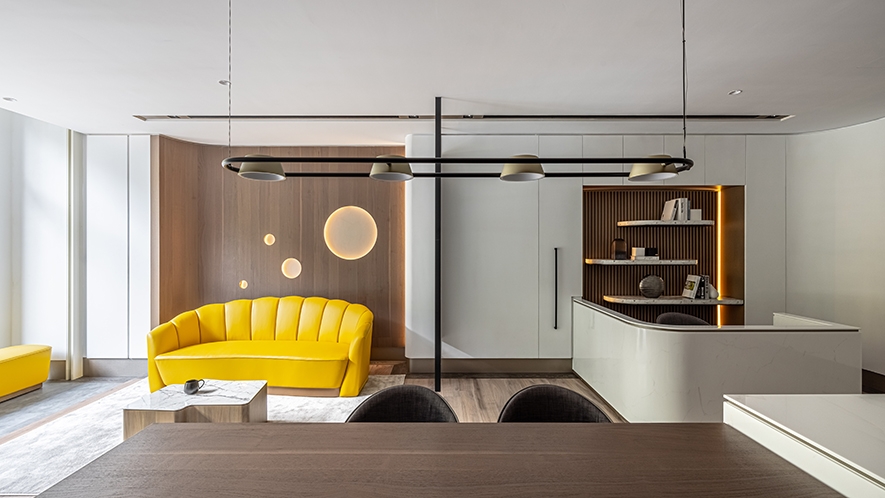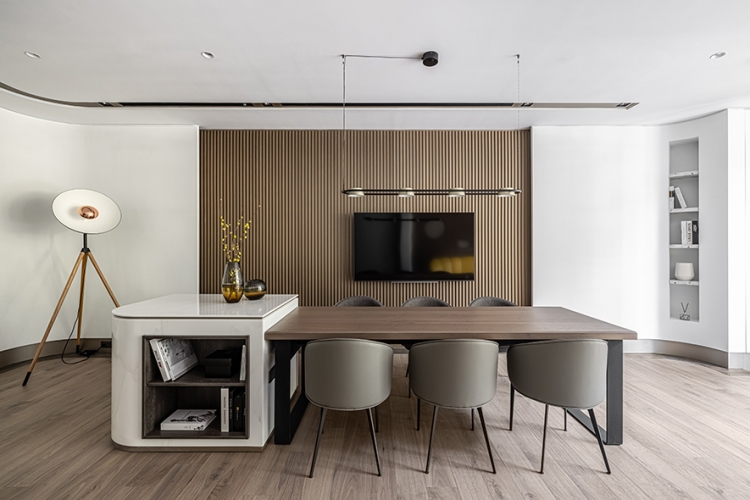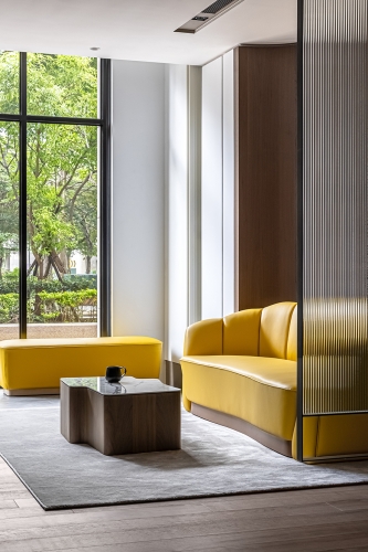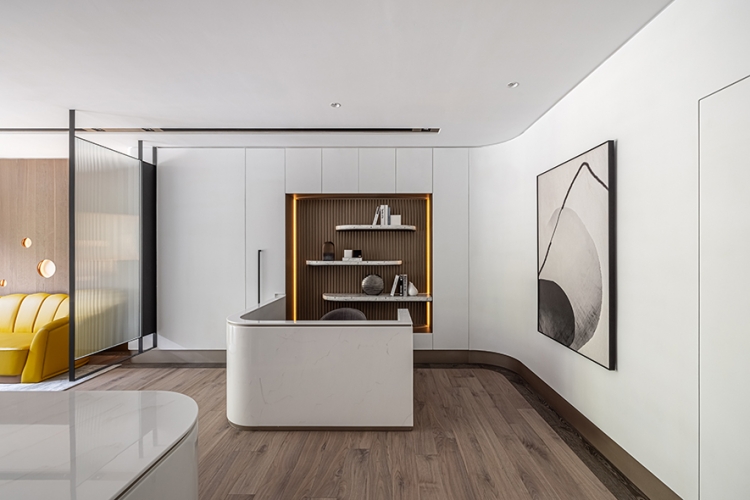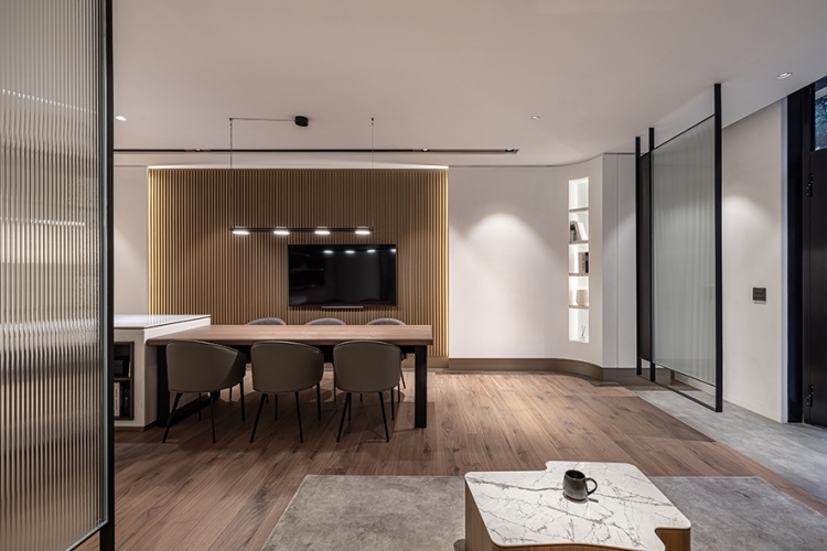 天花板銜接立面處與燈溝,以及梁柱、辦公桌、茶几和角落展示櫃,皆採用圓弧元素,呼應空間主軸的天然原石曲線,而會議桌上方的吊燈、討論區角落的落地燈,更透過不同形式的圓形、弧線造型,一同串連整體豐富的視覺設計。
