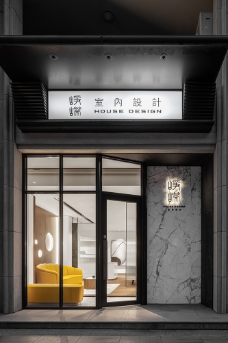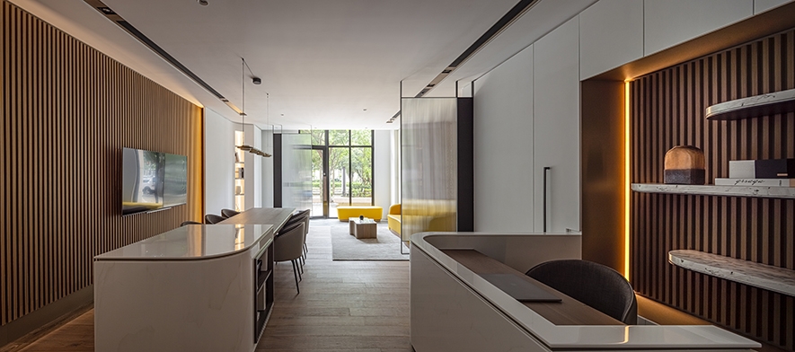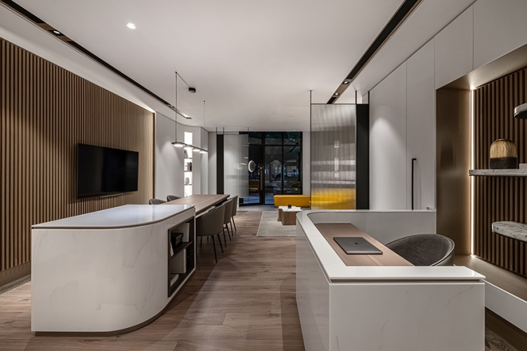 建築外觀、茶几、收納櫃與接待櫃台區半牆的石紋質地,以及壁面的潔白色彩,將空間的硬軟裝,形塑為海灘原石的樣貌,而立面的實木皮與實木格柵,擬作石頭層理,結合線形燈、美耐板光澤,使內部隱約透出燦爛光輝,闡述映射天然美質的品牌底蘊;木質建材搭配實木地坪,藉由直線紋路,傳遞有條不紊的品牌特質。