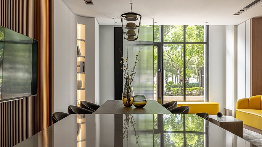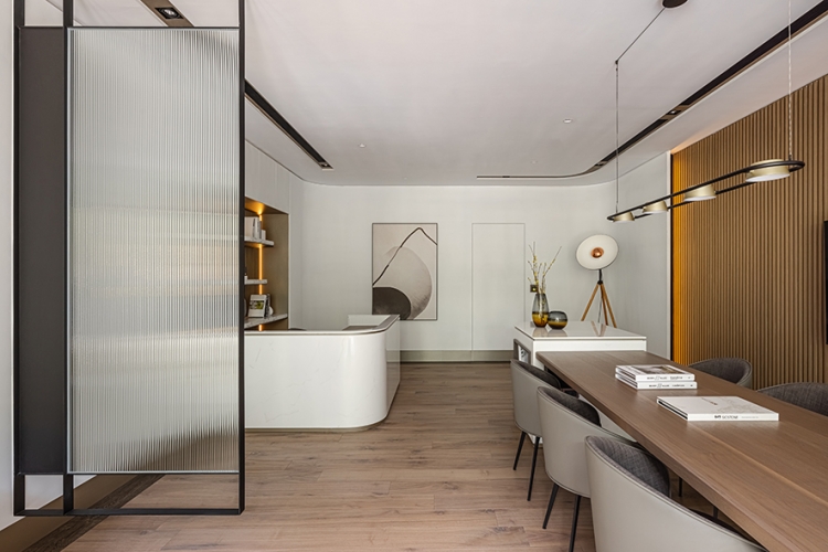 辦公室規劃為開放式格局,呈現寬敞的視覺感,且將空間重點的討論區劃分一側,另一側並排會客區、接待櫃台區,再以鐵件外框的長虹玻璃屏風,間隔不同功能區域,整體規劃自然流暢的動線,並透過落地窗,將白天陽光引入室內,夜晚則以嵌燈局部照明烘托氛圍,搭配吊燈、線型燈、落地燈各式光源增添亮度。