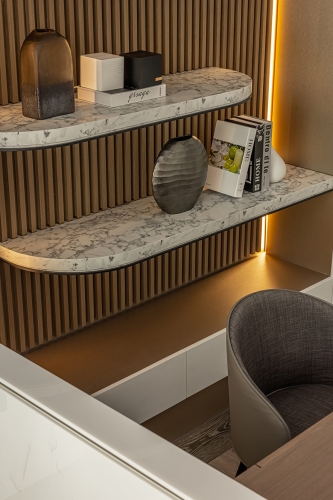 踏進位於市區的辦公室,恍若來到一望無際的海灘既視感,自天、立、地面到家具軟裝,連結隨著浪花翻滾而上的白色原石,且經過歲月層層剝開樸實的外表,顯露出耀眼金色光芒,以及完美的紋理,展演出品牌的天然個性美質。