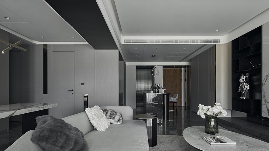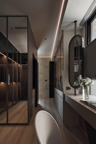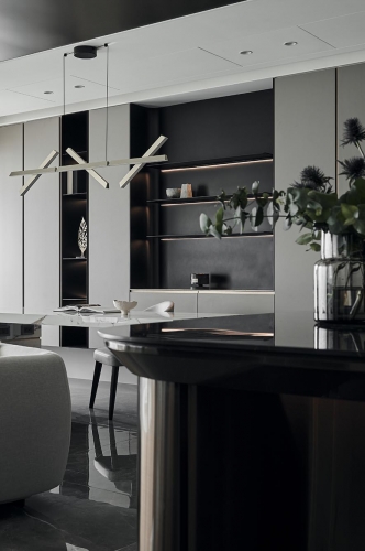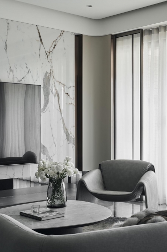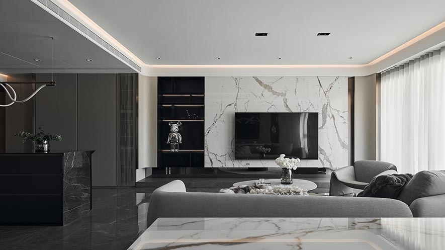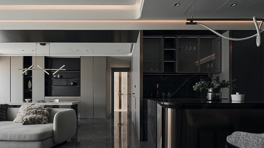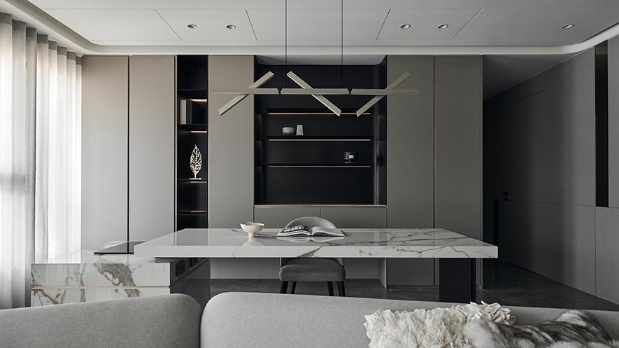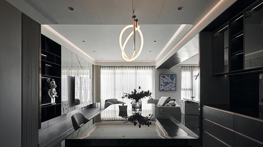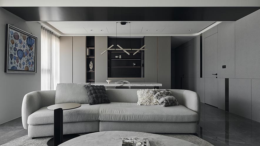 從事房仲業多年的屋主,閱覽無數物件,亦擁有豐富裝修經驗,因此在執行此案時,對設計團隊而言是極大的挑戰。不希望流於大眾普遍風格,且能同時包納接待朋友聚會與直播拍攝等需求,於是在中性色基底下,運用線條比例與異材質搭接,形塑時尚奢雅氛圍,並結合智能家居設定,實現「家如飯店」的住宅體驗。