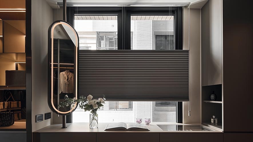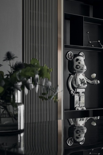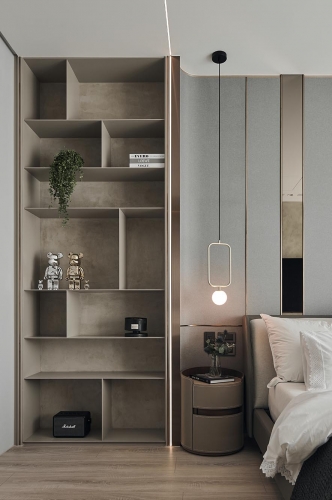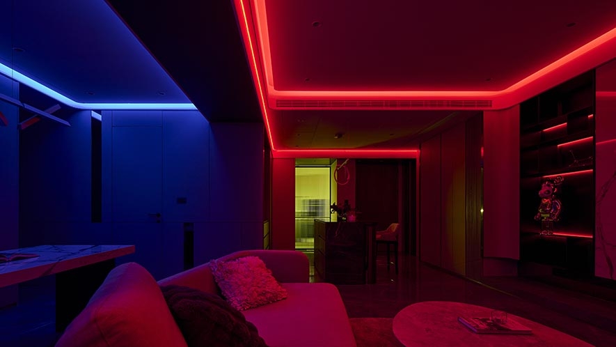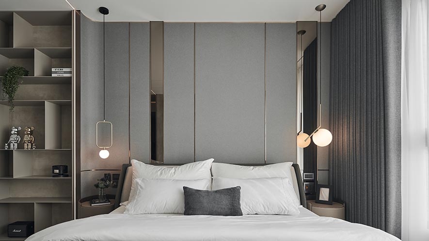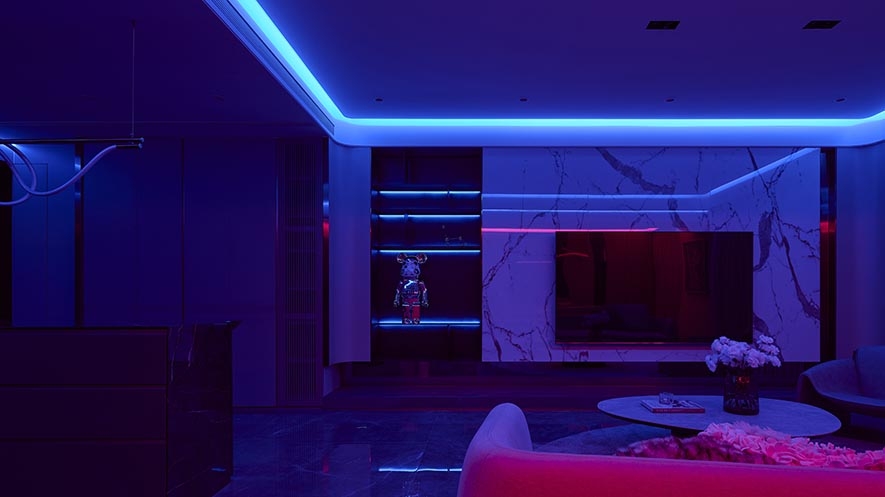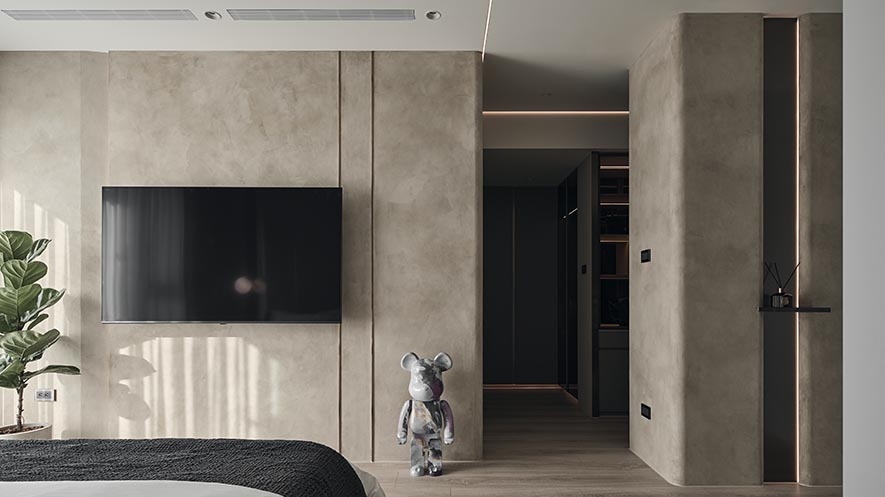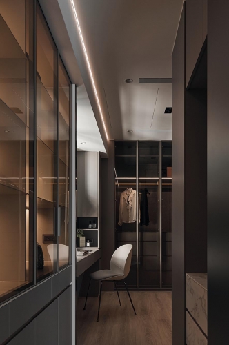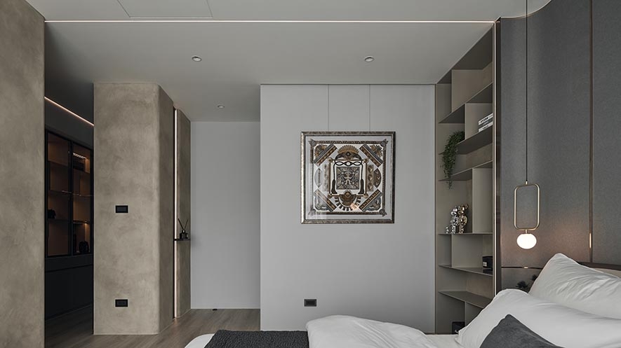 從事房仲業多年的屋主,閱覽無數物件,亦擁有豐富裝修經驗,因此在執行此案時,對設計團隊而言是極大的挑戰。不希望流於大眾普遍風格,且能同時包納接待朋友聚會與直播拍攝等需求,於是在中性色基底下,運用線條比例與異材質搭接,形塑時尚奢雅氛圍,並結合智能家居設定,實現「家如飯店」的住宅體驗。