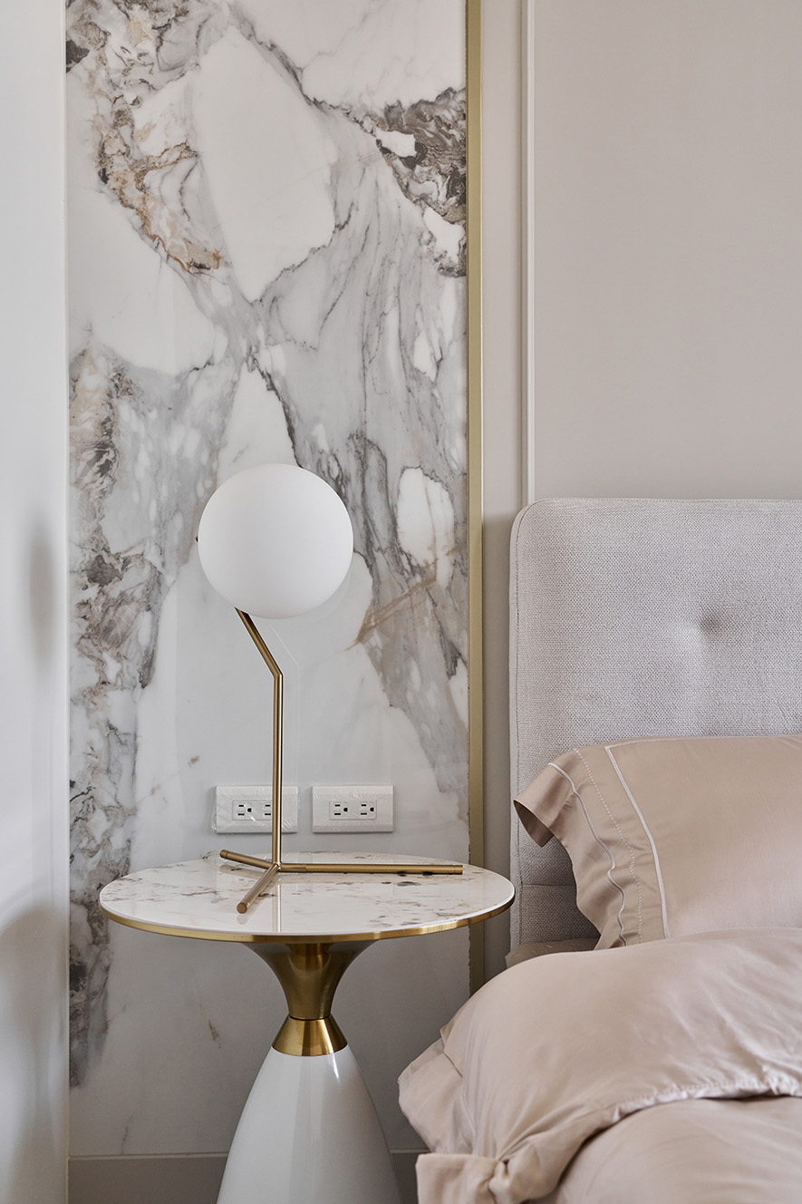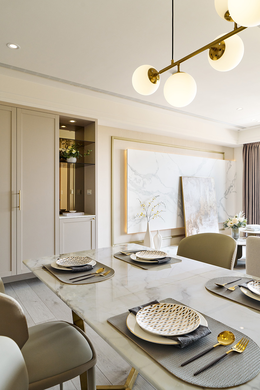 整體風格採新古典設計,運用線板、壁紙與細緻軟裝,營造優雅輕奢氛圍。公領域透過鏡面材質延伸視覺尺度,並適度留白,避免過度填滿,讓空間更顯開闊且保有流動性;收納則整合於中島設計,兼顧機能與動線。