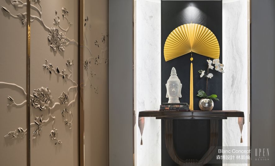 牡丹又名「富貴花」,是國畫中經常描繪的題材,其富麗堂皇姿態,象徵雍容華貴與繁華昌盛。因此設計師特別在家中的門面玄關處,以具現代時尚質感的皮革,刻畫寓含華麗東方語彙的花卉。透過東西合璧及新舊交融的設計巧思,營造清麗典雅的唯美端景。另綴以富含中式內蘊的黃扇,不但具有吉祥意味也有鎮宅作用,與面容慈悲肅穆的純白佛頭,構建出一幅內斂典雅的意象畫。