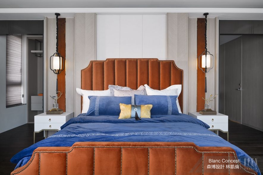 有別於一般淡雅素淨的臥室基調,森博團隊運用搶眼的橘紅彩繪主臥床鋪,挹注如曙光初升般的明亮色彩;並搭佐寶藍色寢具,突顯高貴典雅質感,讓原本平淡沈穩的休憩空間,充滿活力生機。而仔細一看會發現,設計師悄悄將中國傳統元素帶入其中;以傳統屋簷造型刻畫床頭線條,更添尊貴雅韻;同時掛置古典窗花意象的流蘇吊燈,揭開傳統融合現在的「新東方時尚」面紗。