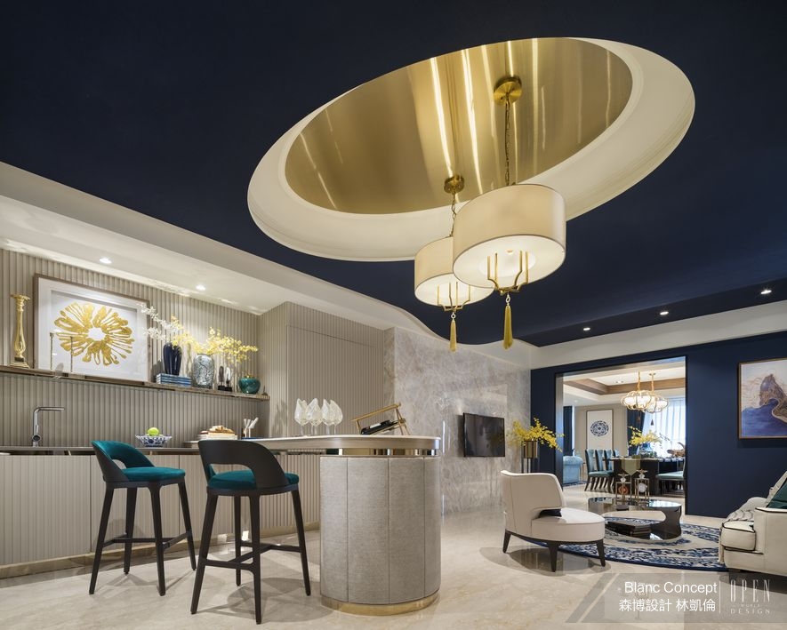隨後步入起居輕吧區,深藍色調的天花板中,鑲入鈦金板穹頂,凝聚環境中的視覺焦點,鋪述出豪宅華麗氣勢。設計師延續客餐廳湛藍調性,給予屋主休閒團聚的私人天地;特別增設兼具上網、閱讀及用餐等機能的多功能吧台桌,愉快的時光就在此起彼落的對話談笑聲中悄悄流逝。