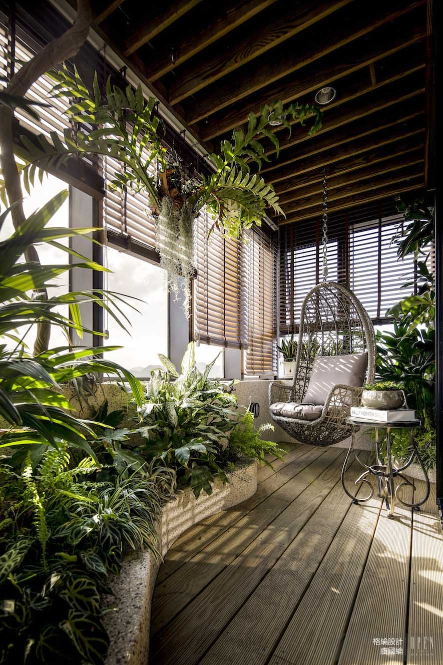 除卻裝設植生牆,通往綠意的捷徑便是「室內花園」,總監懷抱物我相融的設計眼界,於《綠.波》一作中結合溫室概念,試圖拉近高樓大廈和戶外生態的距離,在明確的場域機能劃分中,平衡人性需求與植物生長必要的生存空間。因此,本案中別出心裁地劃設加高陽台,棕木格柵組成的天花板呼應同質斑馬簾,與粗礪木棧板一氣呵成,圍塑出濃郁的田野氣息;更於角落垂懸一只藤編吊椅,滿足使用者被森林環繞的沉浸式想像。有樹的地方就有水,公領域則抽取水域意象,立面鑲嵌水草漫漫的魚缸,天花板則置入流線型層板,營造出不言自喻的共生美景。